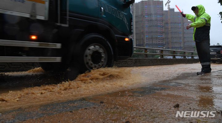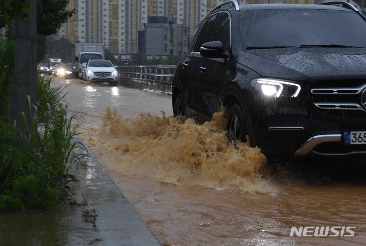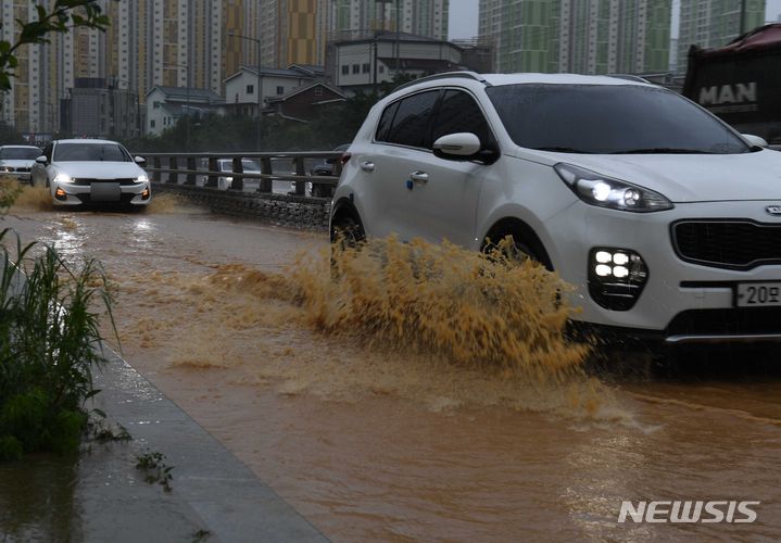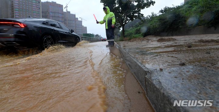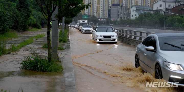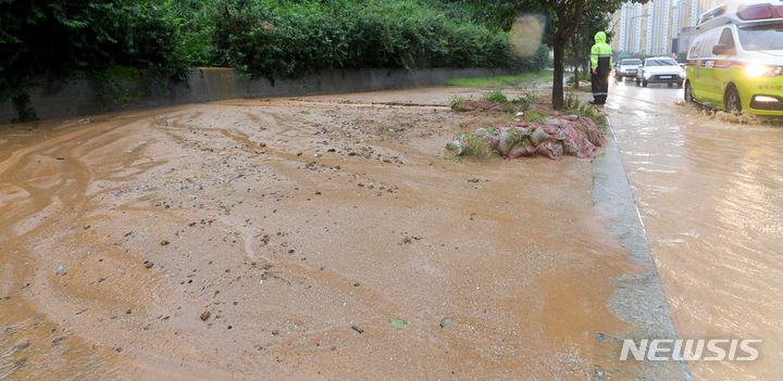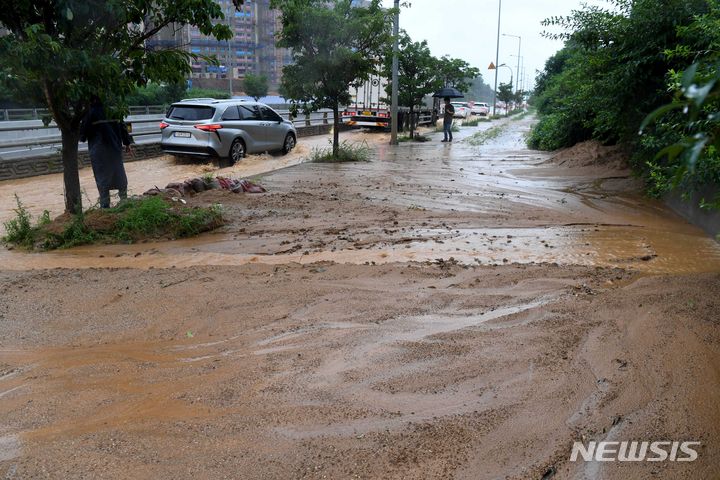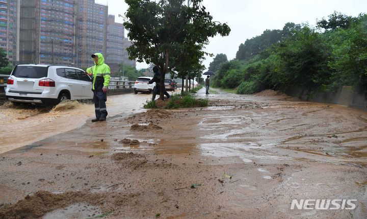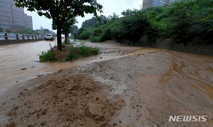 大雨が降った14日午前、光州市北区臣竜洞の臣竜地下車道横を走る1車線道路(北光州インターチェンジ方面)に、近くの斜面から土砂が流れ込み、泥水に浸かっている様子。