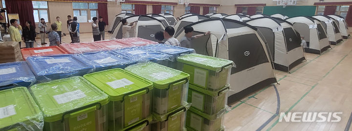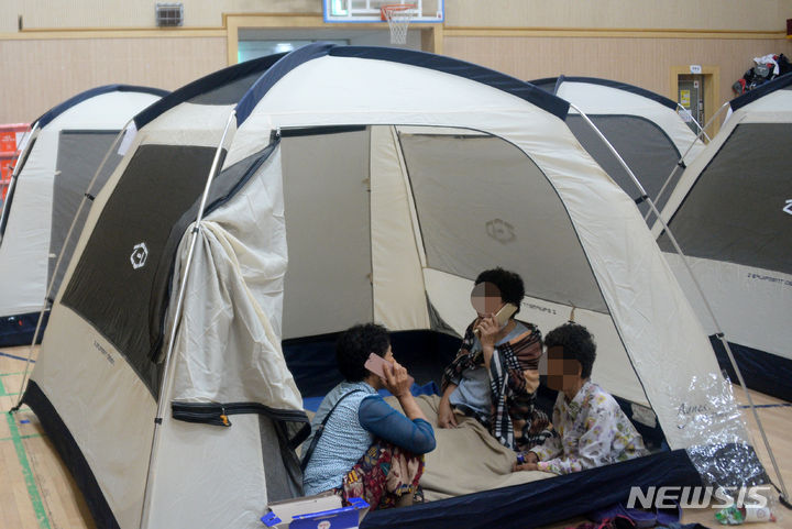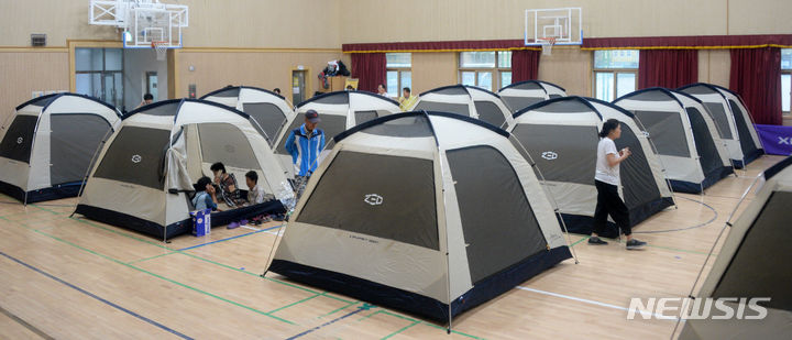 全羅北道の大部分の地域に大雨警報が発令された14日、全羅北道全州市の竜巣中学校にチンギ村の住民たちのための避難所が設けられた。