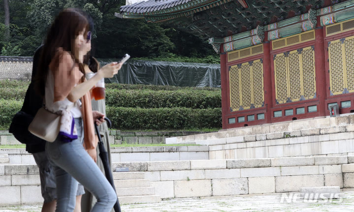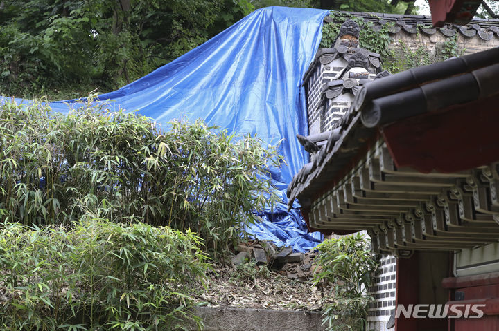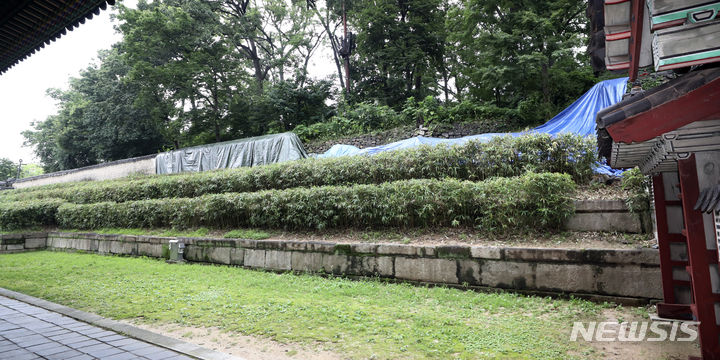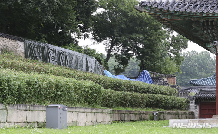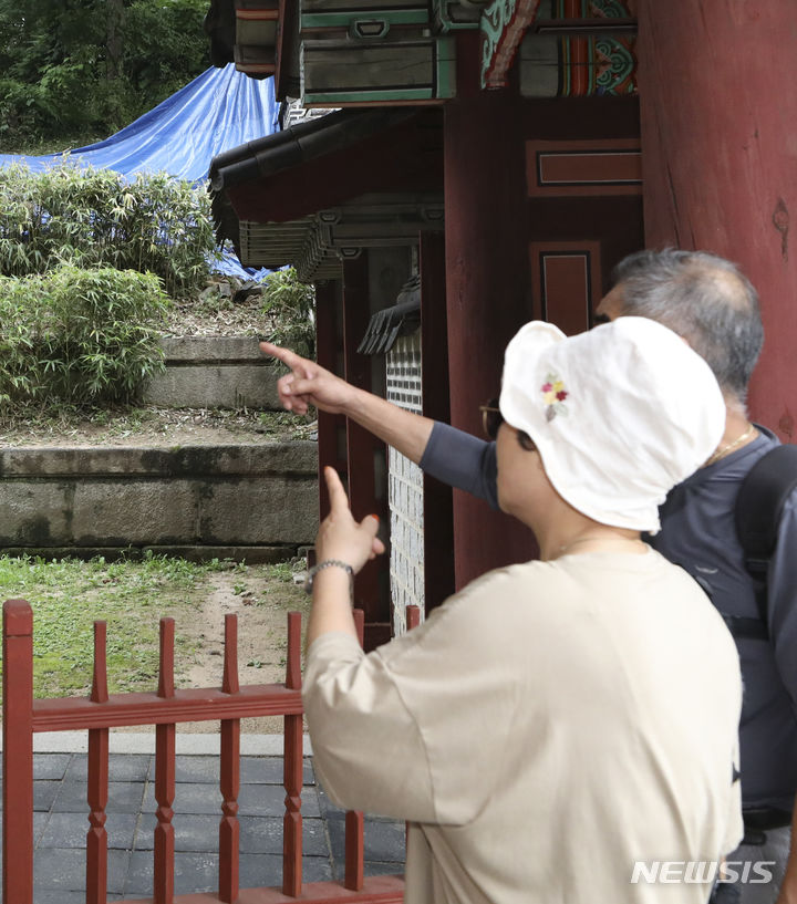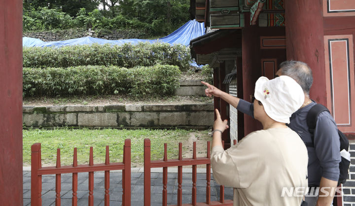 【NEWSIS】16日、ソウル市鍾路区の昌徳宮を訪れた観光客。集中豪雨で流失した仁政殿の裏手にある階段式花壇「花階」の塀を見ている。豪雨続きで、花渓の塀は約15メートルにわたり崩れ落ちた。