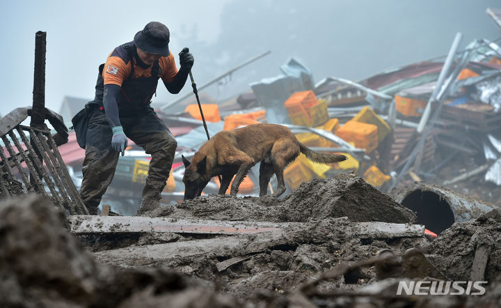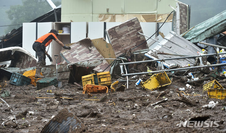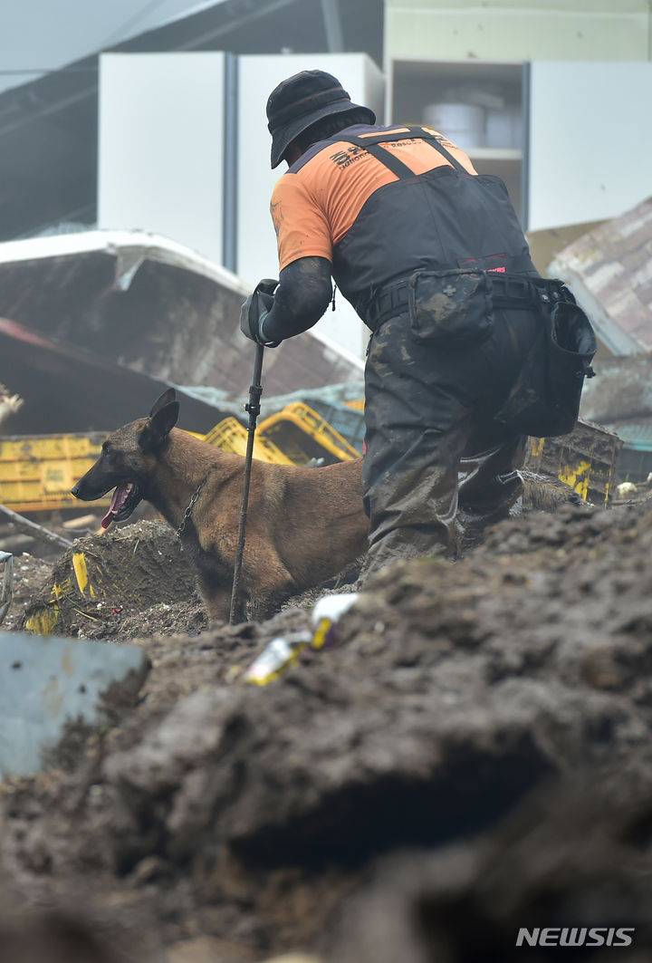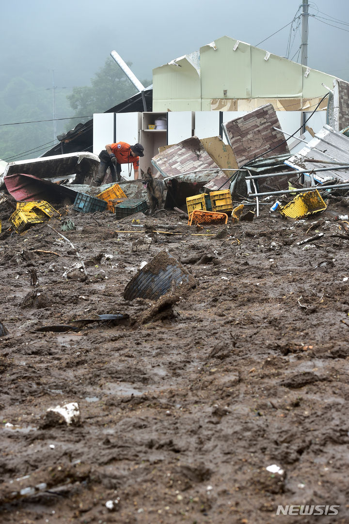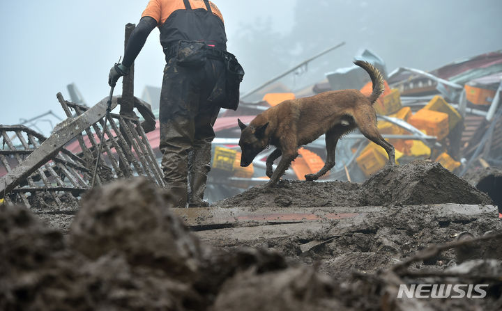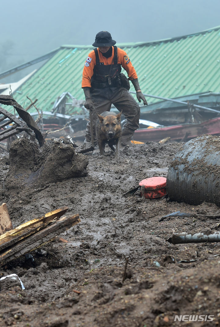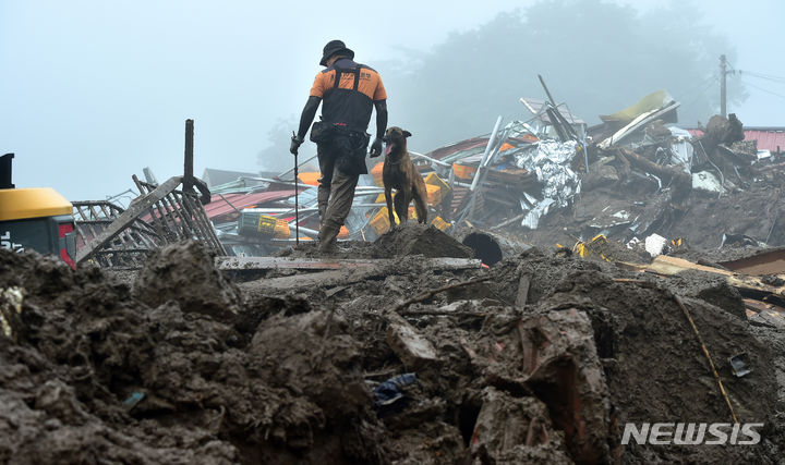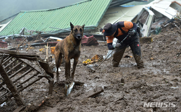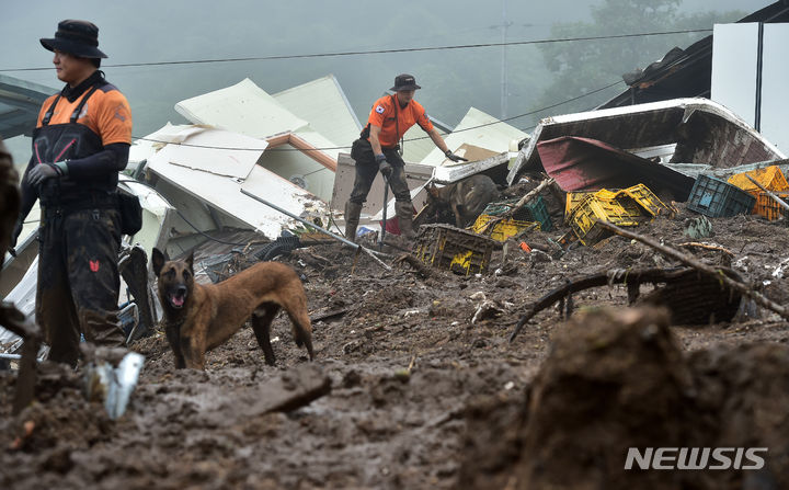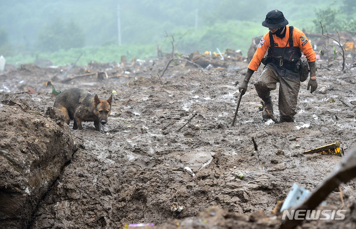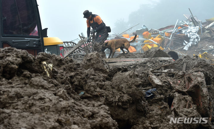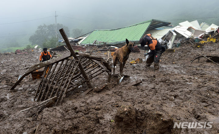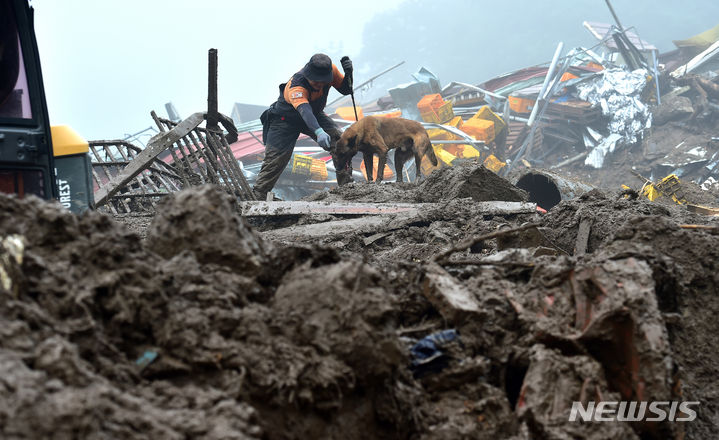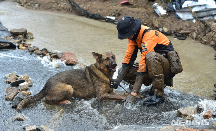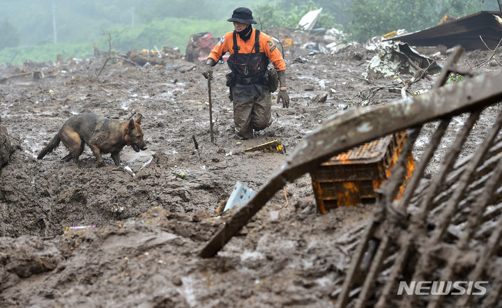 【NEWSIS】16日午前、慶尚北道醴泉郡内の村で、集中豪雨による土砂崩れが発生して行方不明になった人の捜索活動にあたる救助隊員と捜索犬。