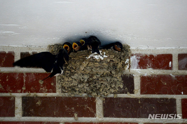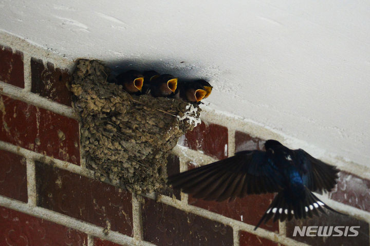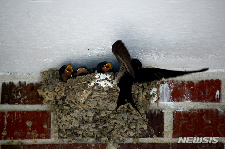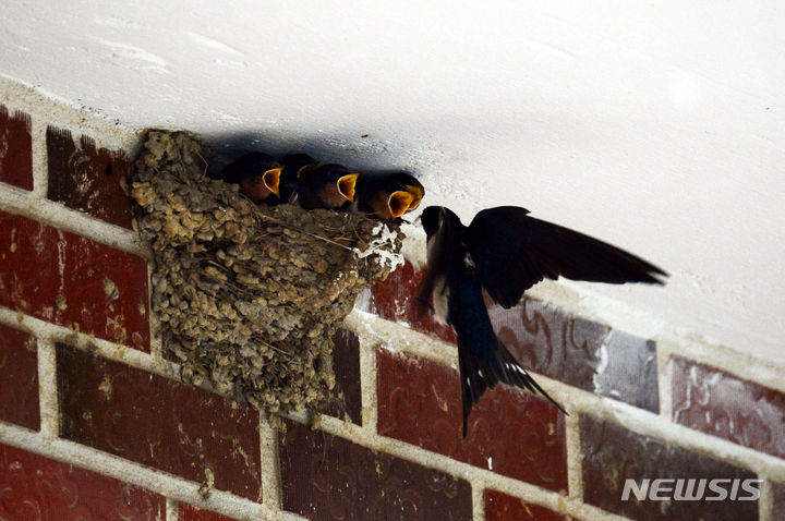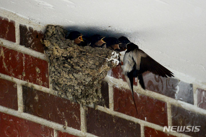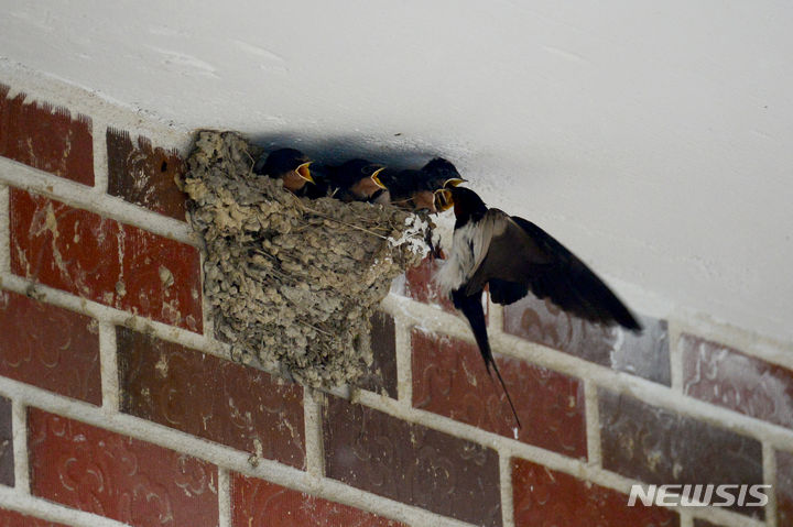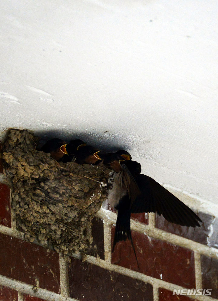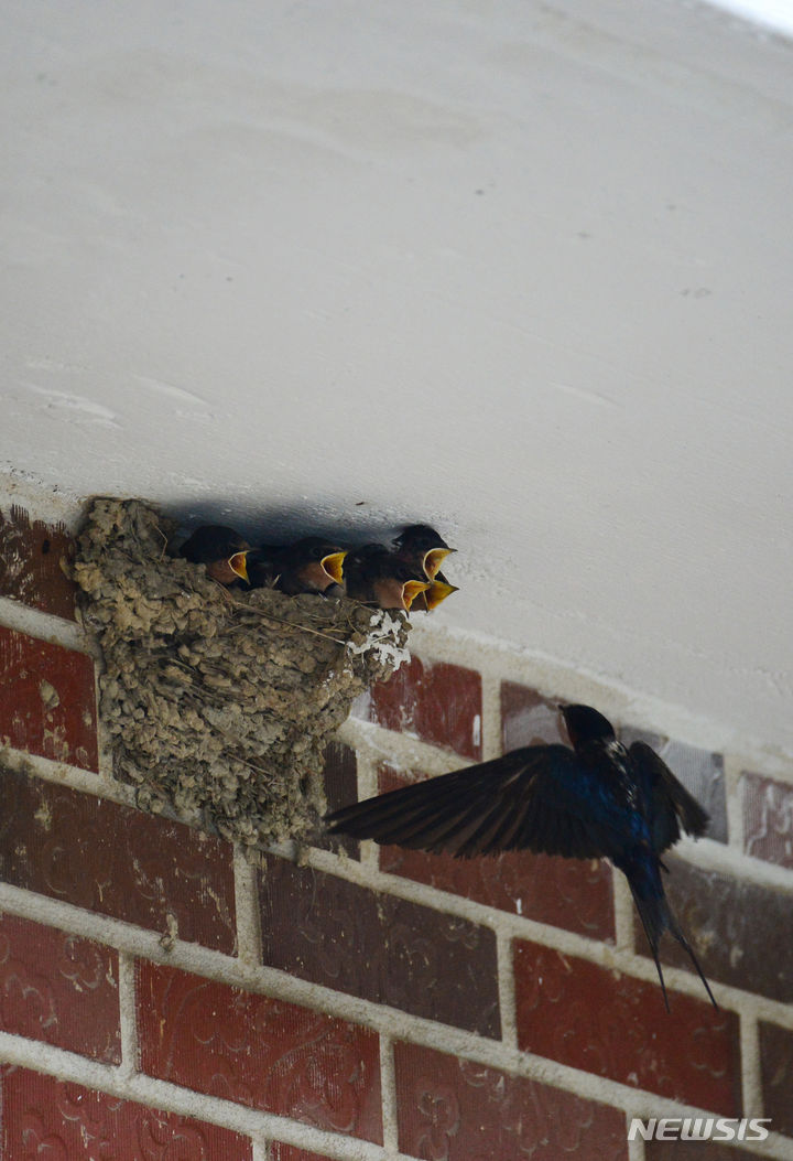 雨が降っている18日午前、慶尚南道南海郡南海邑の住宅の軒に巣をつくったツバメが、すっかり大きくなったヒナたちに一生懸命にえさを運んで食べさせていた。
