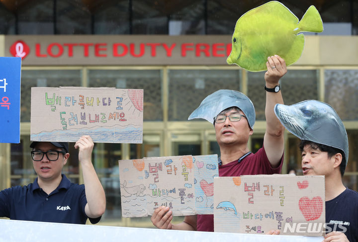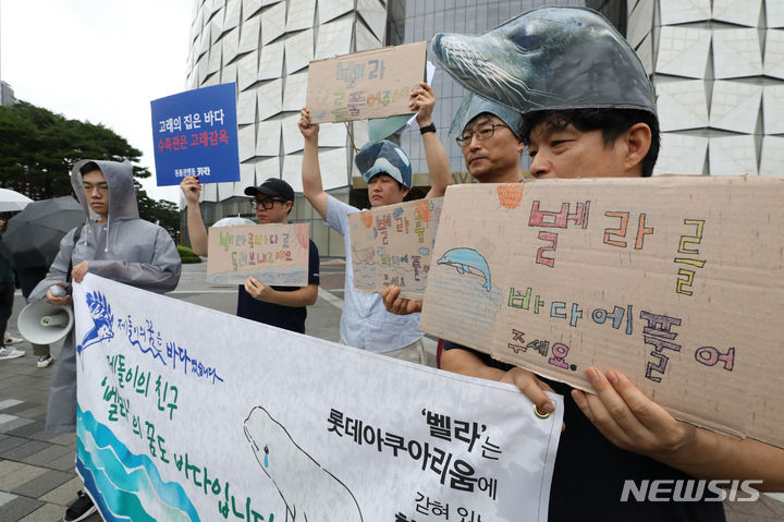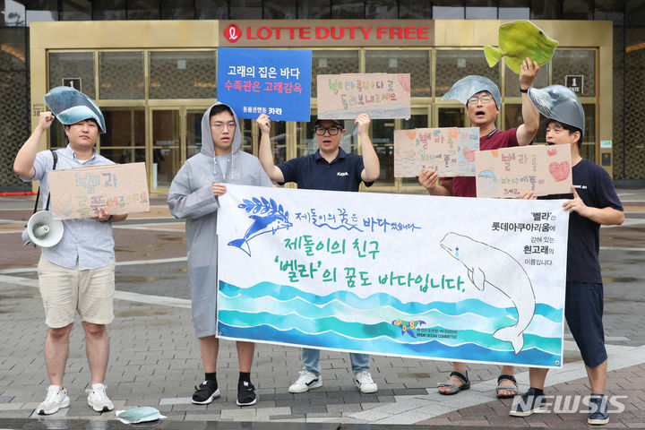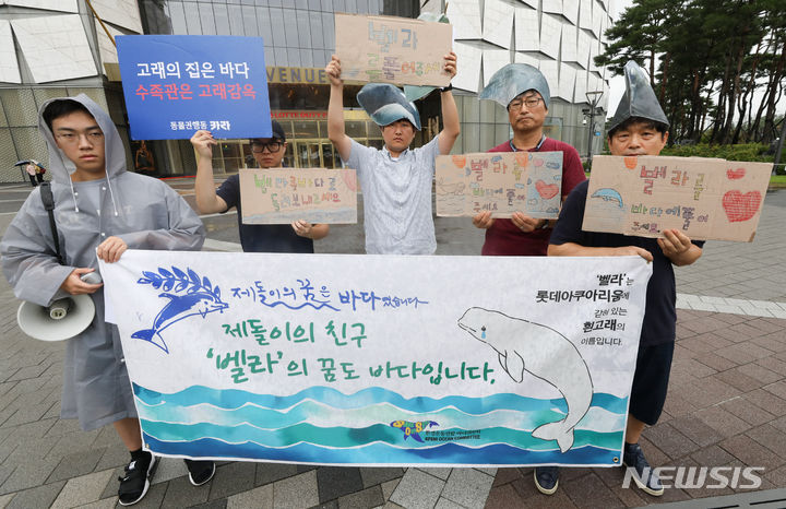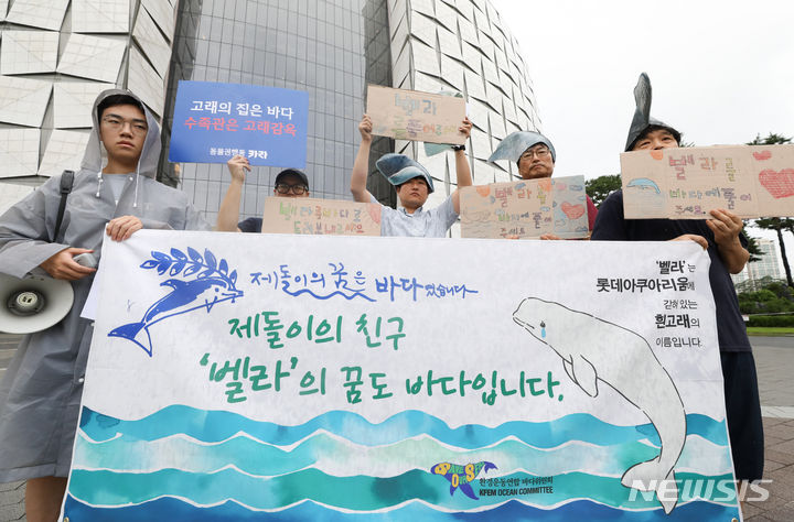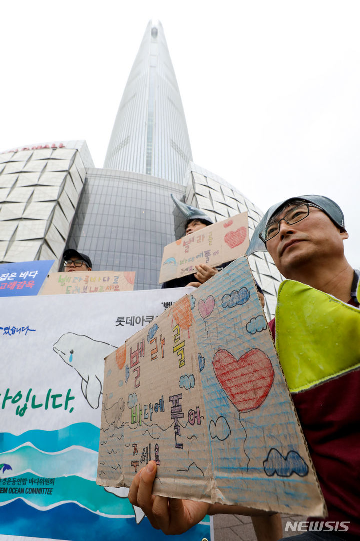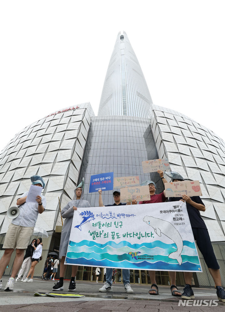 18日午後、ソウル市松坡区のロッテワールドタワー前で、環境保健市民センターなど環境団体のメンバーらが、ミナミバンドウイルカ「チェドル」の放流10周年に合わせて水族館のイルカの放流を求める記者会見を行っている様子。