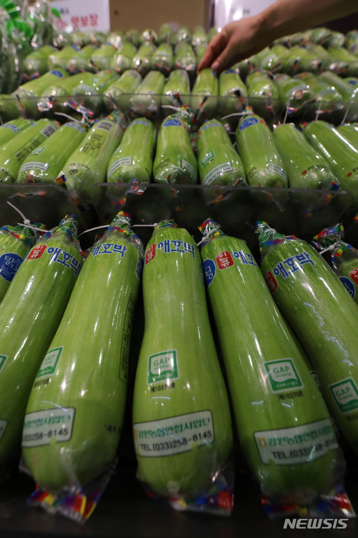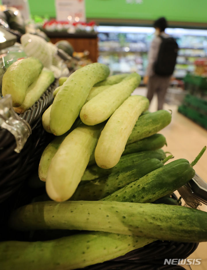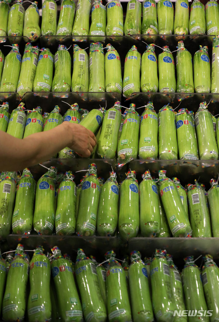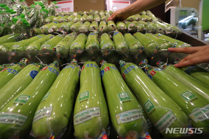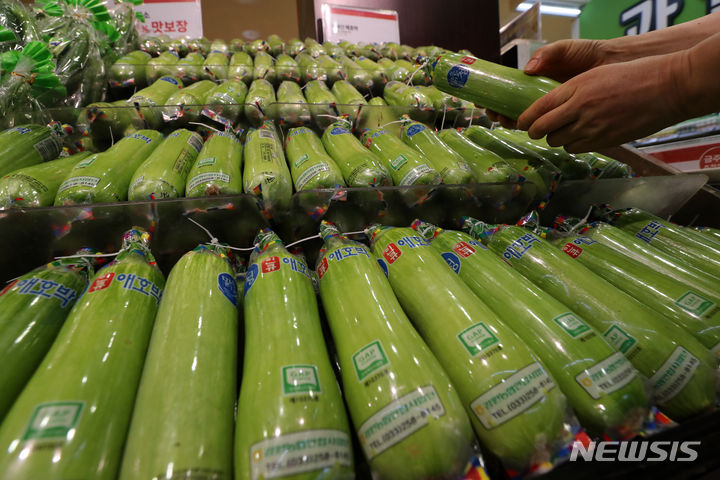 過去最大級の集中豪雨で農産物の被害が拡大し、価格も高騰している。韓国農水産食品流通公社農産物流通情報(KAMIS)によると、17日のズッキーニの卸売価格は50個基準で2万4460ウォン(約2685円)、前日(1万4980ウォン=約1644円)に比べ63.3%上昇し、キュウリ(37.0%)、サニーレタス(35.4%)、ホウレンソウ(20.1%)なども次々と価格が上がっている。写真は18日午前、ソウル市内の大手スーパーで消費者がズッキーニを購入する様子。