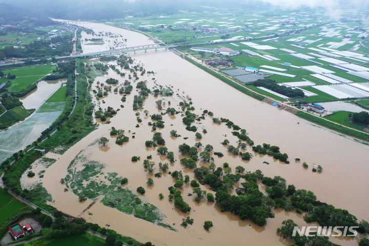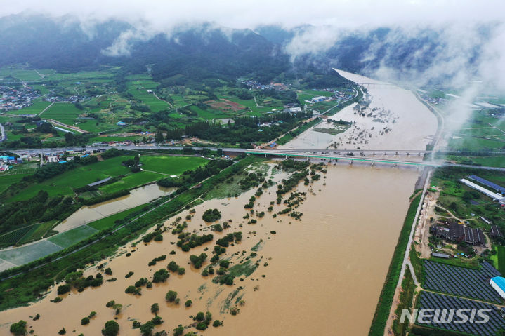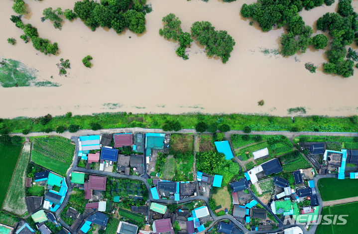 18日午前、全羅南道谷城郡の蟾津江下流域で、増水した川の水が堤防を挟んで集落に迫りつつある様子。洪水注意報が発令されている蟾津江の金谷橋の、同日午前11時現在における水位は5.3メートルで、警報切り替えまでわずか1.7メートルを残すのみとなっている。