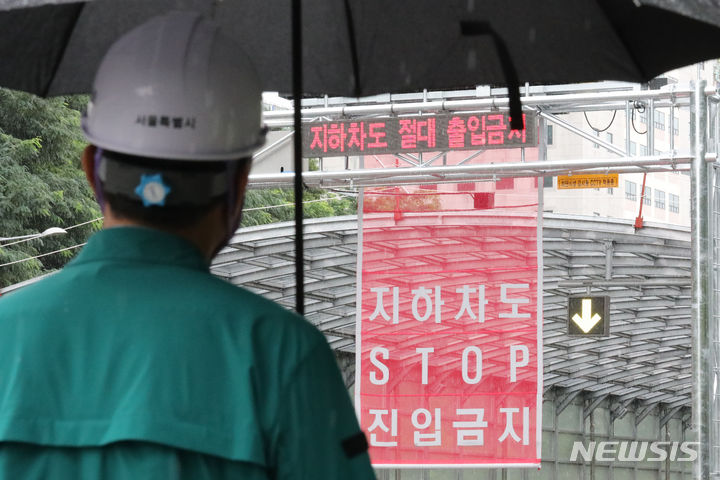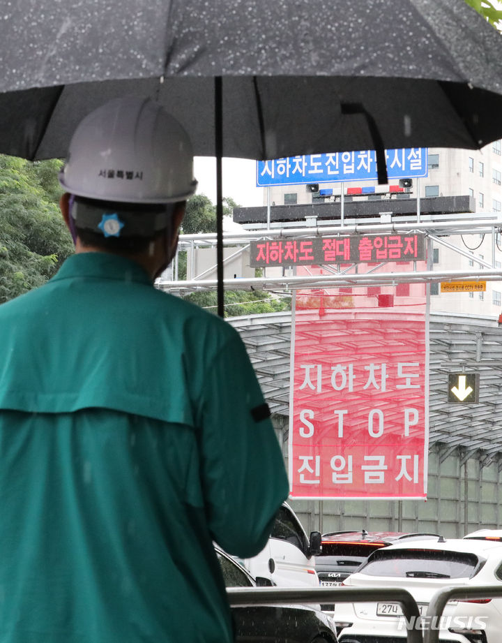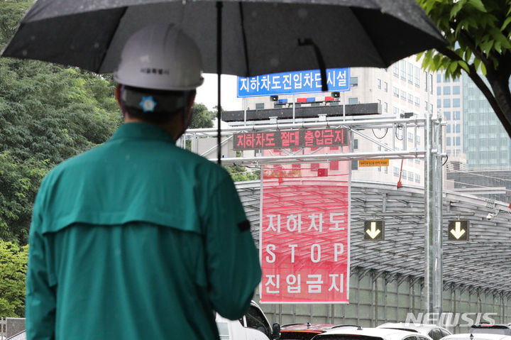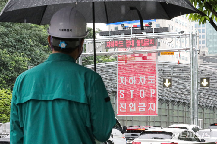【NEWSIS】ソウル市瑞草区の廉谷洞西地下車道で18日午後、集中豪雨の際に車が進入できないようにする設備の作動テストが行われた。