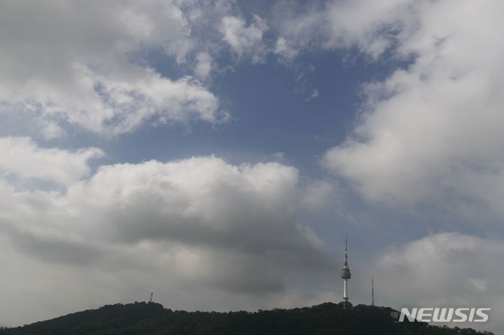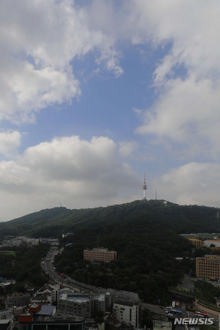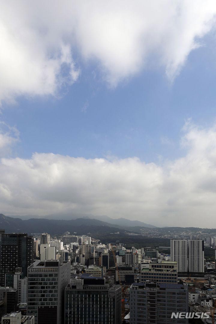 【NEWSIS】韓国中部地方の梅雨が小康状態になった19日、ソウル中心部・忠武路の上空には雲の合間から青い空が見えた。気象庁は今週末ごろ、再び梅雨前線の影響で全国的に大雨になると予報している。