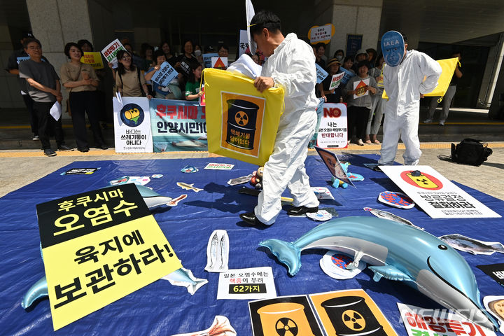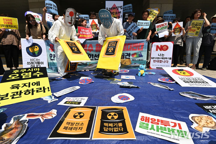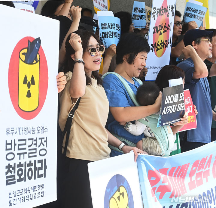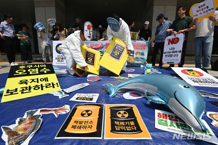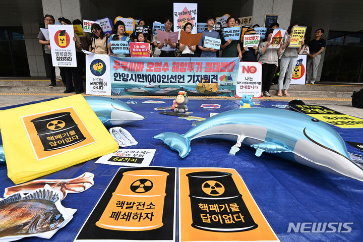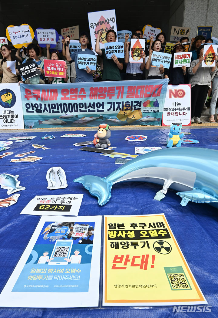 安養市民社会団体連帯会議のメンバーが19日、京畿道安養市庁で開いた日本放射性汚染水海洋投棄阻止のための安養市民1000人宣言記者会見で、スローガンを叫んでいる。