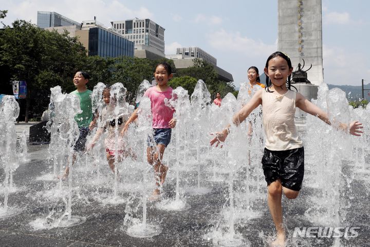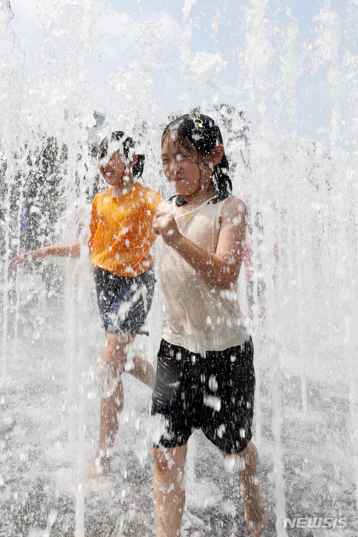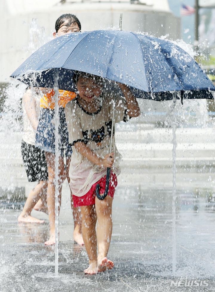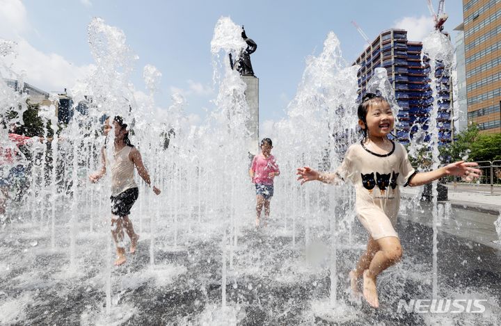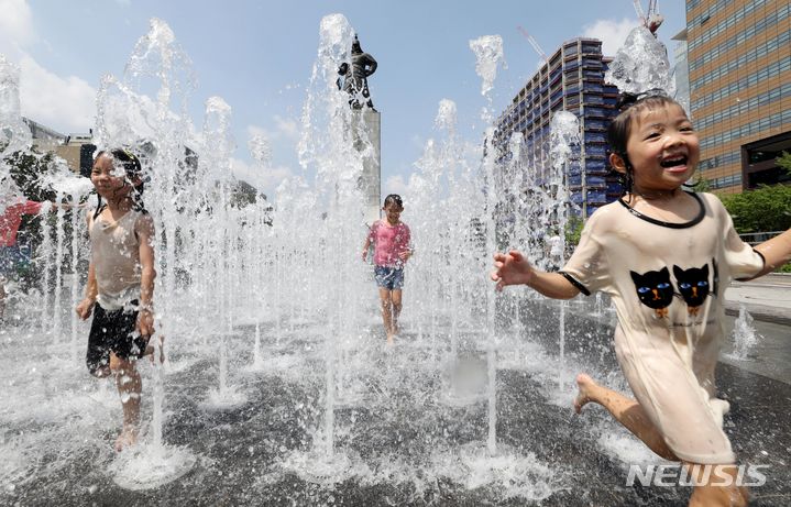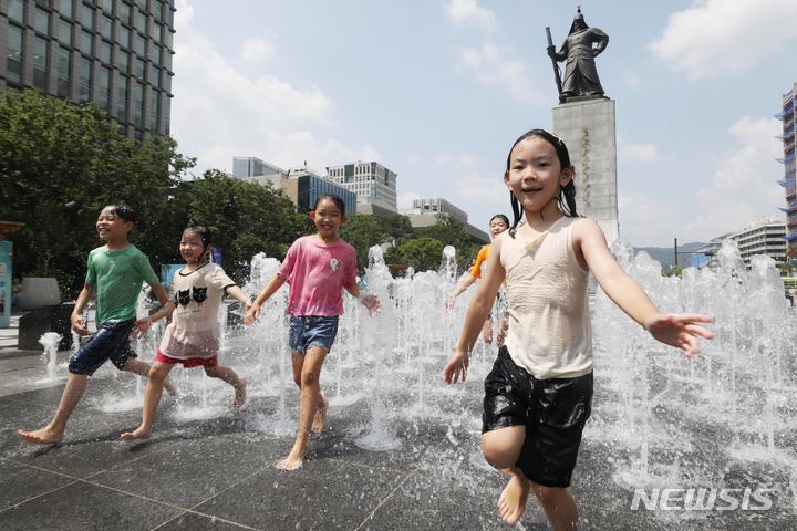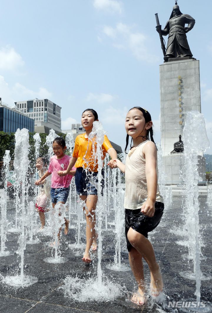 ソウルをはじめ韓国のほとんどの地域に猛暑注意報が発令された19日午後、ソウル市鍾路区の李舜臣(イ・スンシン)銅像前の噴水台では、子どもたちが暑さを避けて水遊びをしていた。