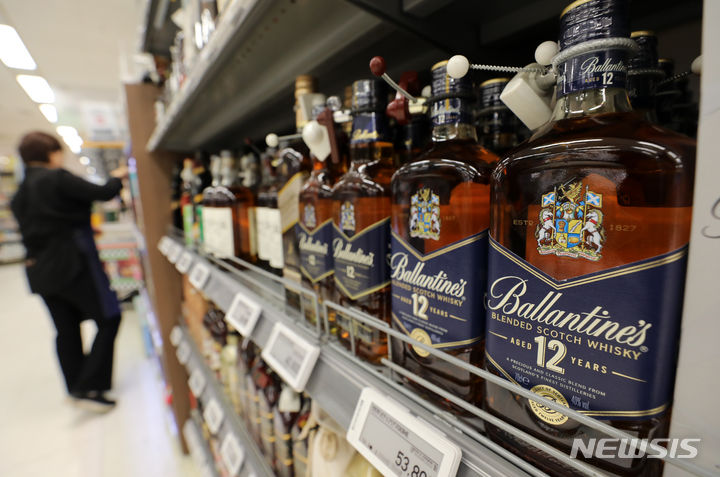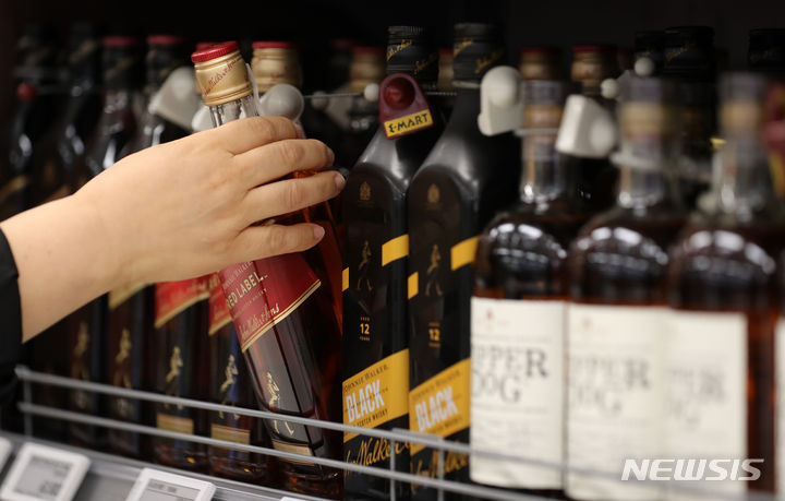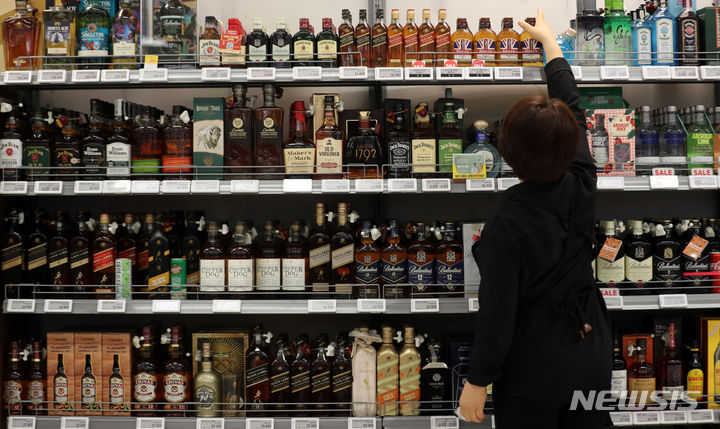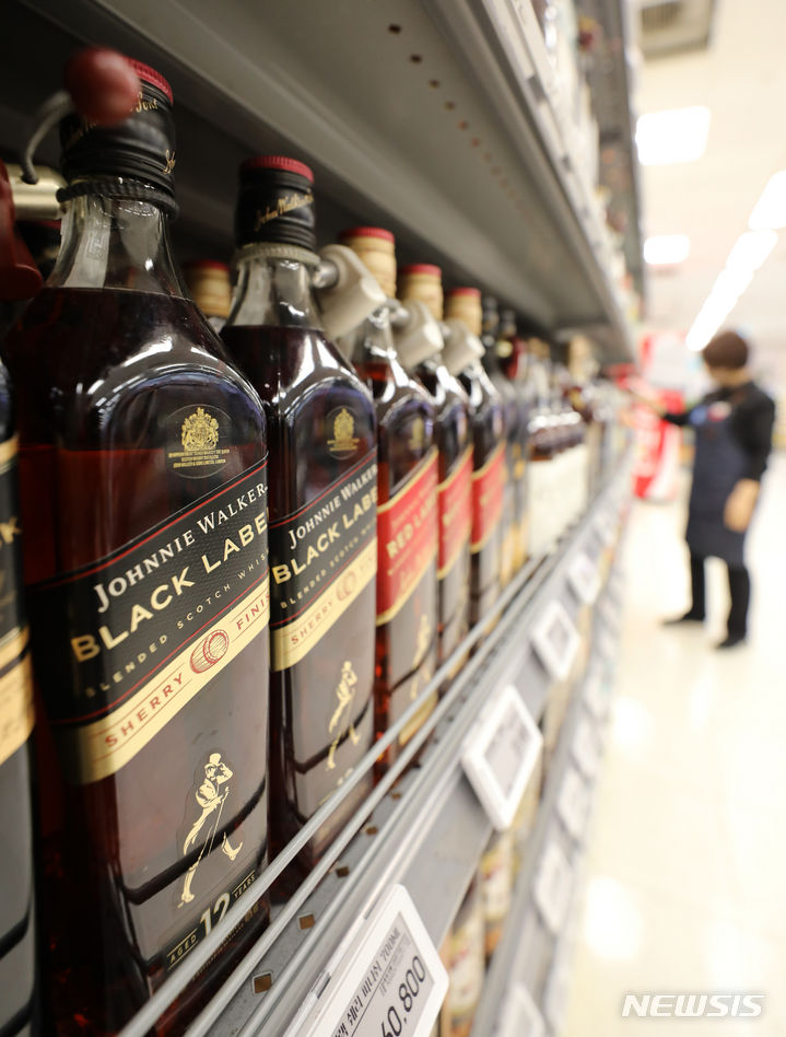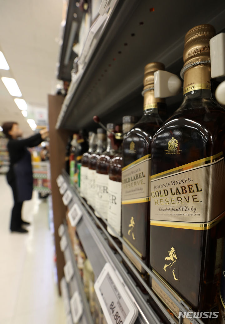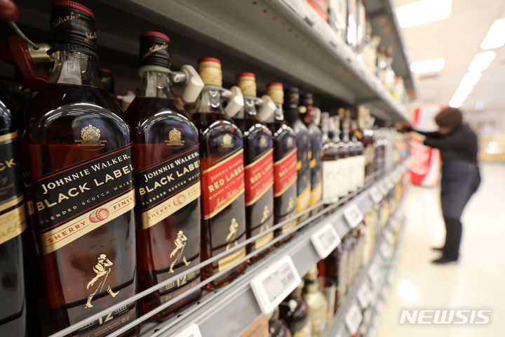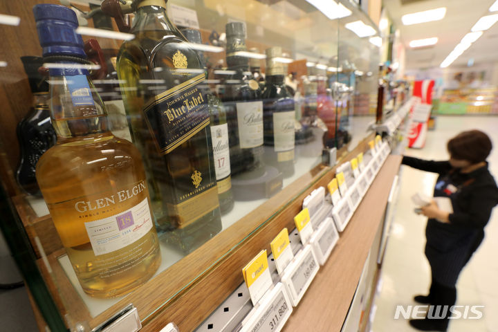 19日、関税庁貿易統計によると、今年上半期のウイスキー類輸入量は1万6900トンで、前年同期に比べ50.9%増加し、史上最高を記録した。写真は19日午前、ソウル市内の大型スーパーに陳列されているウイスキーの様子。