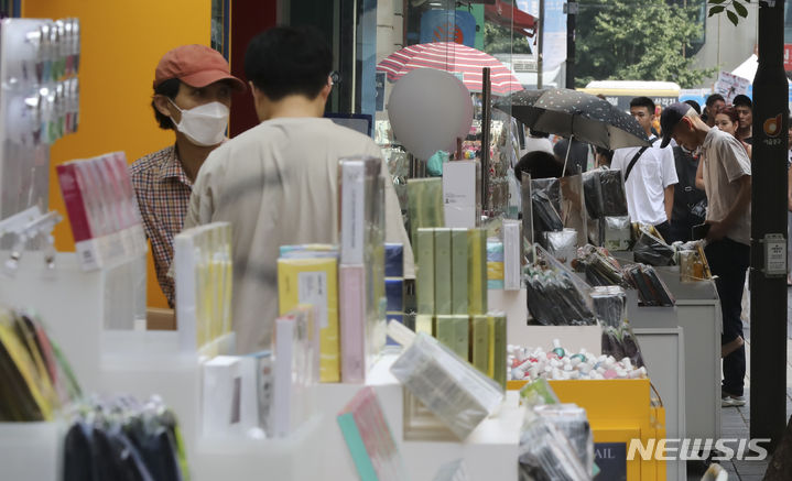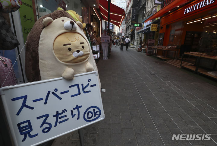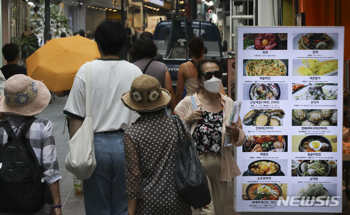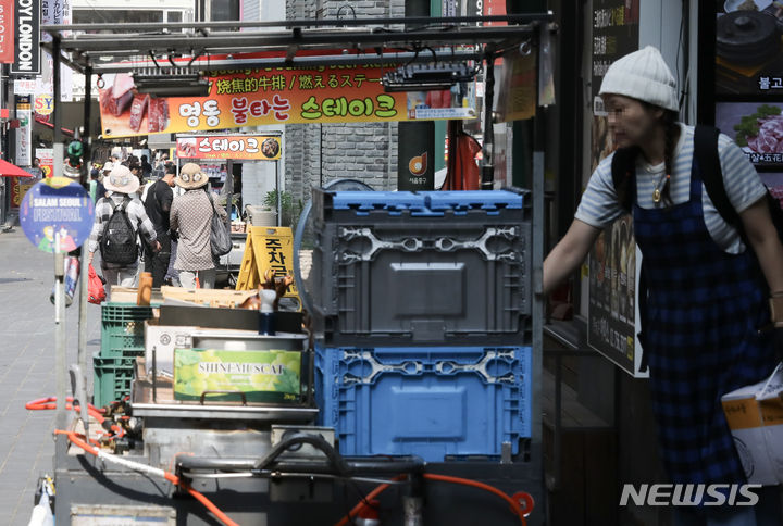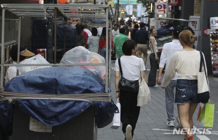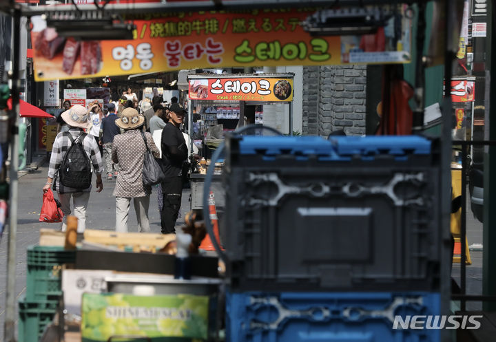 20日、ソウル市中区明洞の通り観光を楽しむ人々の様子。中区は、明洞全域で価格義務表示制を施行し、違法な立て看板や掲示物を整理する内容を有する「明洞観光改善総合計画」を19日に発表した。