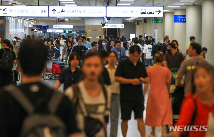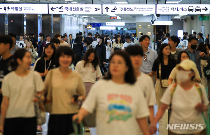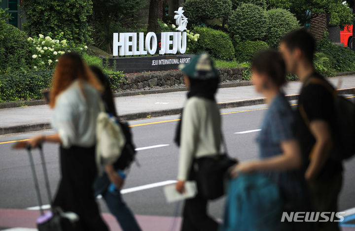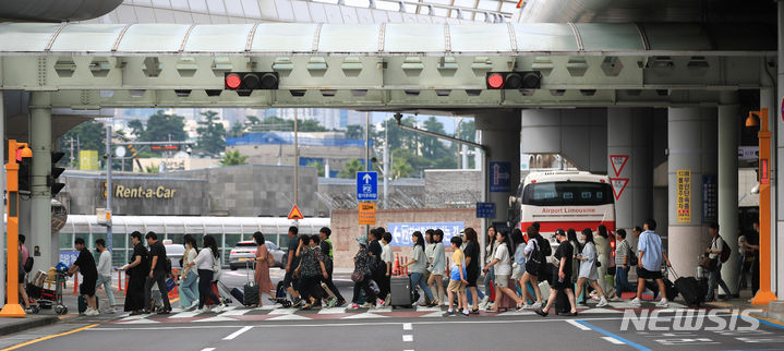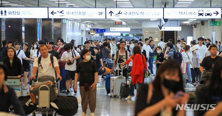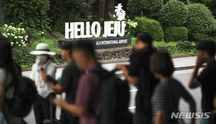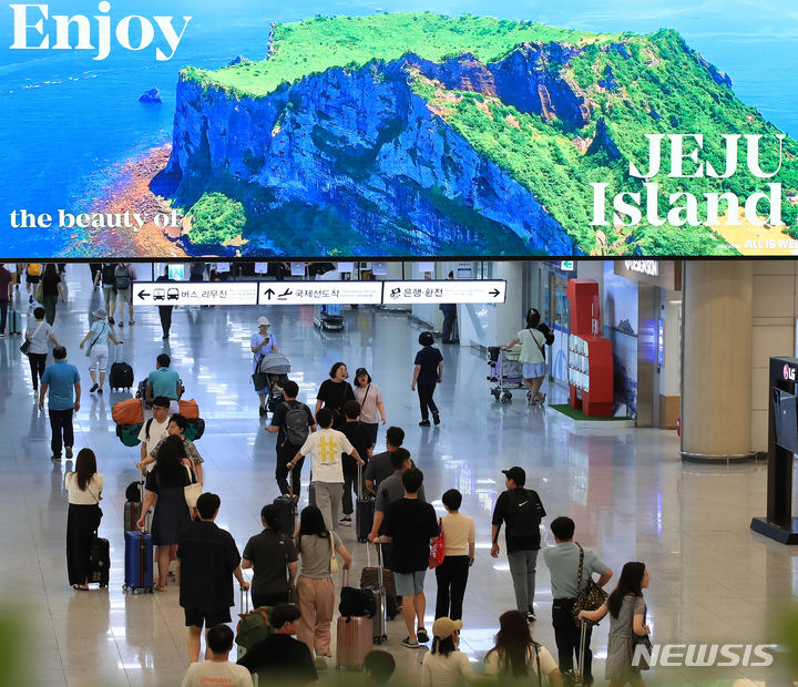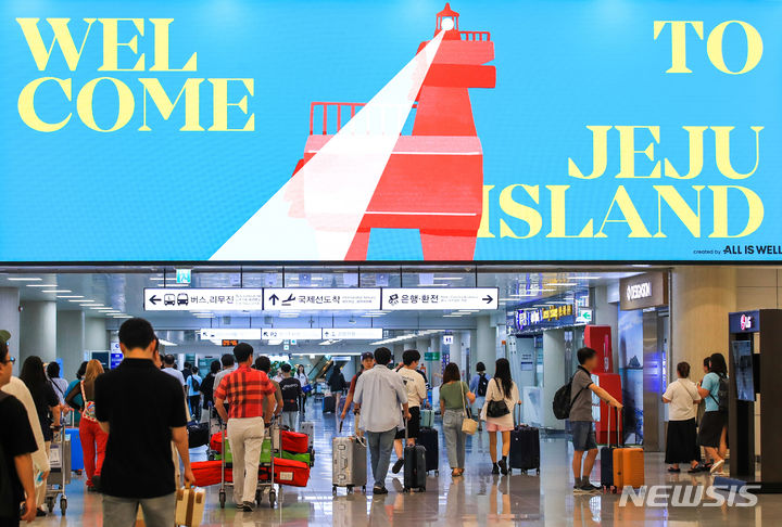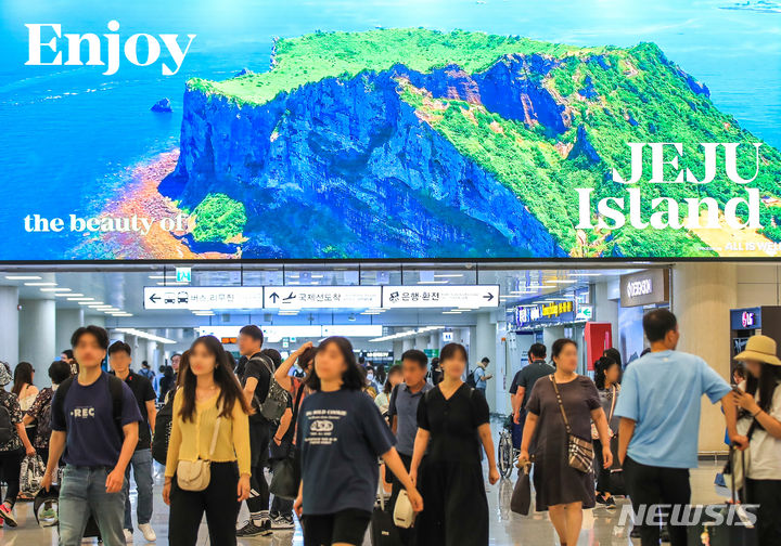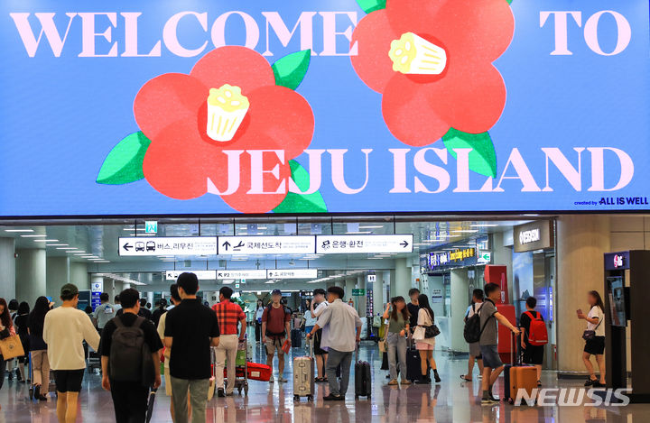本格的な夏の休暇シーズンを迎え、済州国際空港1階の到着ロビーは21日午前、観光客らで混雑していた。