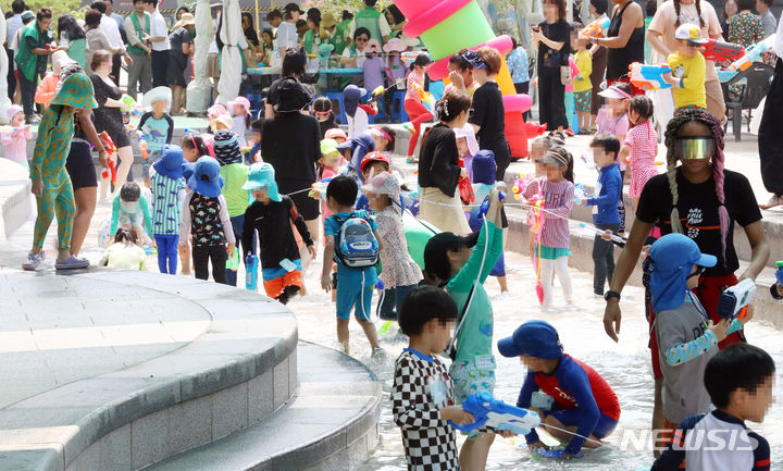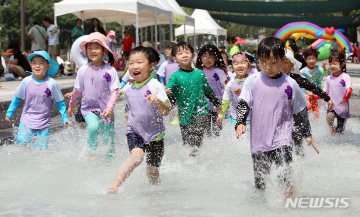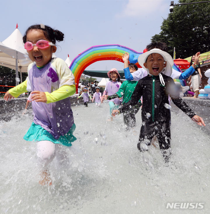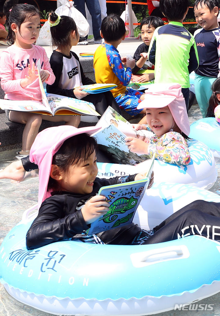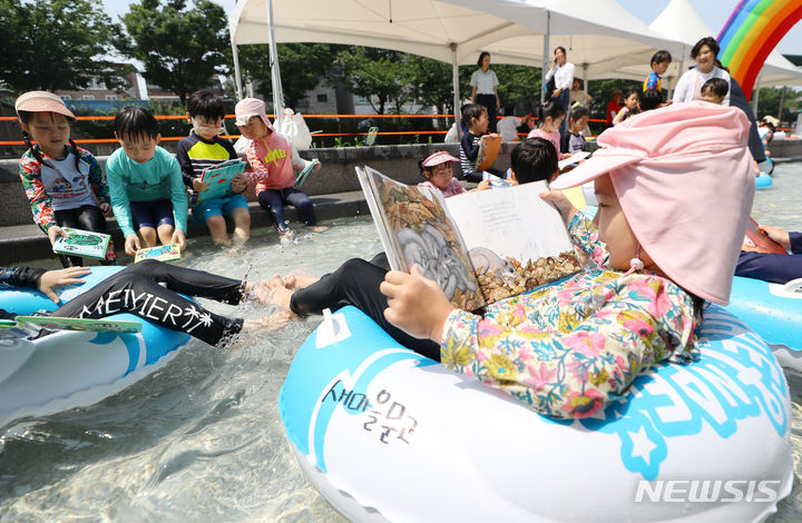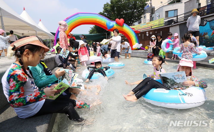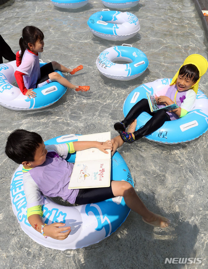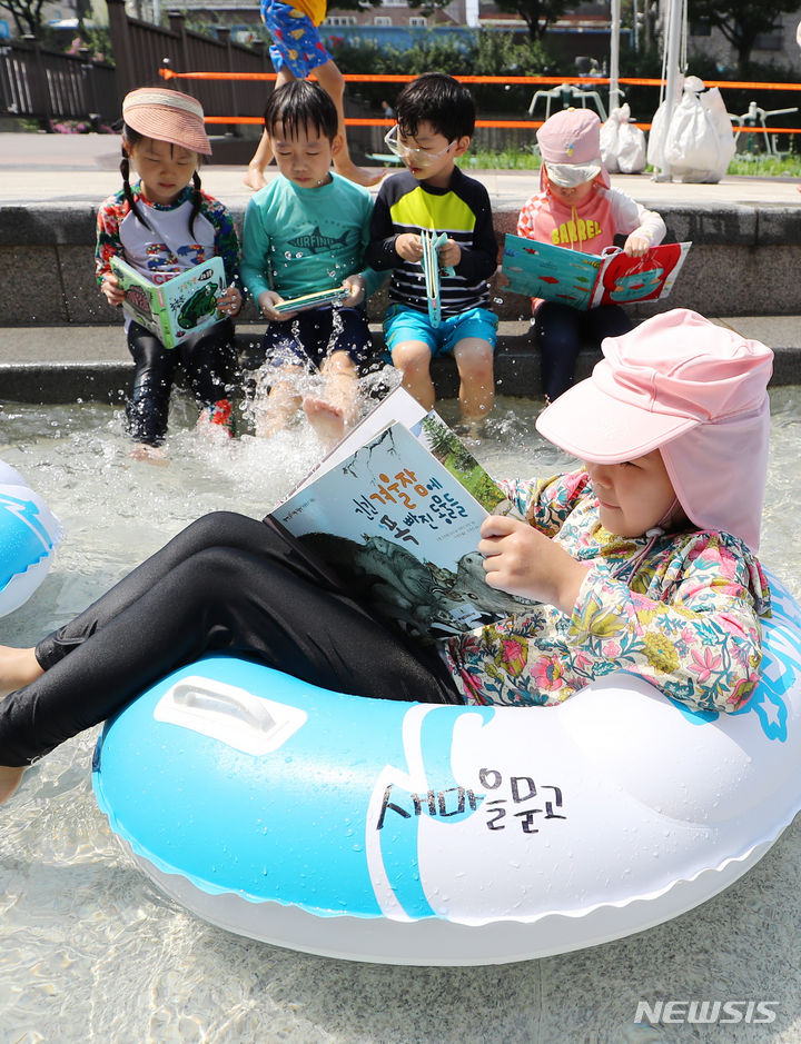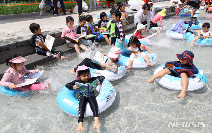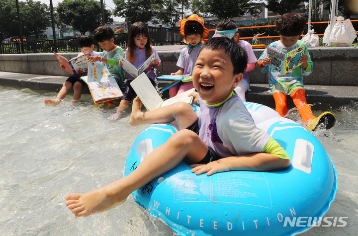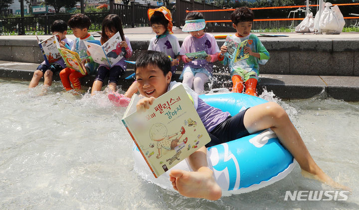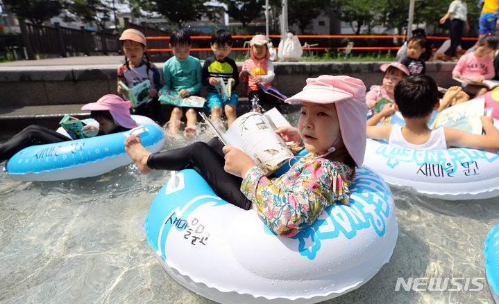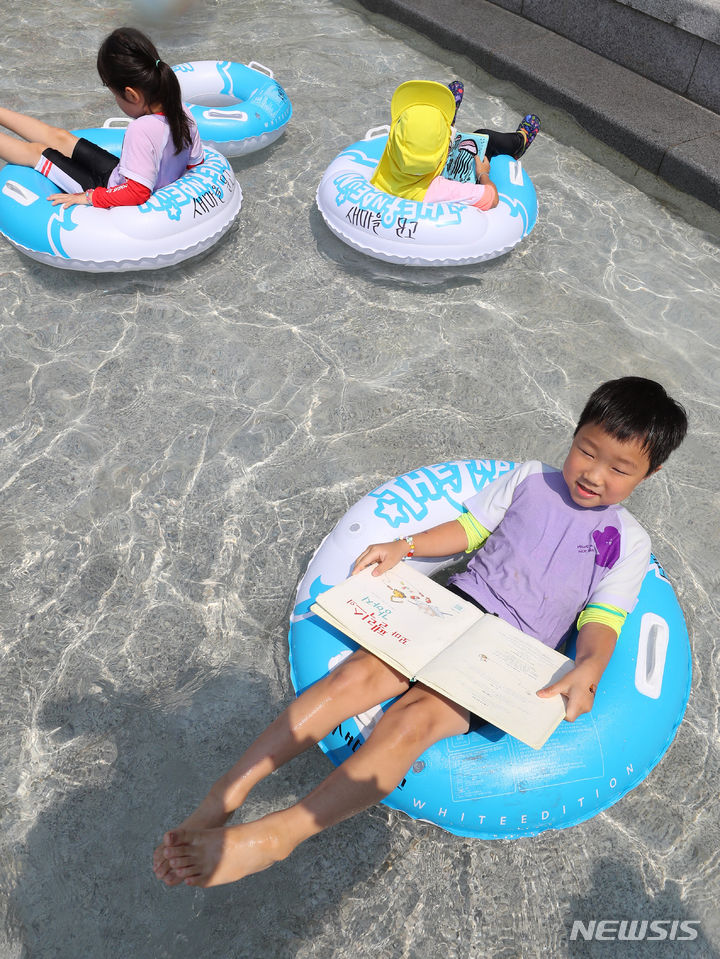 韓国の暦で最も暑い時期とされる「三伏」の一つ「中伏」を迎えた21日、ソウル市松坡区の城内川水遊び場を訪れた子どもたちが、本を読みながら水遊びを楽しんでいる様子。松坡区は、この日から23日まで、城内川水遊び場で「ハハホホ 一緒にに楽しむBOOK遊び場」を午前10時から午後5時まで開催する。
