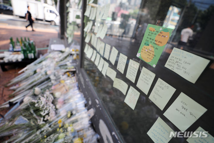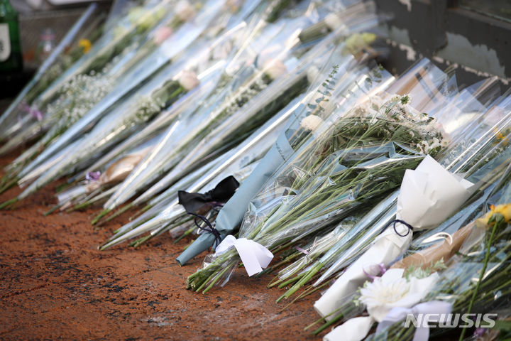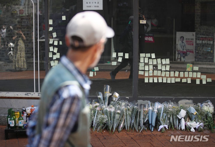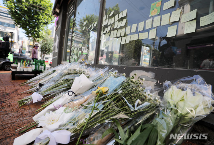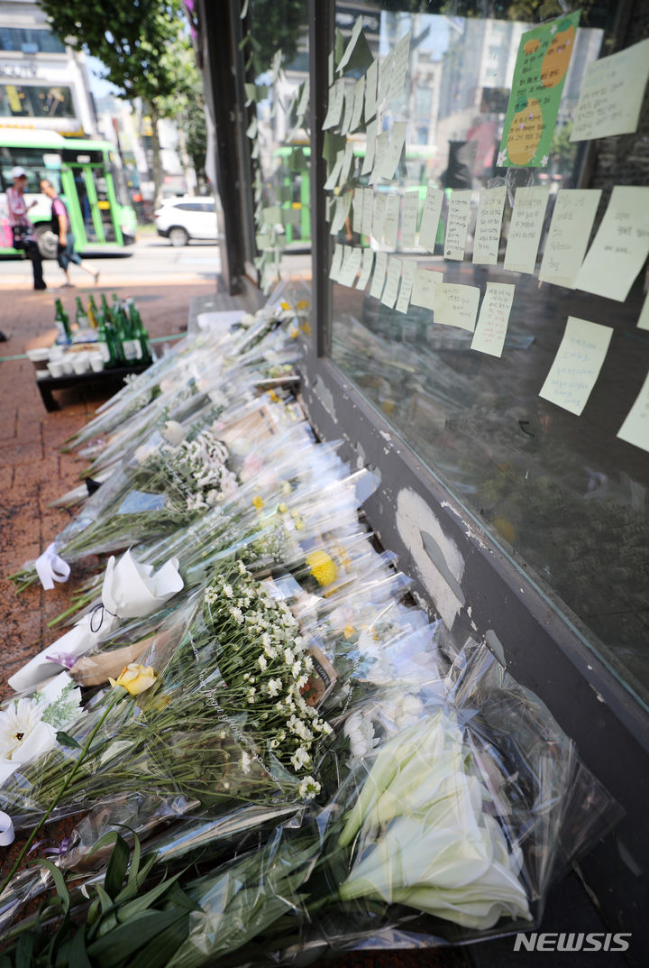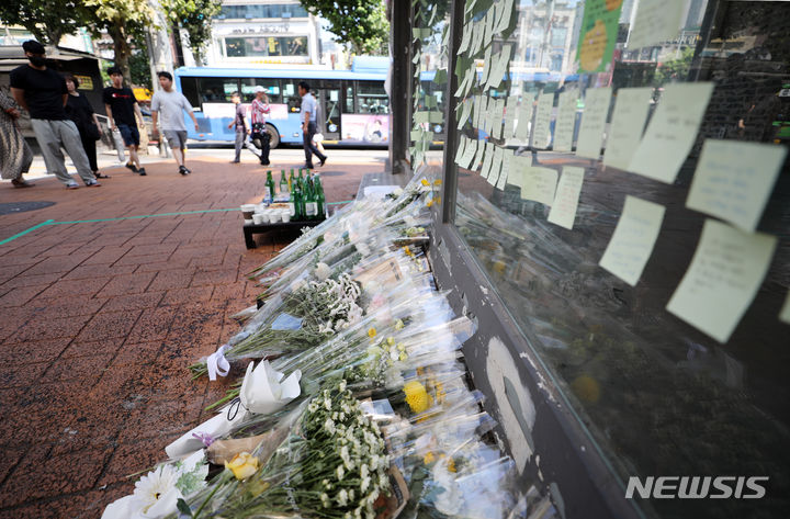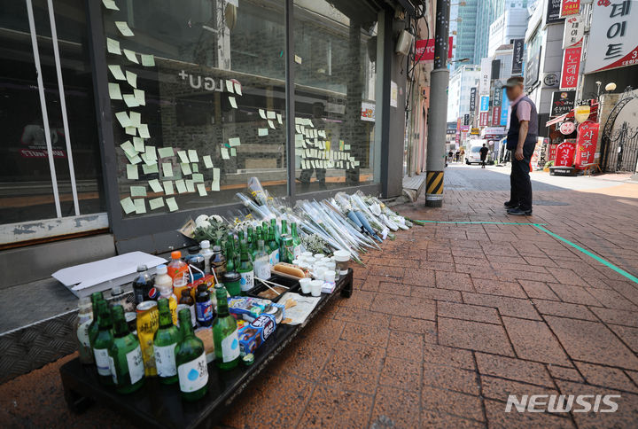 今月21日、ソウル地下鉄新林駅付近の商店街の路地で、30代の男性が通行人を凶器で襲い、1人が死亡、3人が重傷を負う通り魔事件が発生した。写真は22日、犯行現場に設けられた追悼空間の様子。