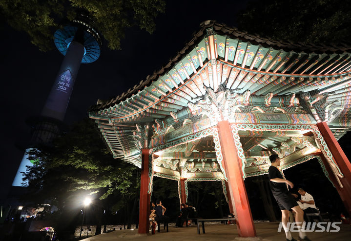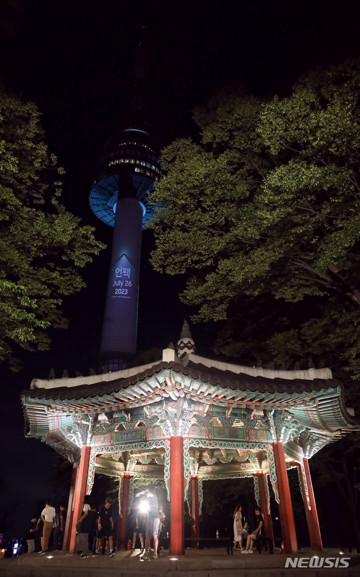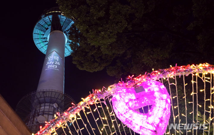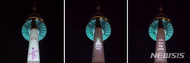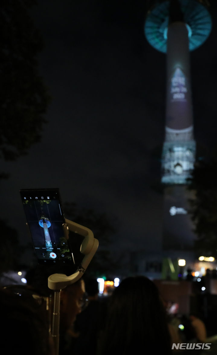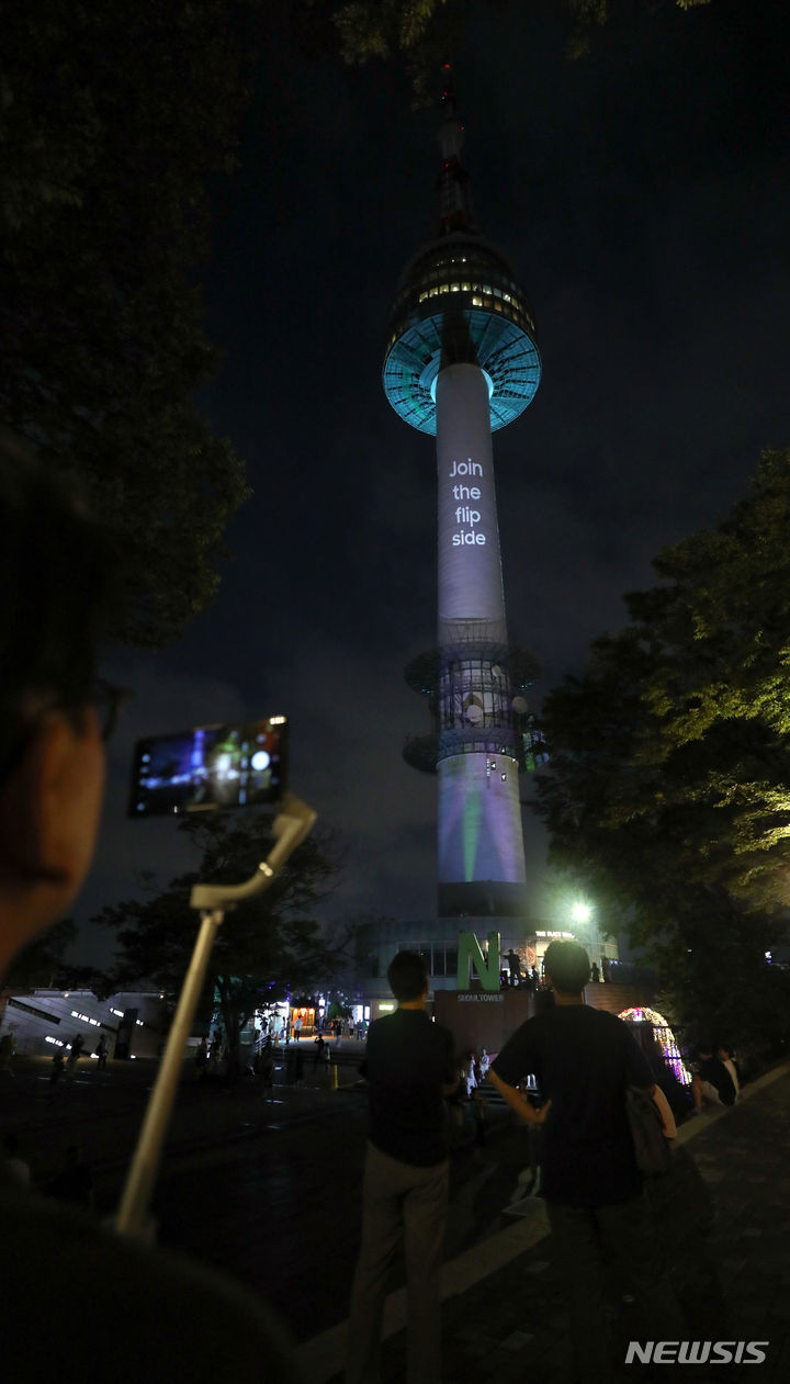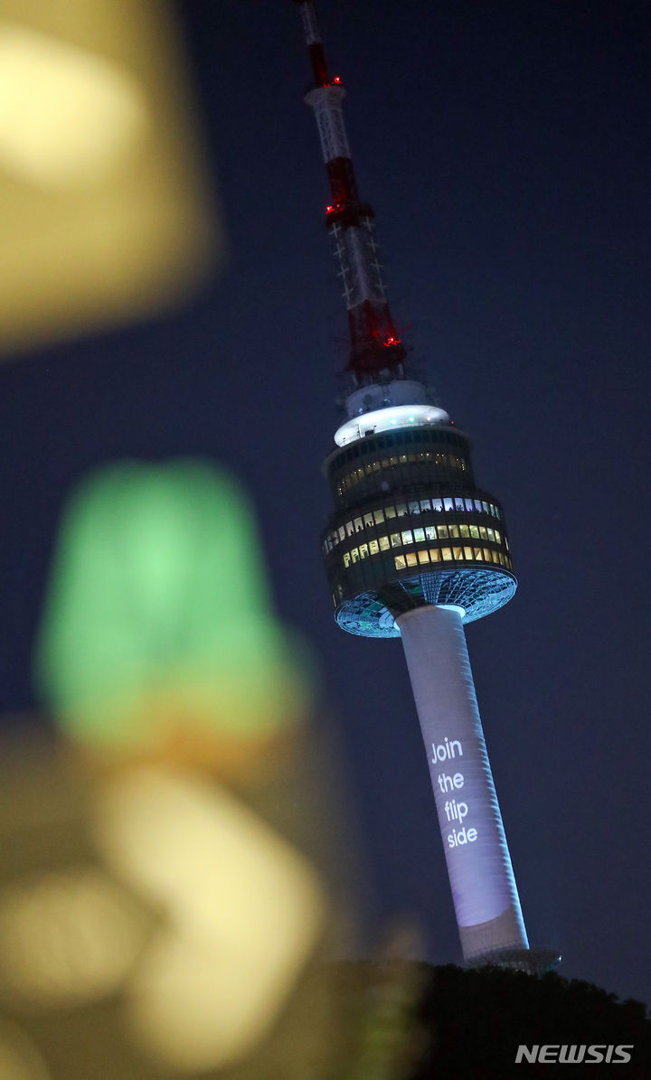 ソウル市竜山区の南山にあるNソウルタワーに24日、サムスン電子のイベント「Galaxy Unpacked」に関する夜間デジタル屋外広告が表示されている。サムスン電子は史上初めて韓国国内で「Galaxy」新商品をお披露目する予定で、今回の「Galaxy Unpacked」は26日午後8時、ソウル市江南区のCOEXで行われる。
