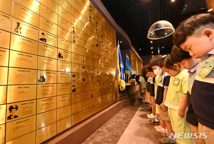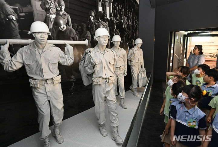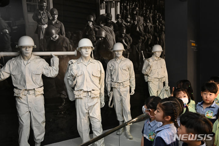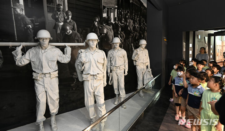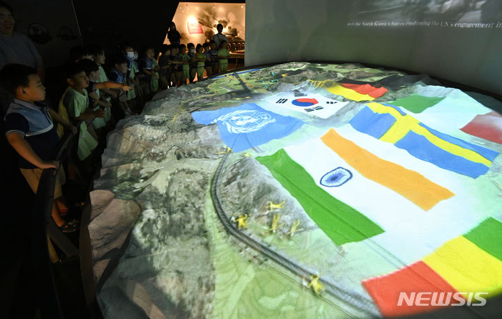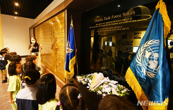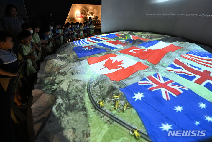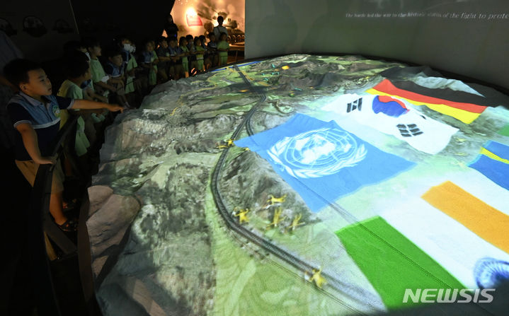 6・25戦争の停戦協定70周年と国連軍参戦の日をあすに控えた26日、京畿道烏山市の竹美嶺平和公園内にある国連軍初戦記念館を訪れた子どもたちが、展示物を見て回っている様子。