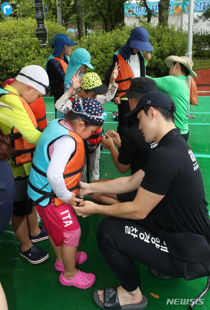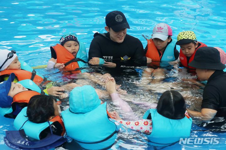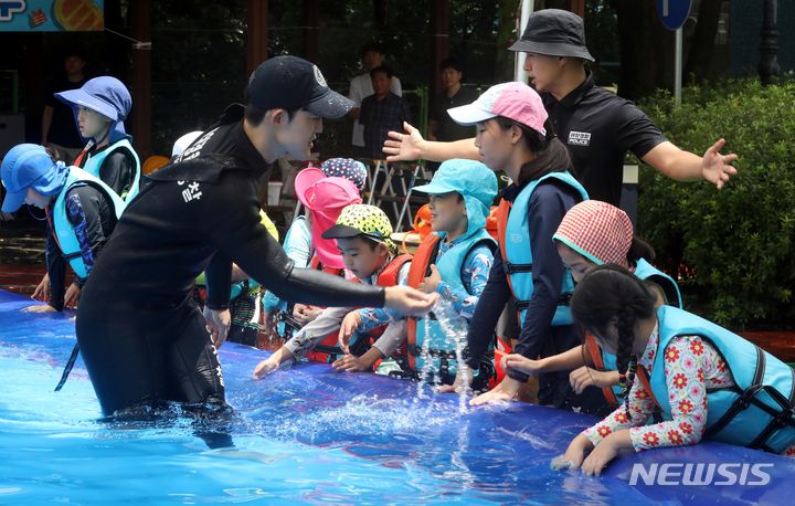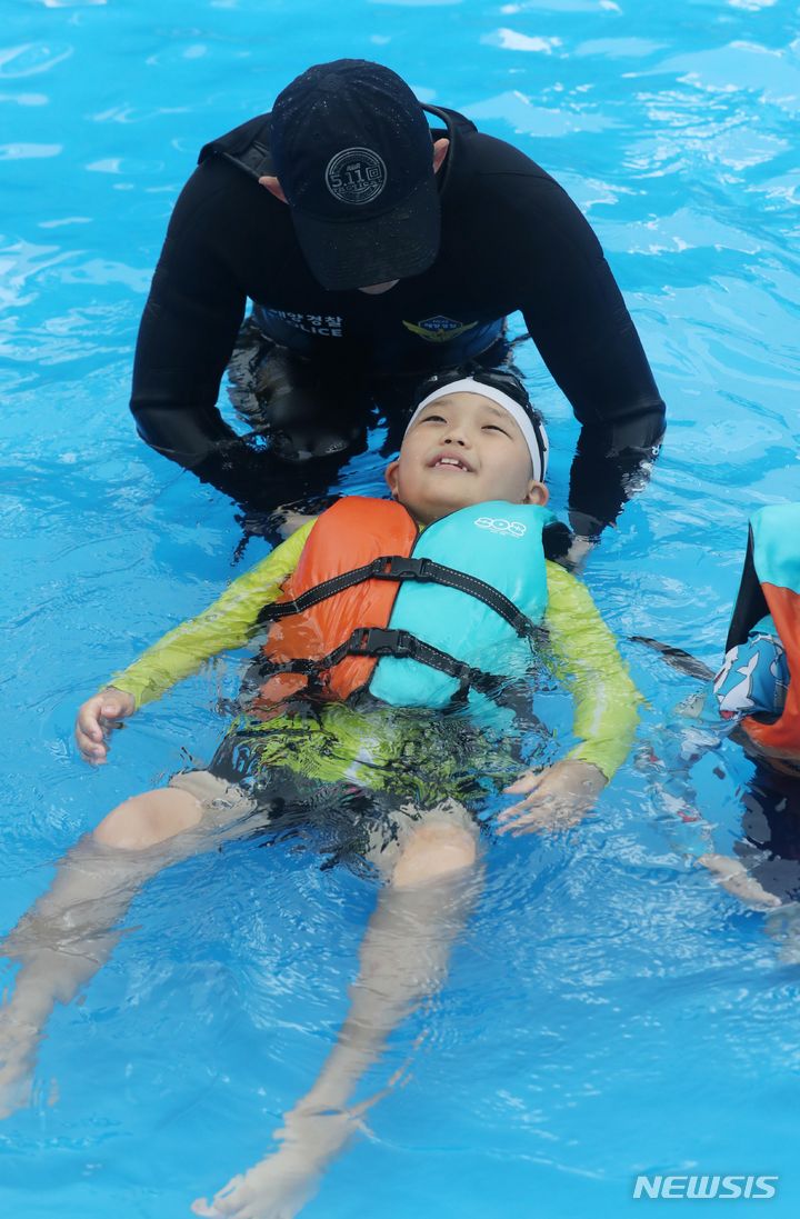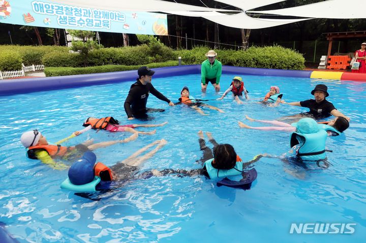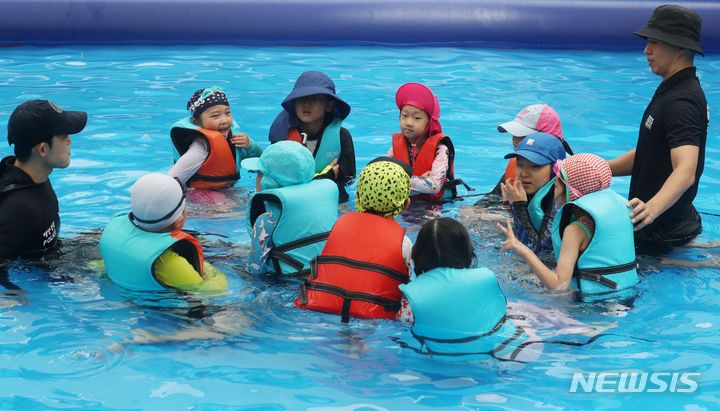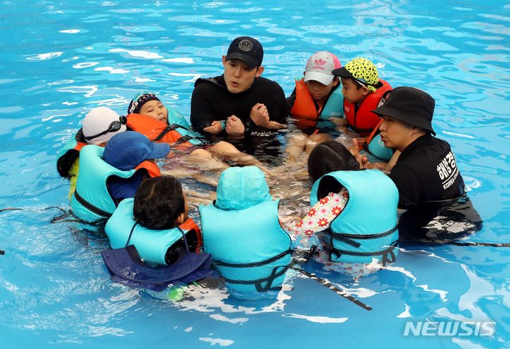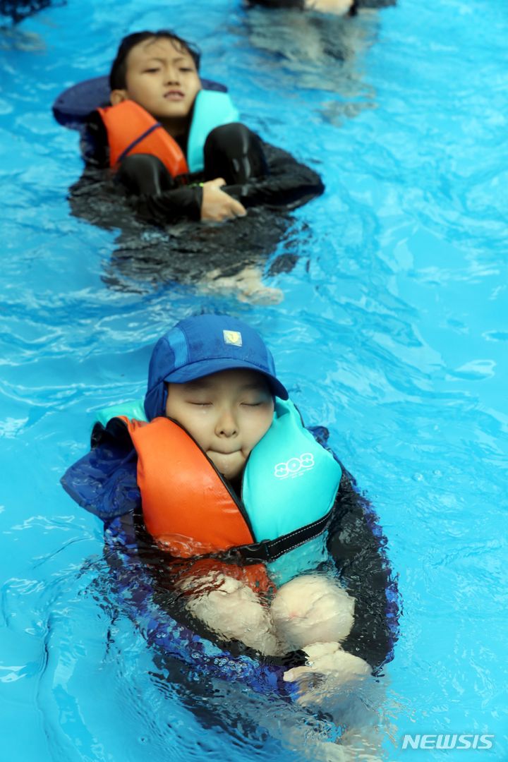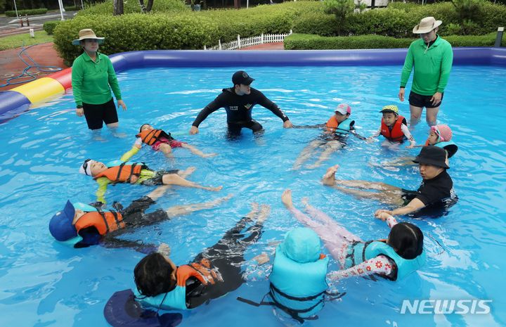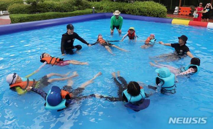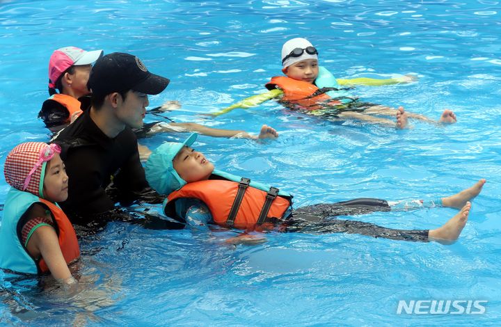 26日午後、ソウル市松坡区の松坡安全体験教育館内の野外プールで、子どもたちが生存水泳を学んでいる様子。松坡区は、夏休みに合わせて来月11日まで3週間にわたり生存水泳教育を進める。