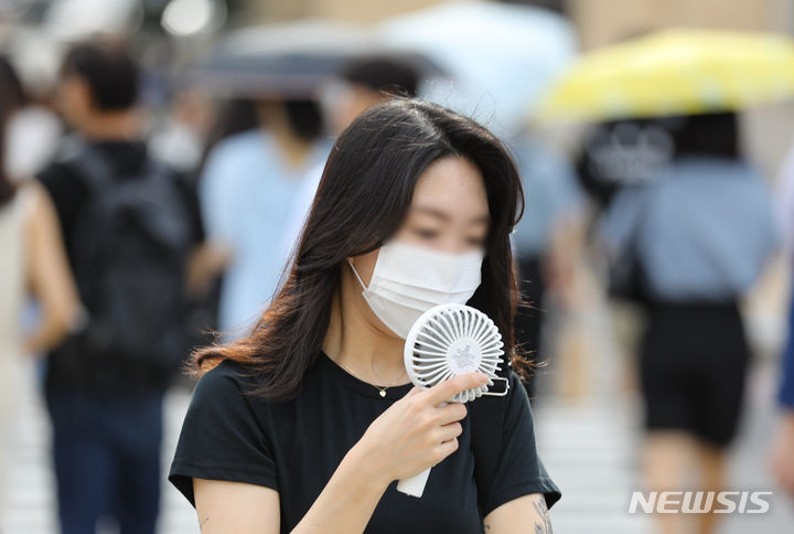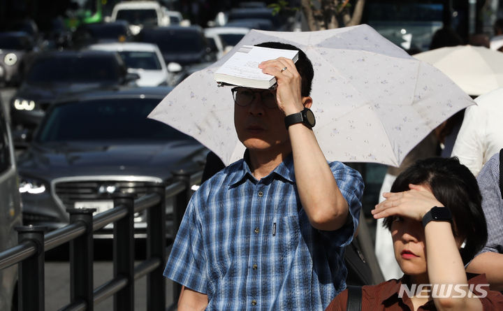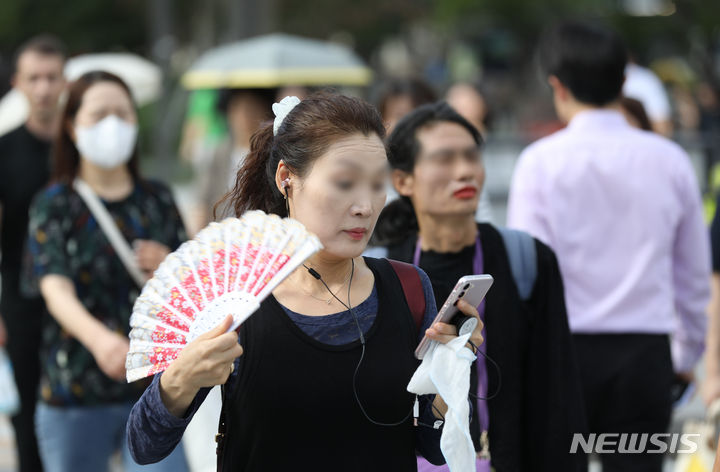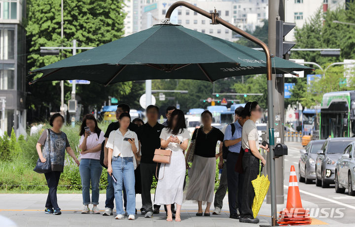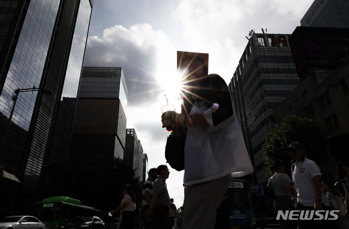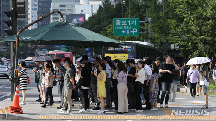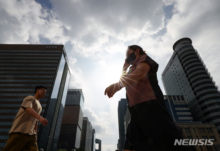 梅雨が明け、朝早くから蒸し暑い27日午前、ソウル市鍾路区の世宗路交差点を足早に通り過ぎる市民たち。
