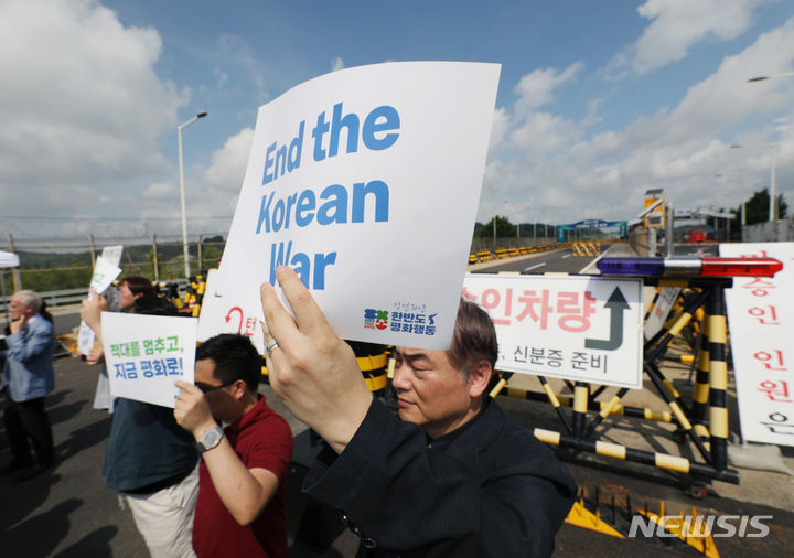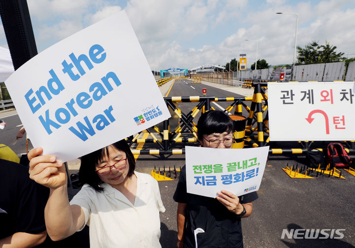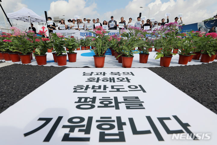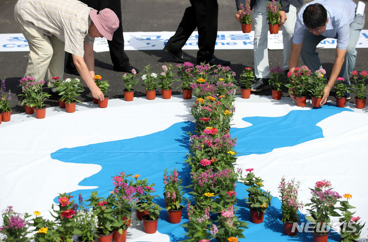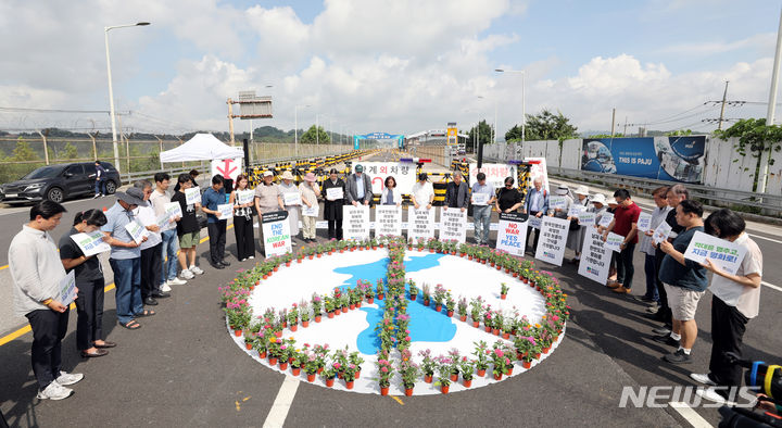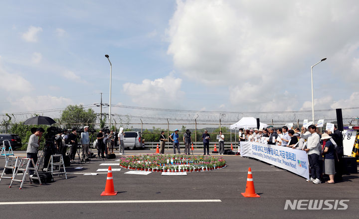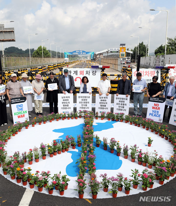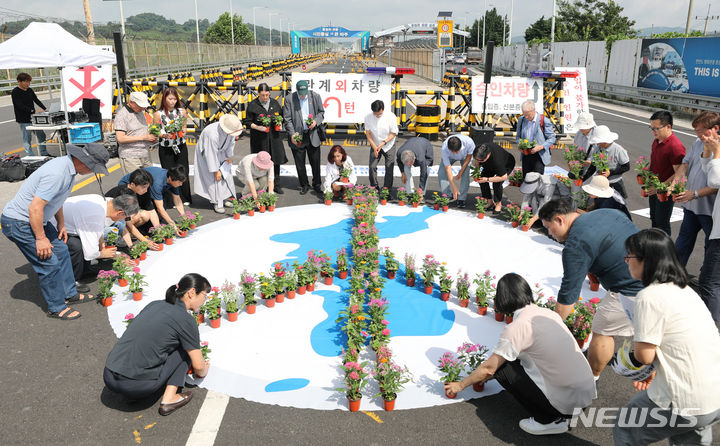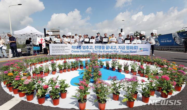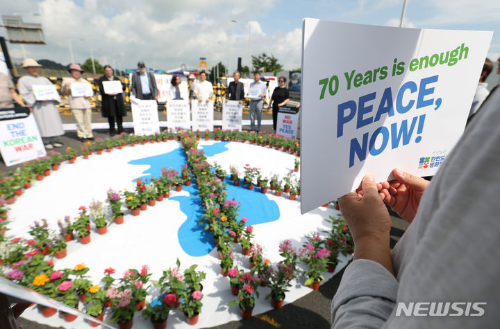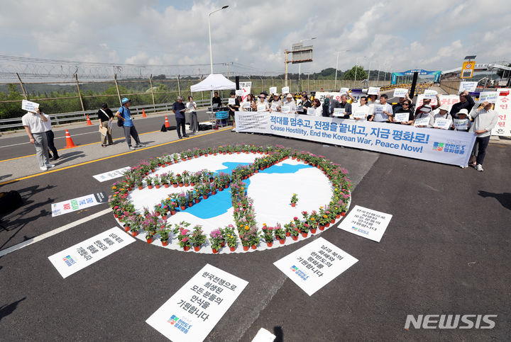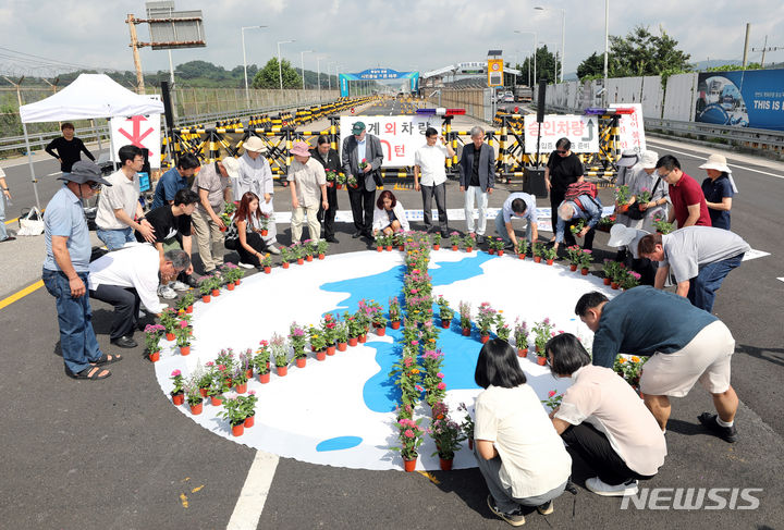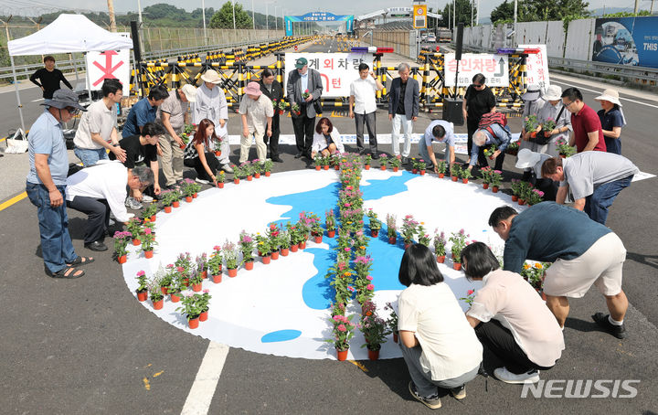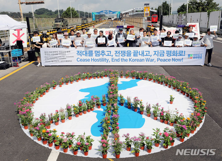 停戦70年韓半島平和行動の関係者が27日、統一大橋(京畿道坡州)のバリケード前で開かれた停戦70年韓半島平和宣言発表国内外市民社会記者会見で、韓半島旗の上に花でピースマークを作っている。