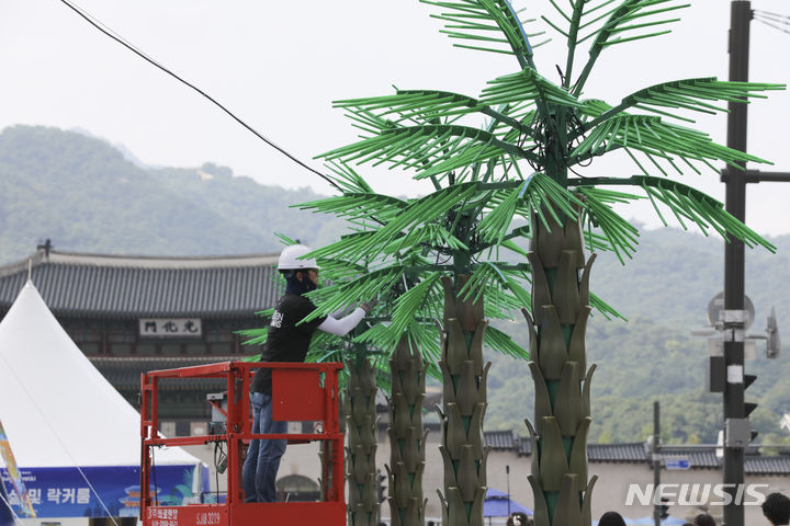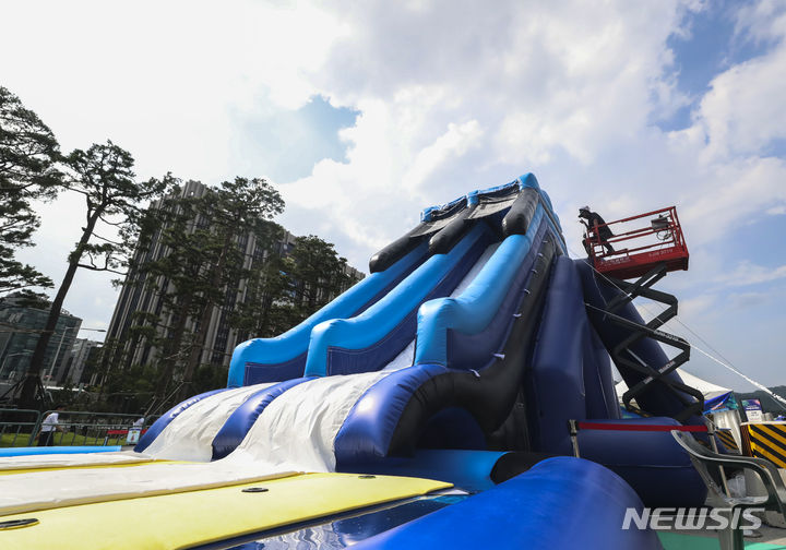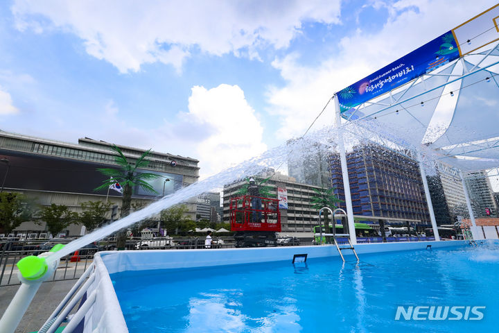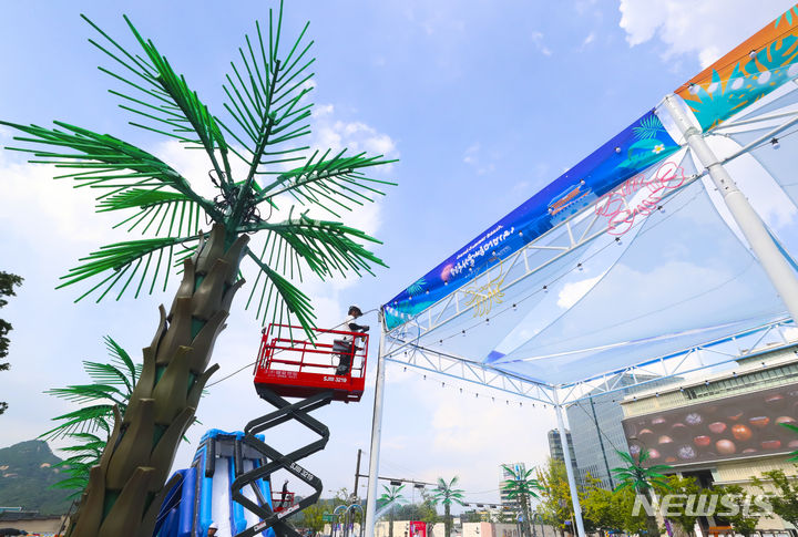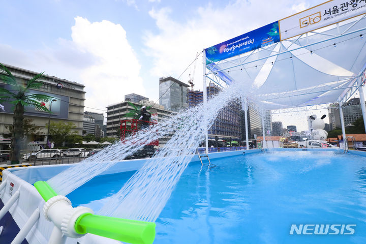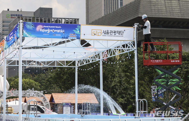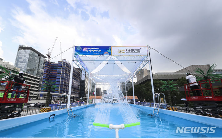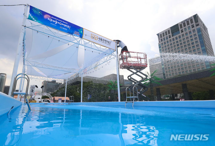 【NEWSIS】2023年ソウル・サマー・ビーチの開幕を明日に控えた27日、ソウル中心部の光化門広場では、プールの設置など大詰めの作業が行われていた。