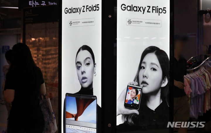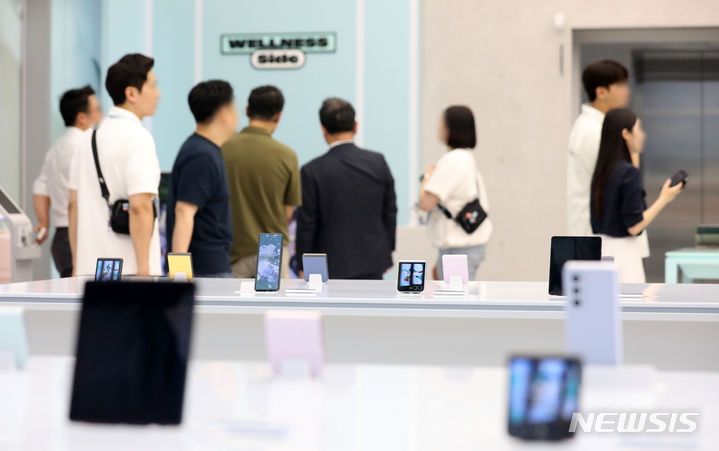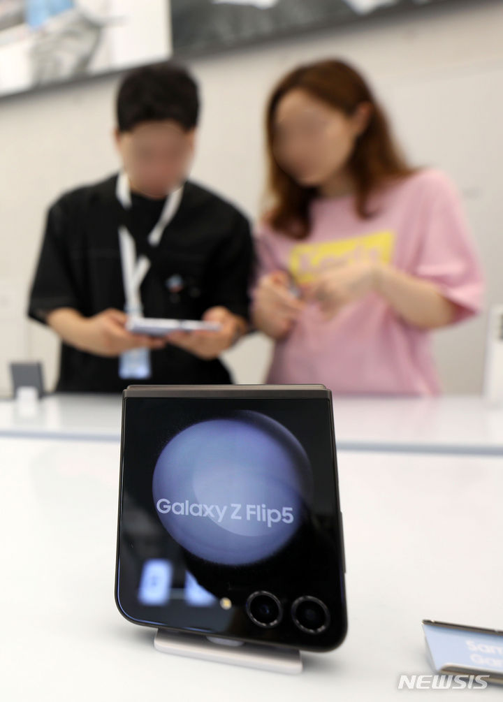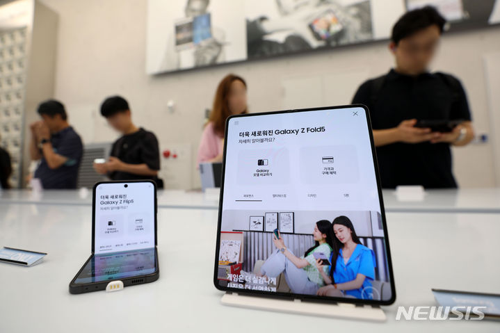 サムスン電子が、Galaxy Unpacked 2023にてGalaxy Z Flip5とFold5、Galaxy Watch6シリーズ、Galaxy Tab S9シリーズを公開した。写真は27日、ソウルの江南駅に近い「サムスン江南」の売場で、新たに公開された各製品を体験してみる人々の様子。