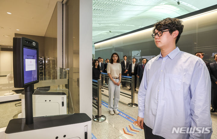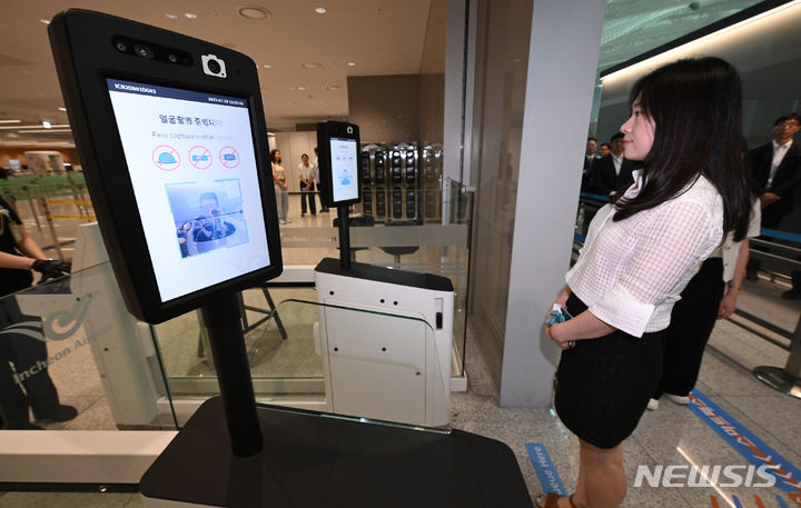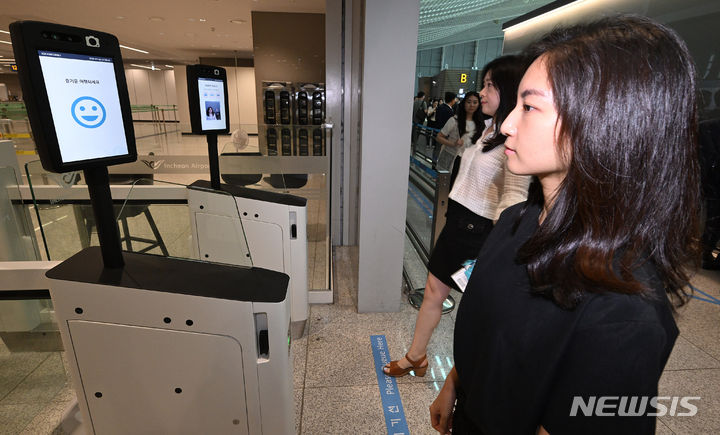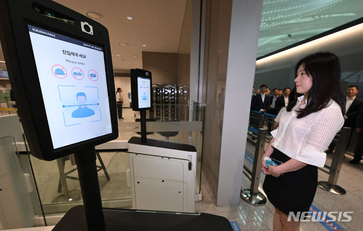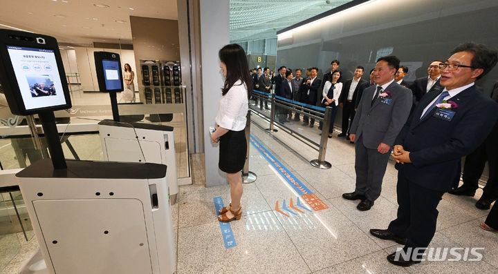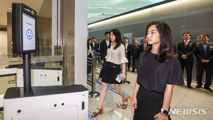 28日、仁川国際空港第2ターミナル出国場で開かれたスマートパスサービスのオープン記念イベントで、職員がスマートパスサービスの試演を行っている様子。「スマートパス」とは、旅券・搭乗券なしにあらかじめ登録した顔面認識情報で出国手続きを素早く進めることができるサービス。