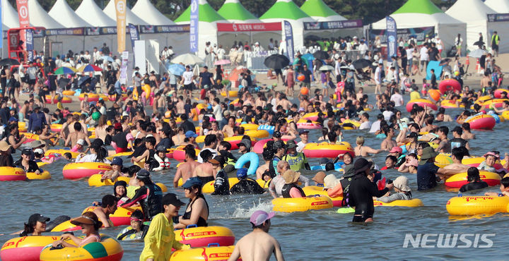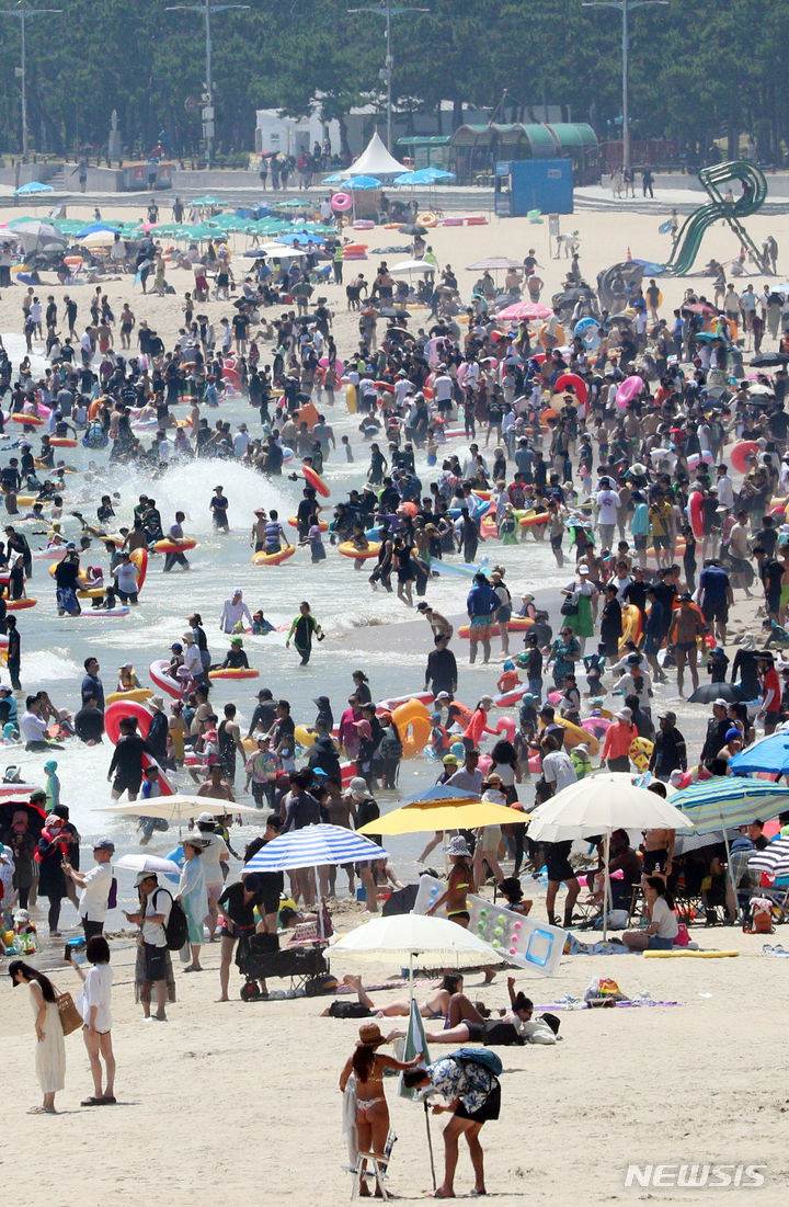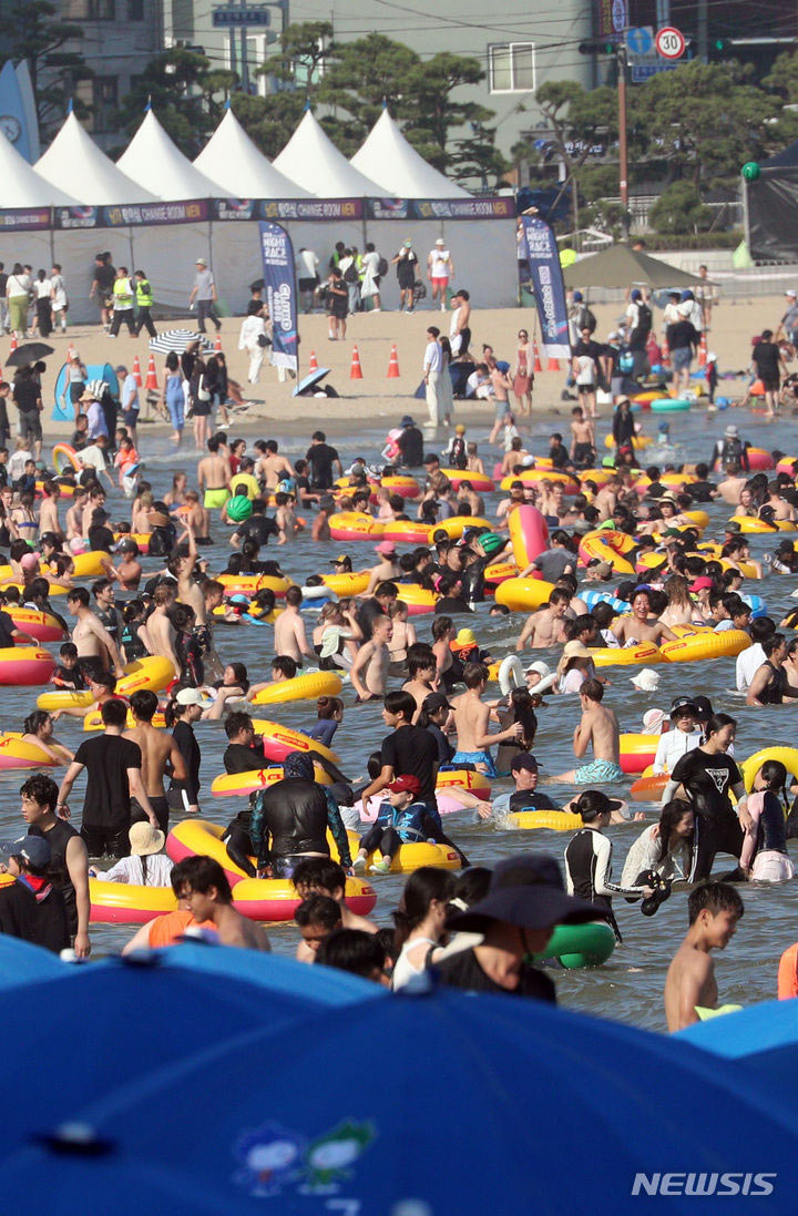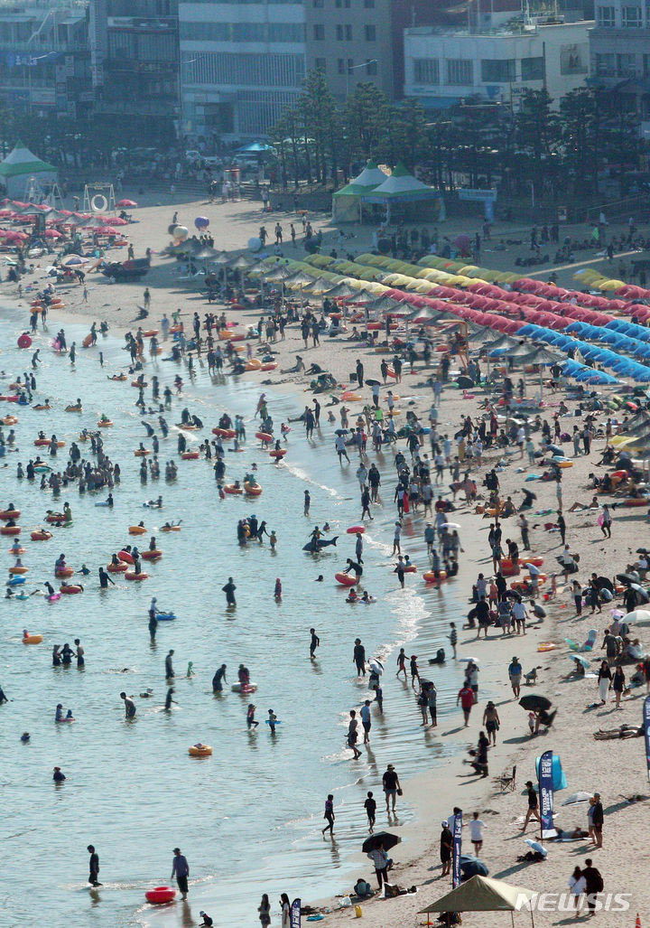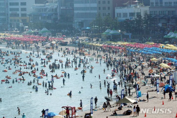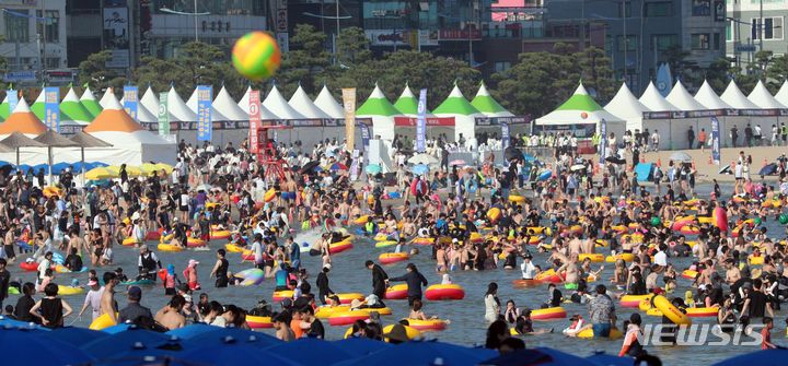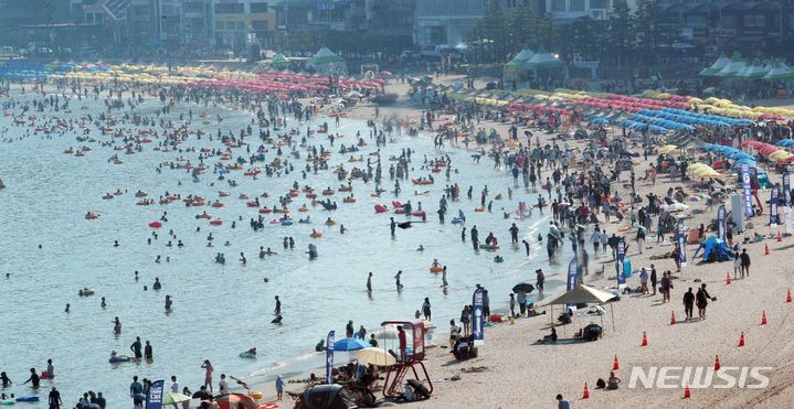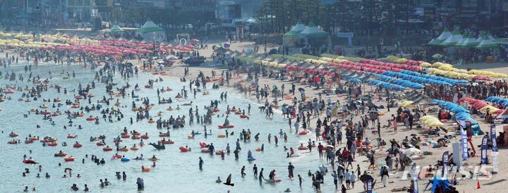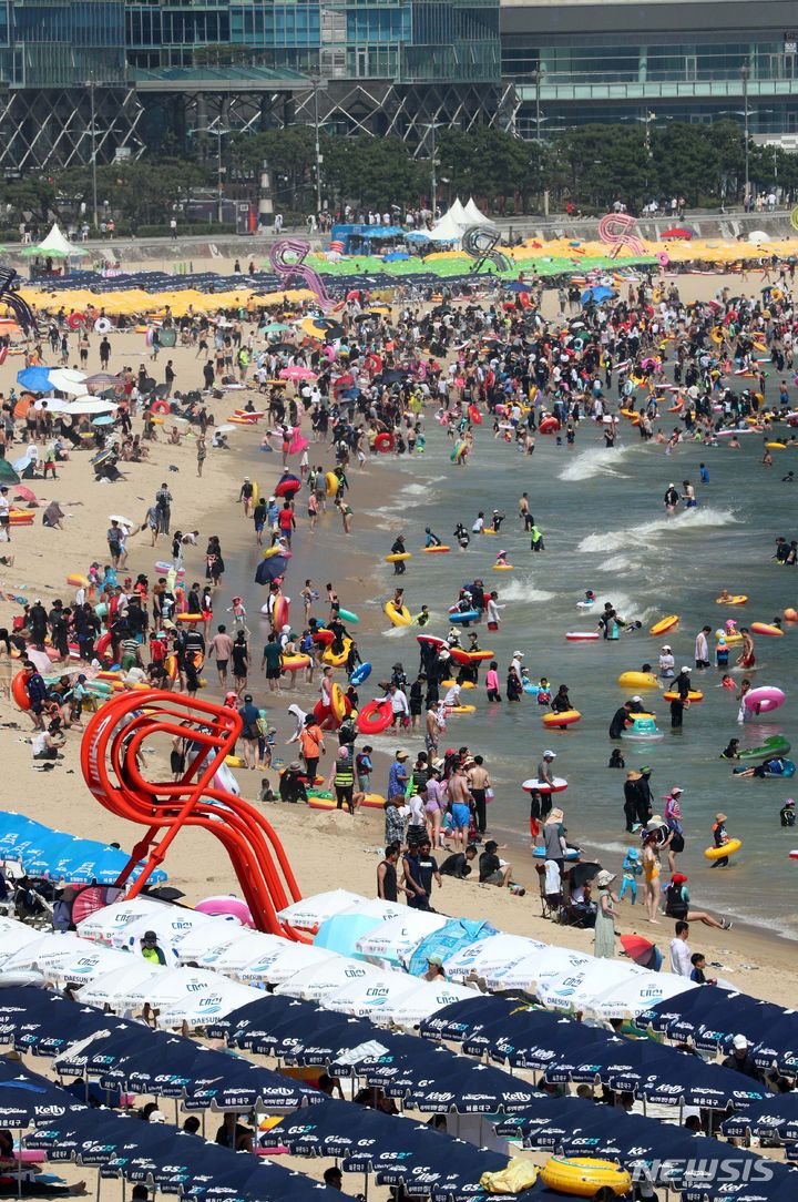 【NEWSIS】夏休みシーズンを迎えた29日午後、海水浴客でにぎわう釜山市水営区の広安里海水浴場。
