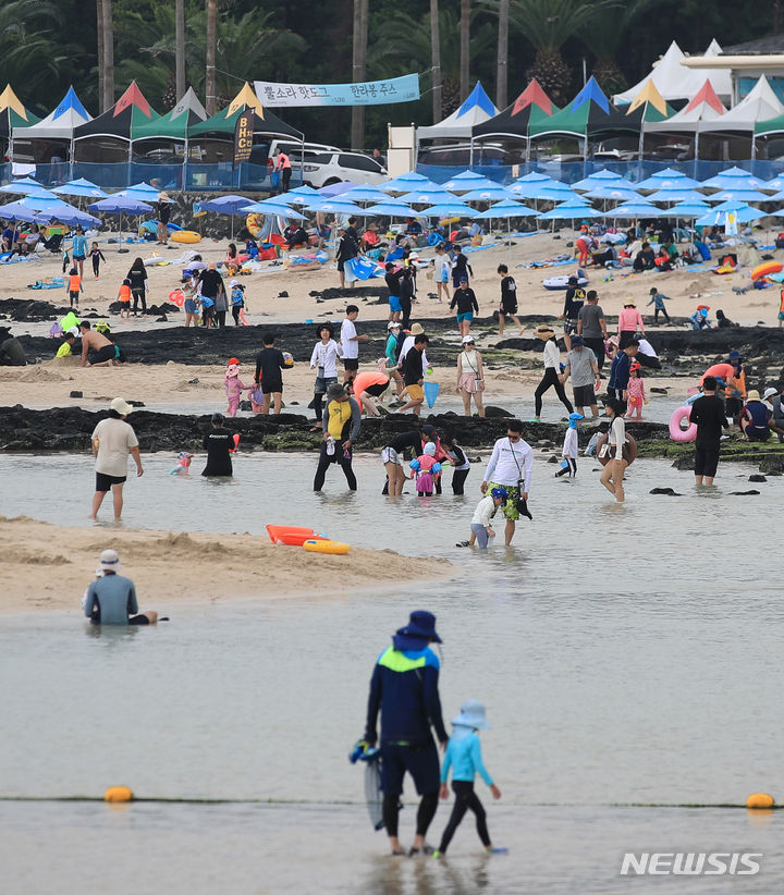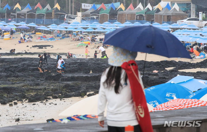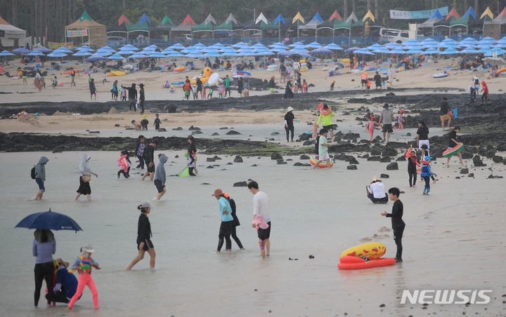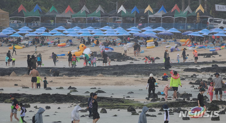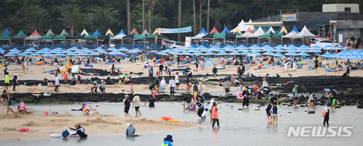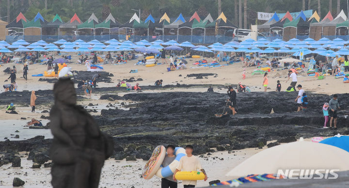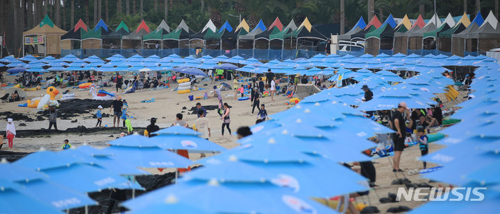 暑さが猛威を振るう31日午後、済州市翰林邑の金陵海水浴場では、訪れた人々がパラソルの下で暑さを紛らわせていた。