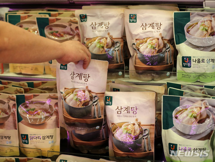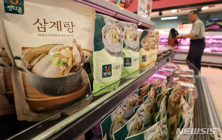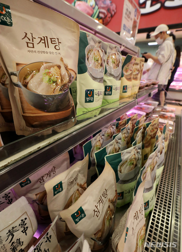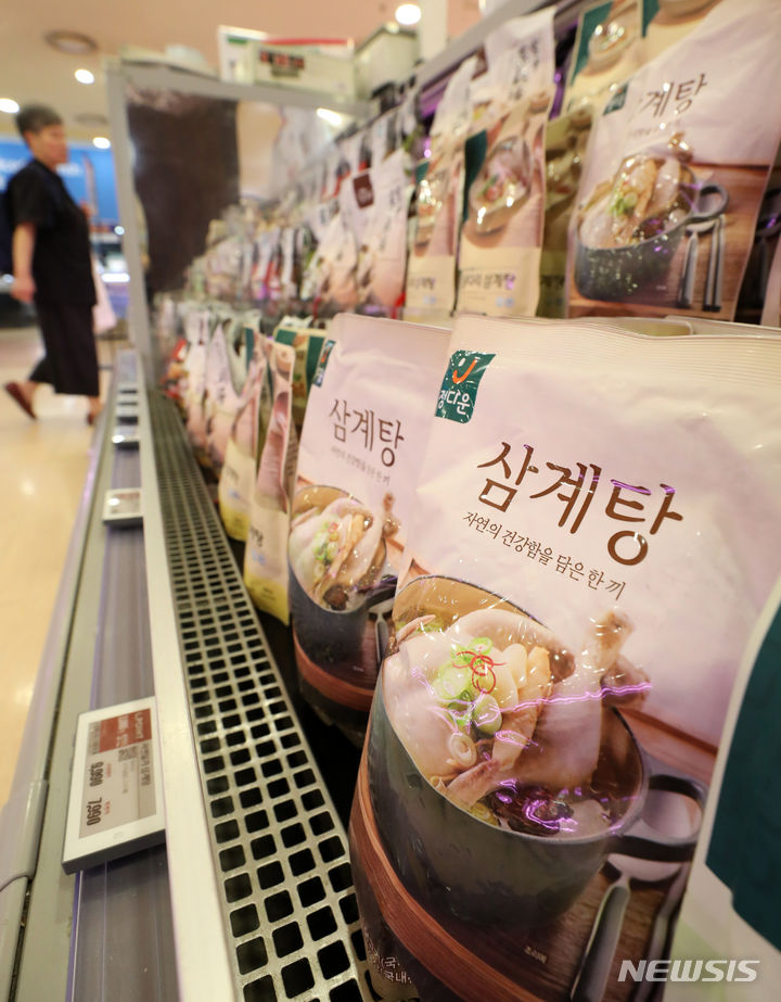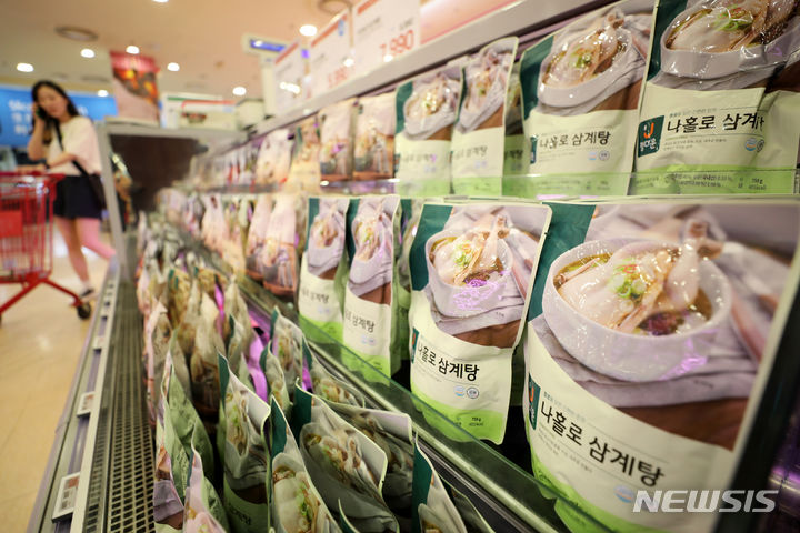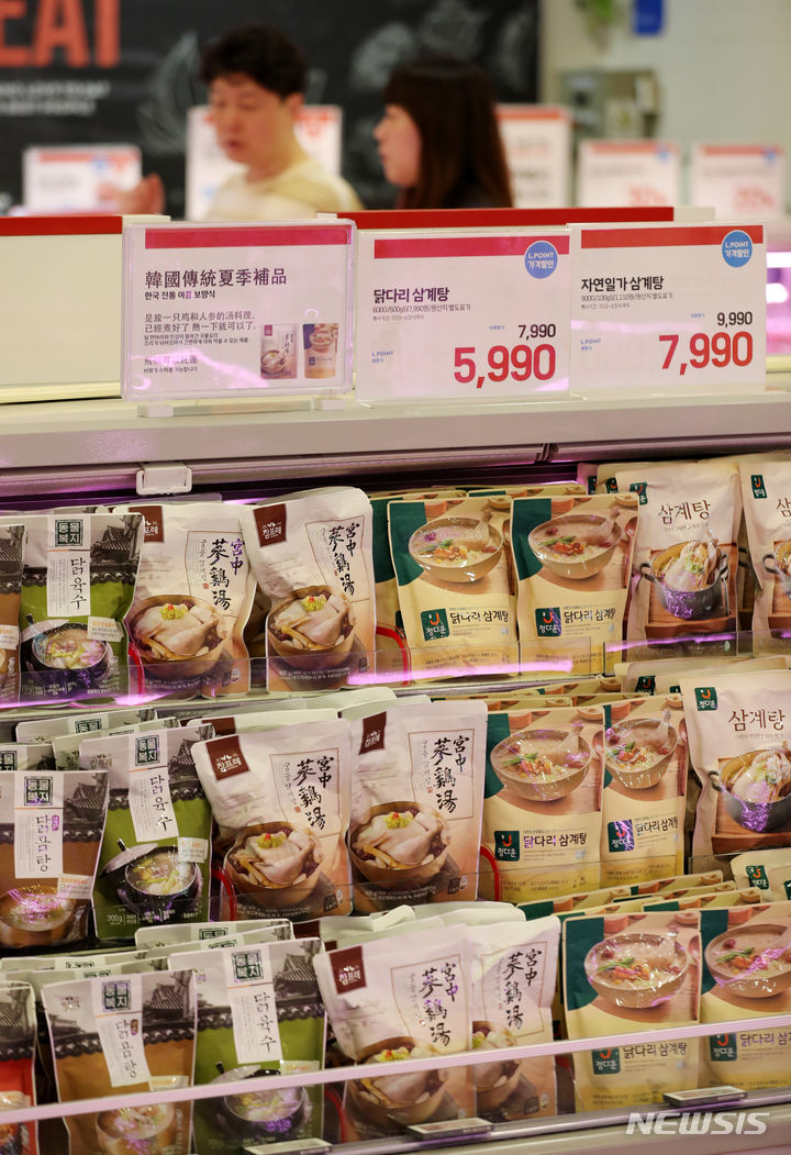 韓国の夏を代表する保養食「サムゲタン」が、物価上昇の影響で、簡単に調理できる製品の需要が高まっている。写真は31日午後、ソウル市内の大手スーパーに簡易調理のサムゲタン製品が並んでいる様子。