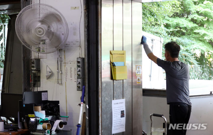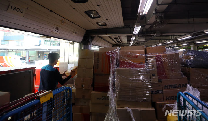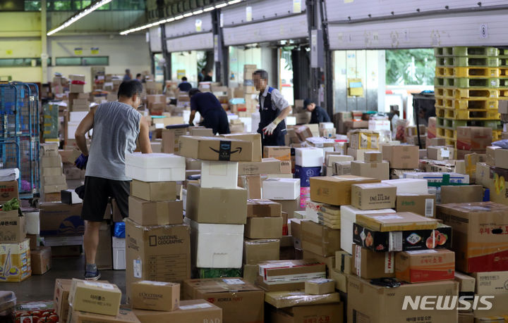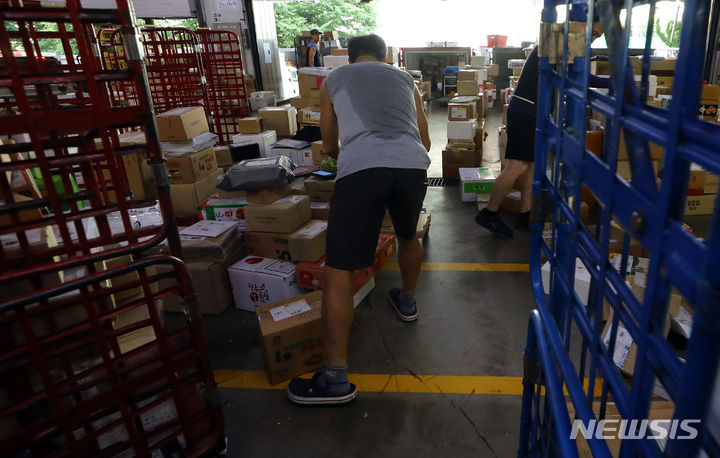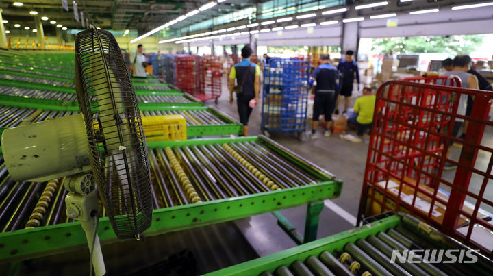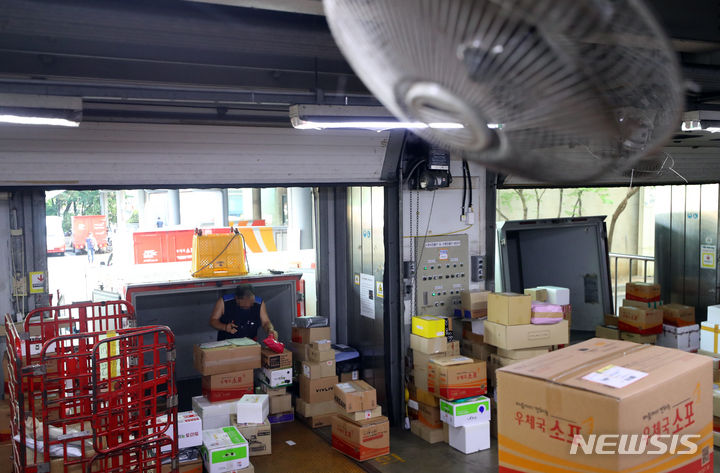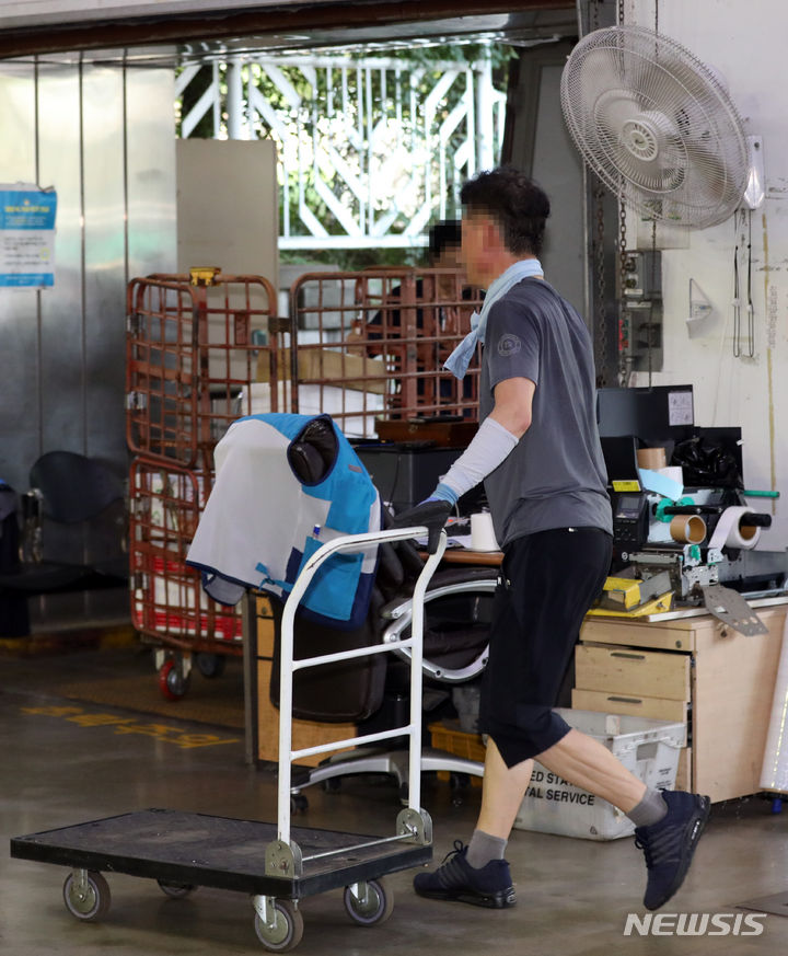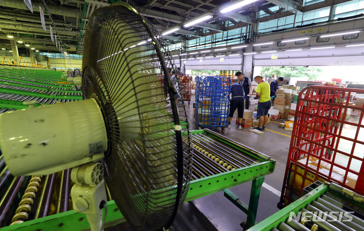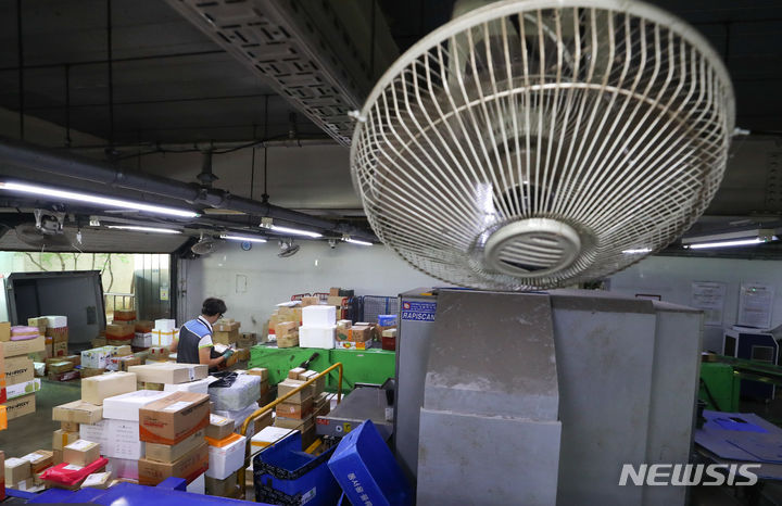 【NEWSIS】連日猛暑が続いている1日午前、ソウル市広津区の東ソウル郵便物流センターでは、職員が汗だくになりながら小包の仕分け作業をしていた。