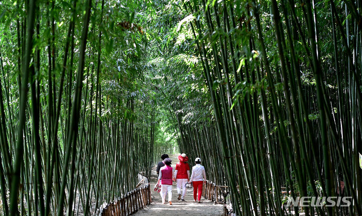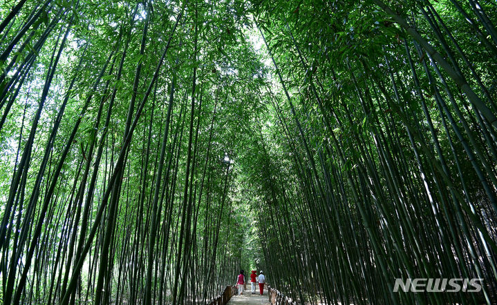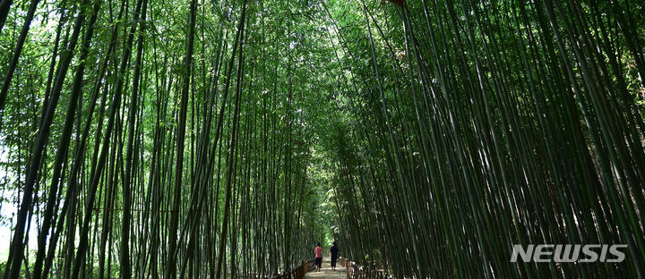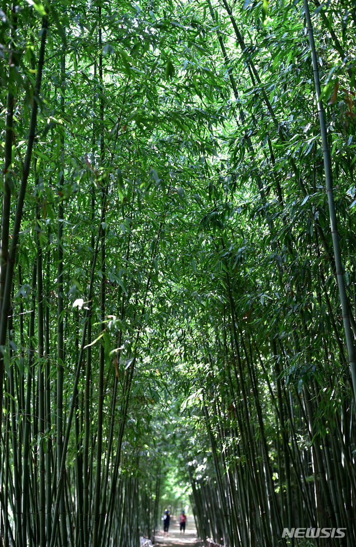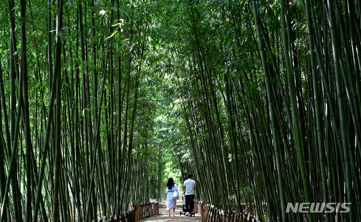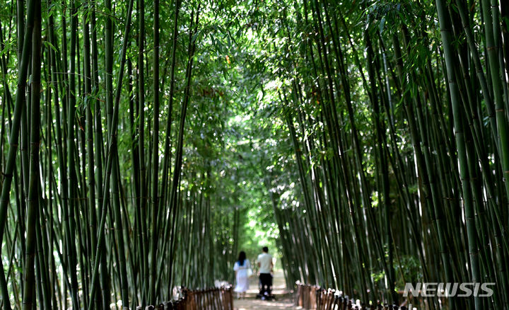 猛暑が続く1日、大邱市達城郡にある「竹谷・竹の葉音の道」では、訪れた市民が竹の葉陰で涼を取りつつ散策していた。