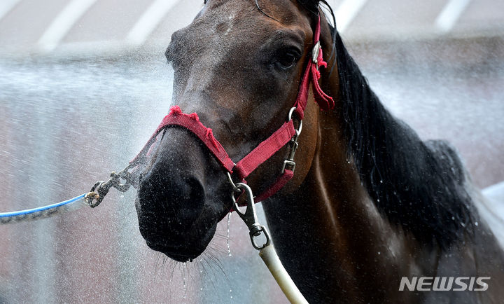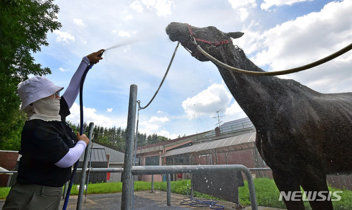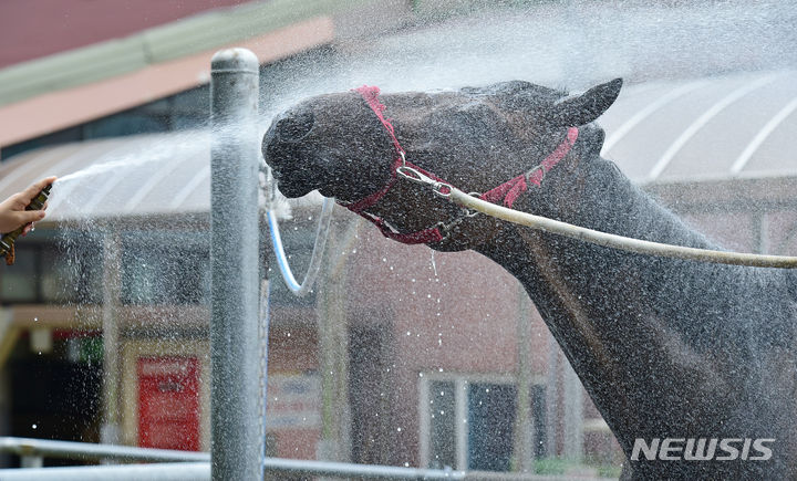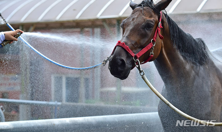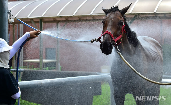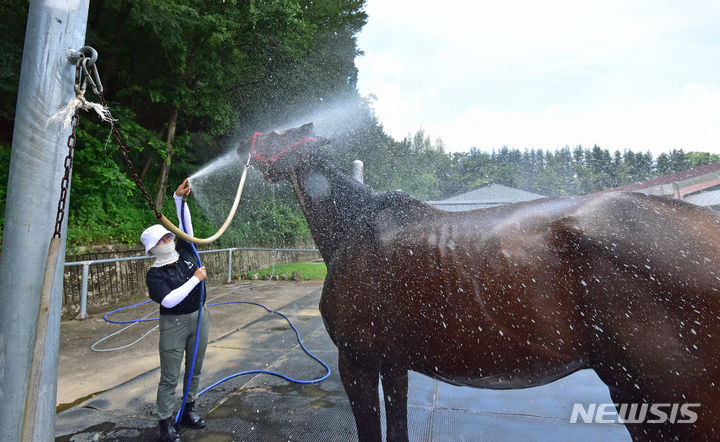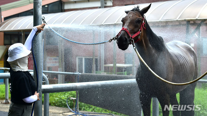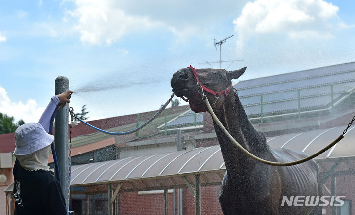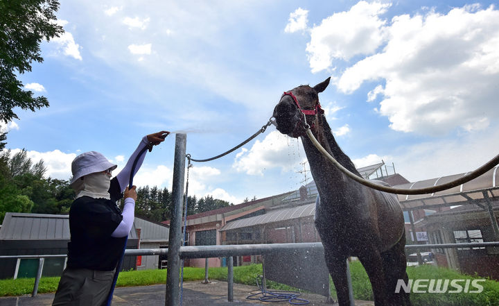 連日の猛暑の中、大邱市達西区の大徳乗馬場で1日午後、職員が馬に冷たい水をかけて暑さを紛らわせてやっている。
