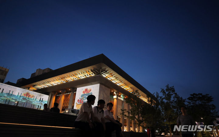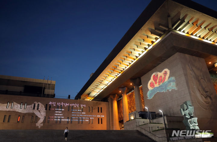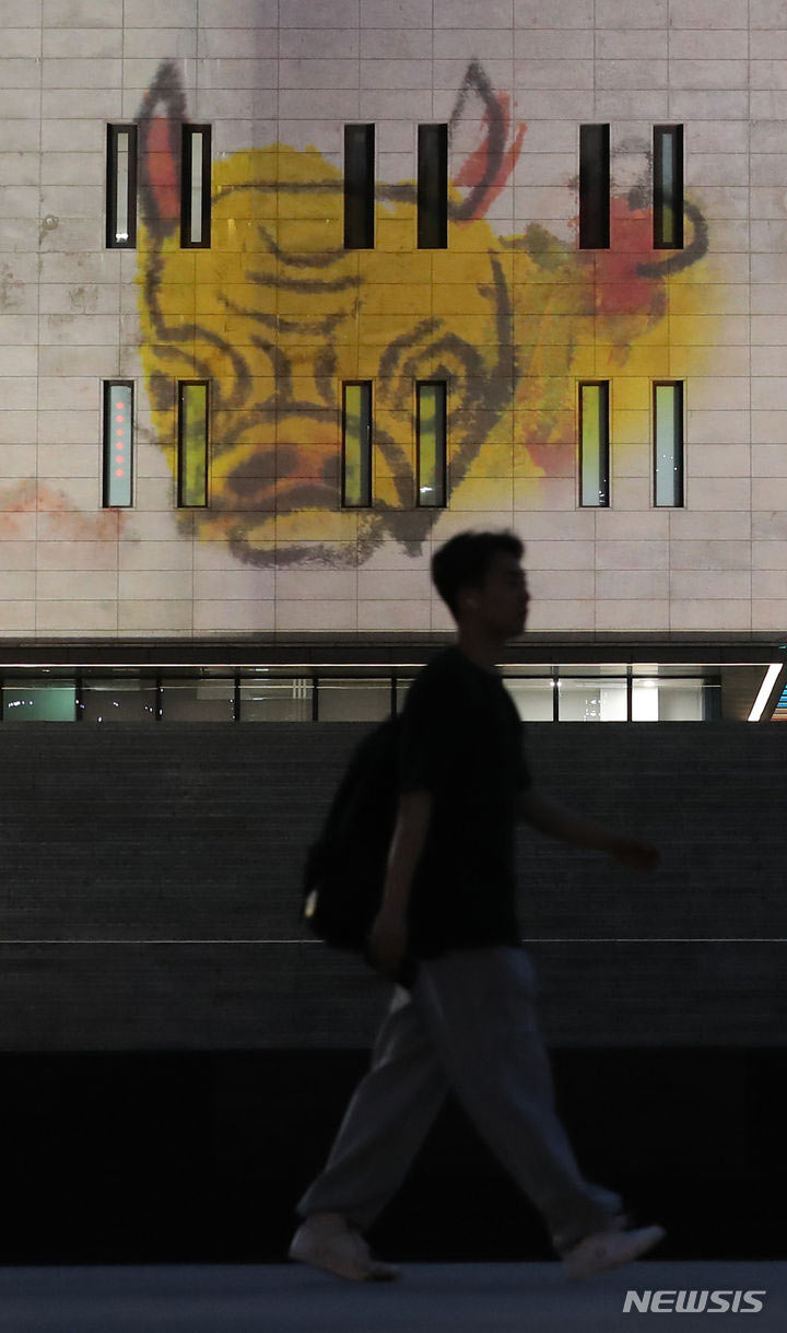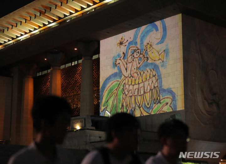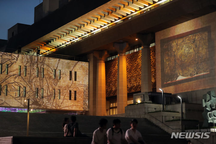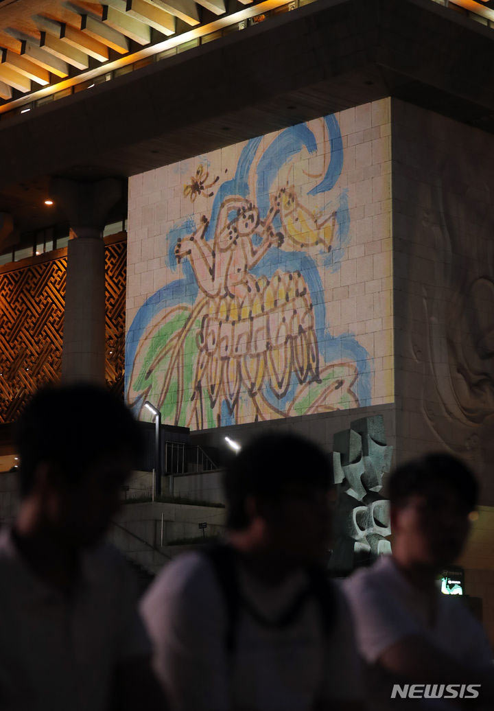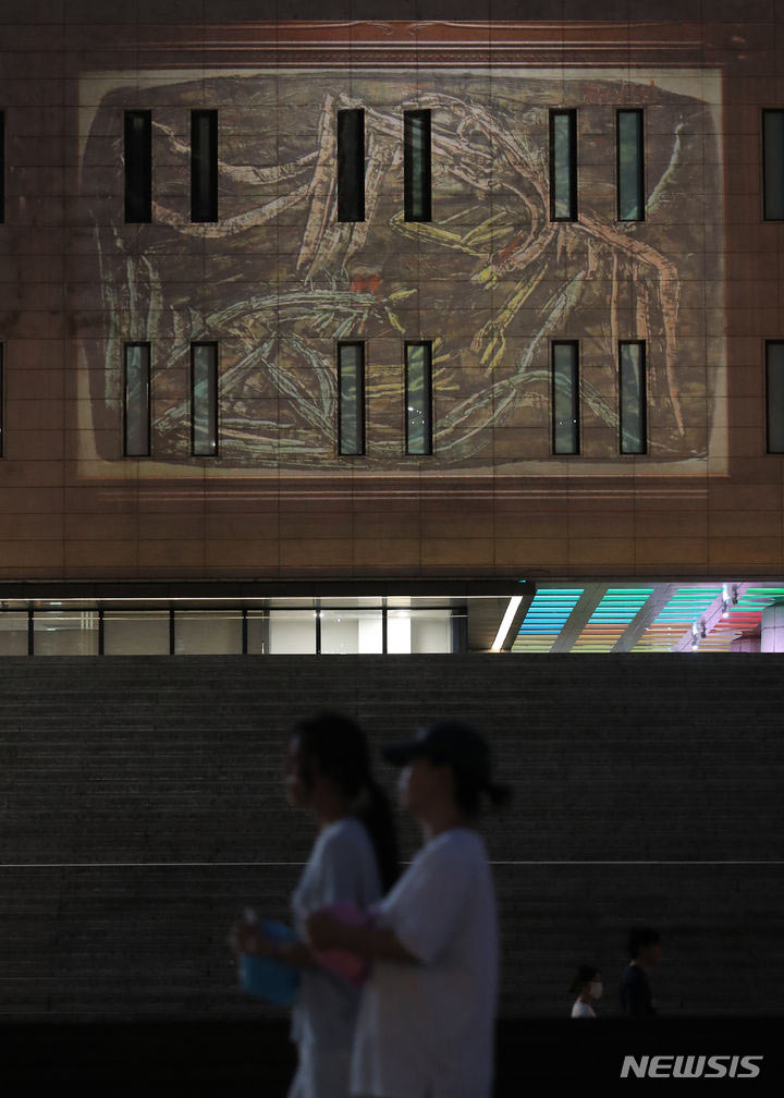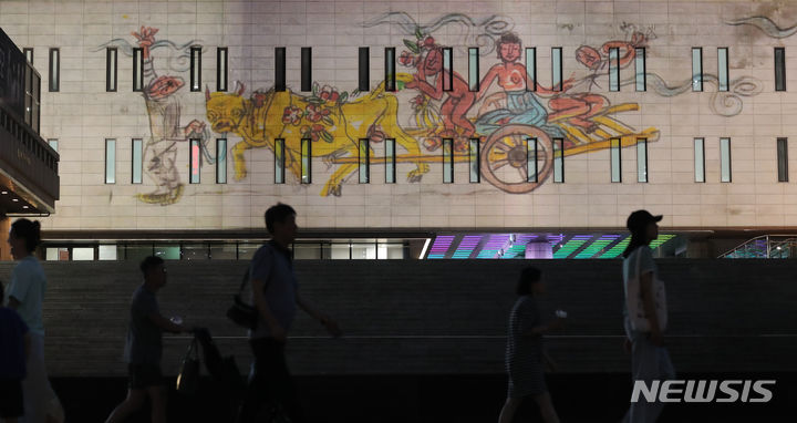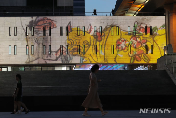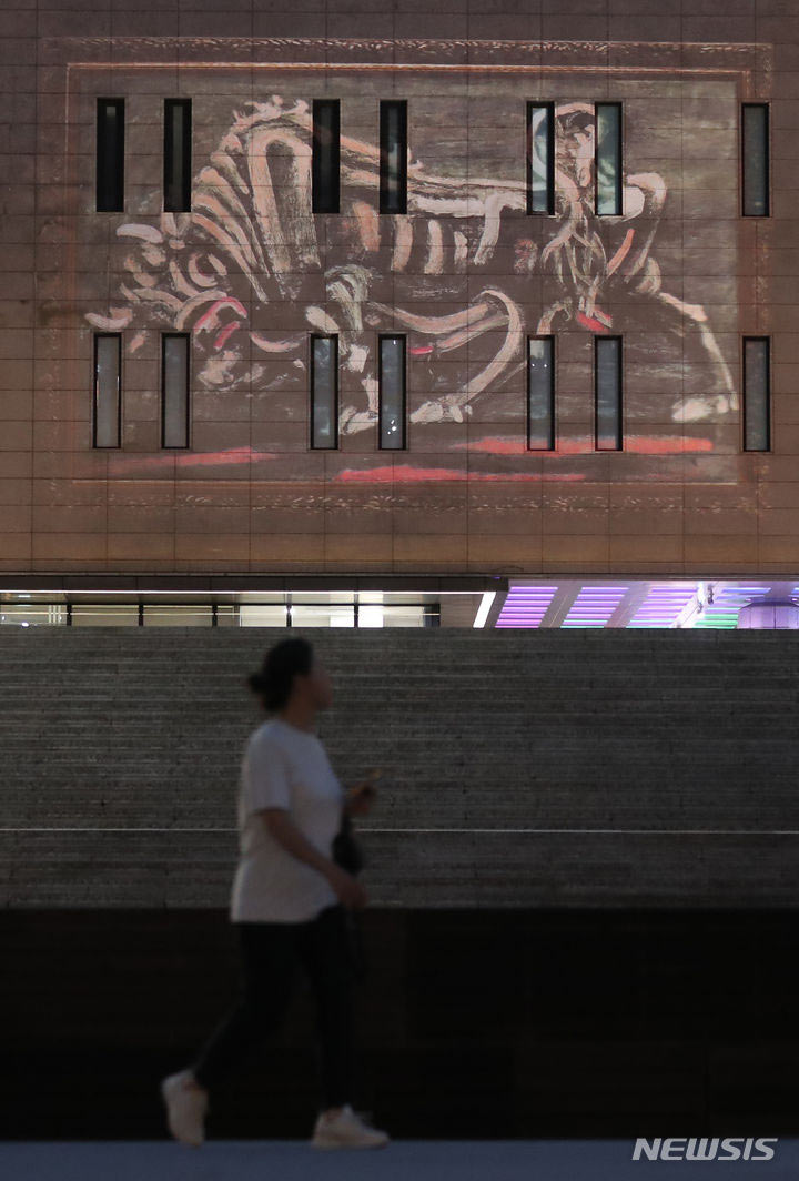 【NEWSIS】1日午後、ソウル市鍾路区の世宗文化会館の外壁に映し出された「2023広場への招待」メディアファサード展示映像の様子。今年末まで「韓国の国民画家」李仲燮(イ・ジュンソプ)の「雄牛」など27作品が世宗文化会館の外壁にメディアアートの形で展示される。