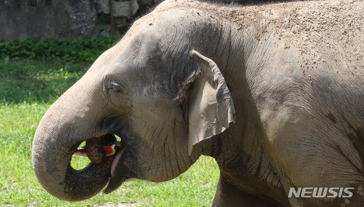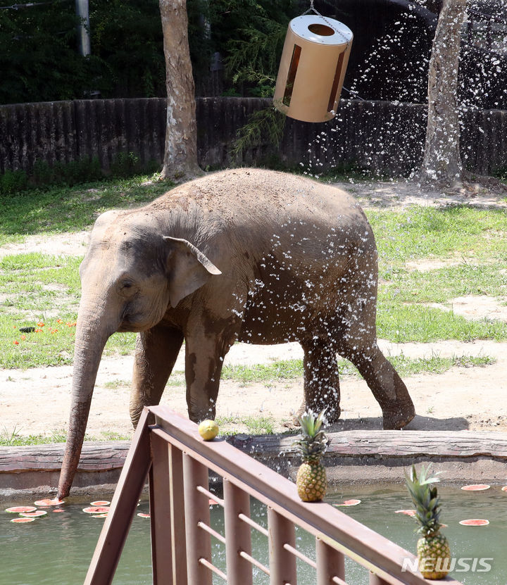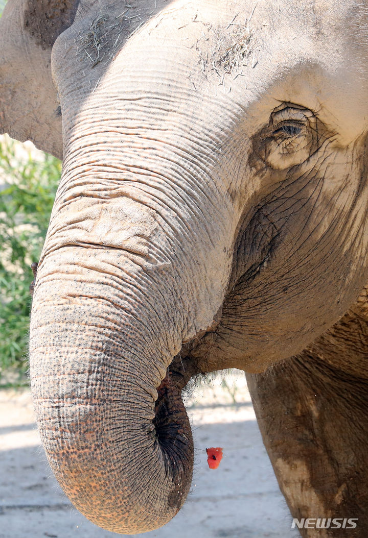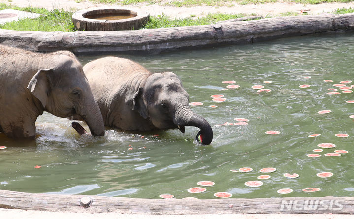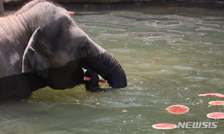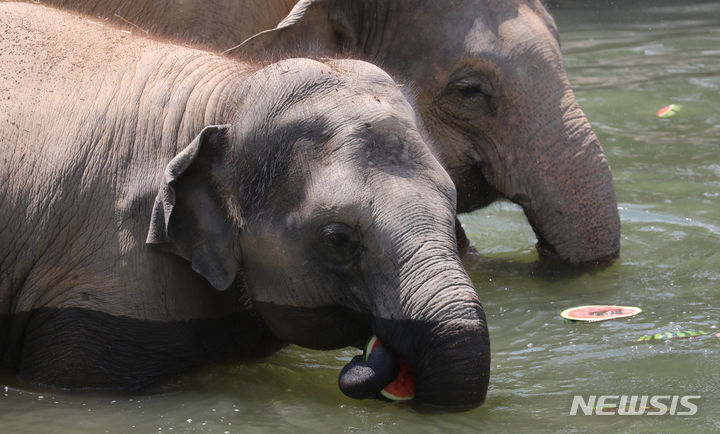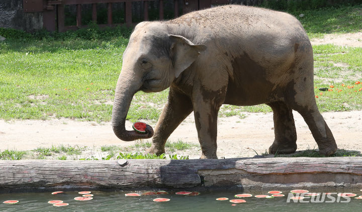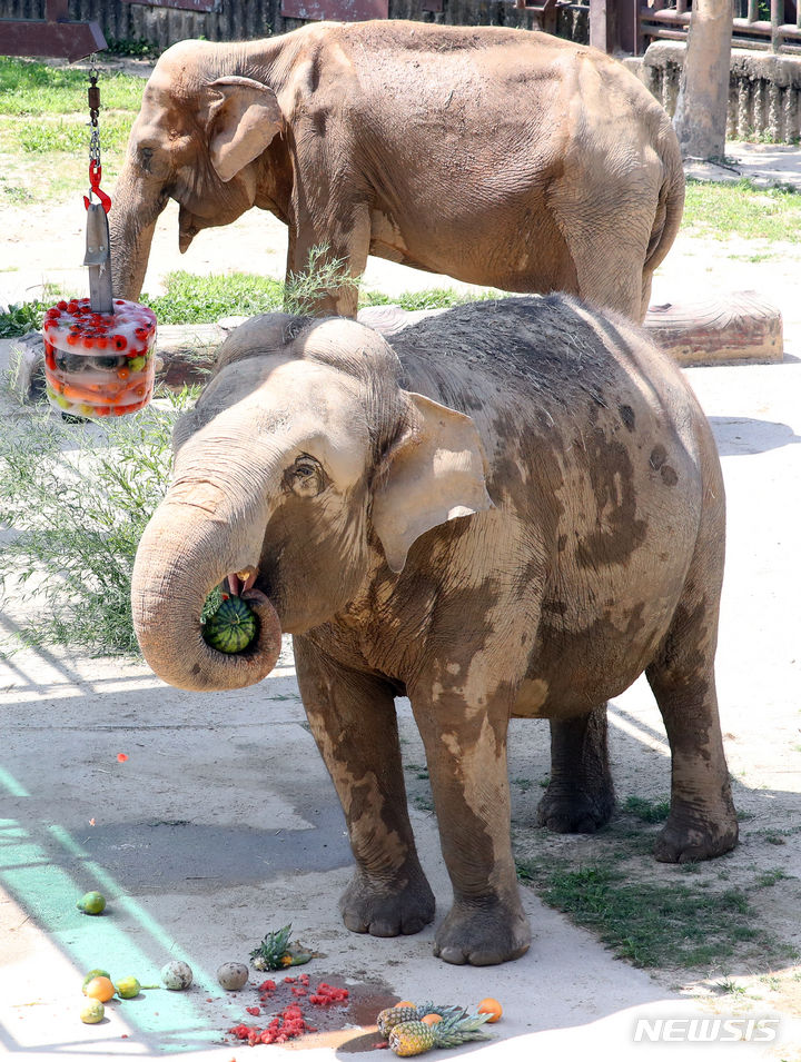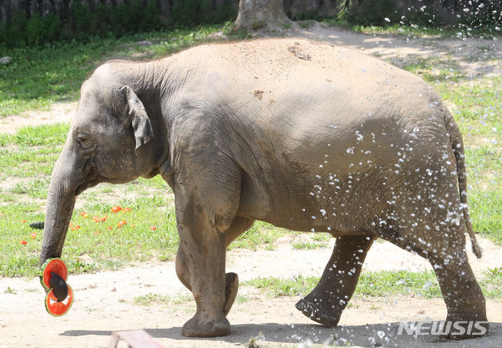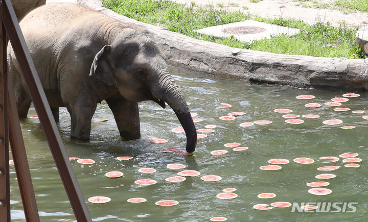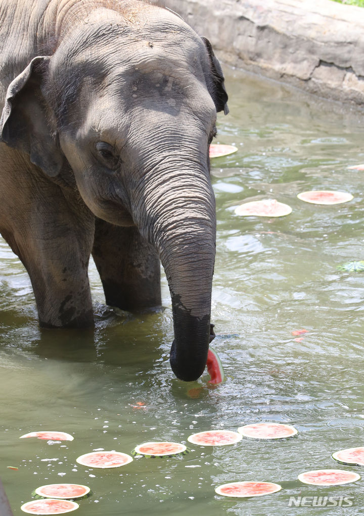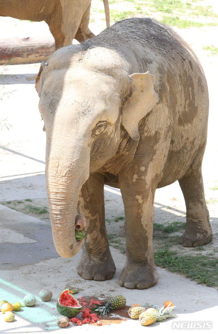 猛暑が続いている3日、京畿道果川のソウル大公園動物園では、ゾウがスイカなど果菜類の特別メニューを食べて涼を取っていた。