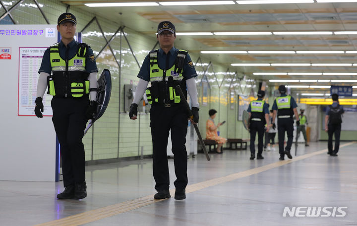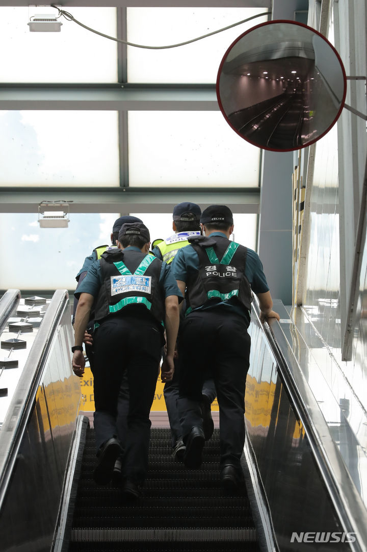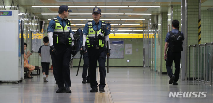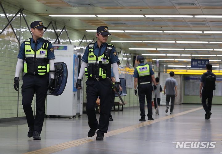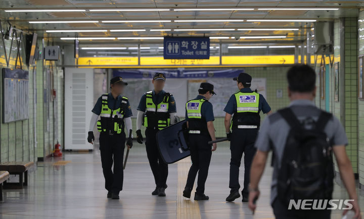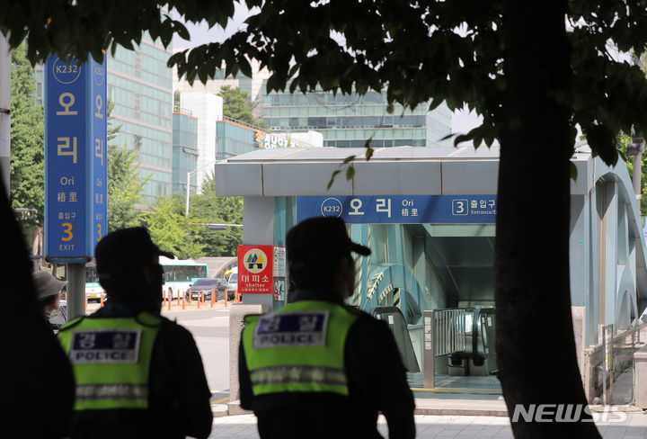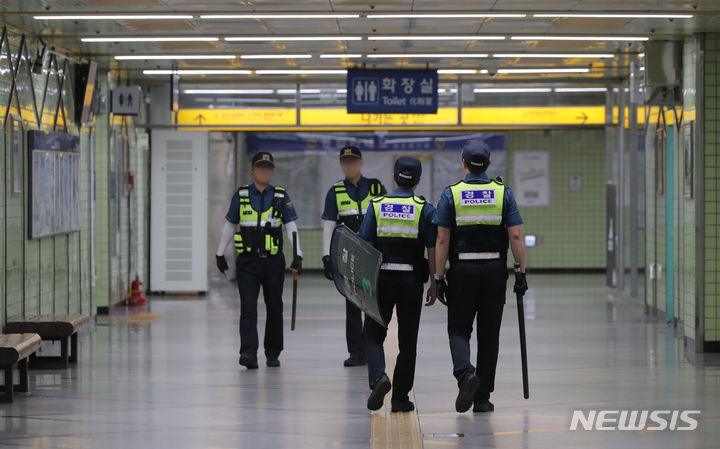 京畿道城南市盆唐区の梧里駅では4日、凶器を持って暴れるという犯行予告に対応し、警察官たちが配置されていた。