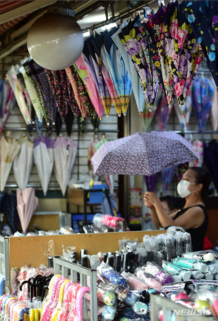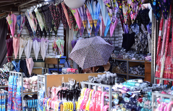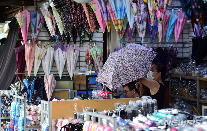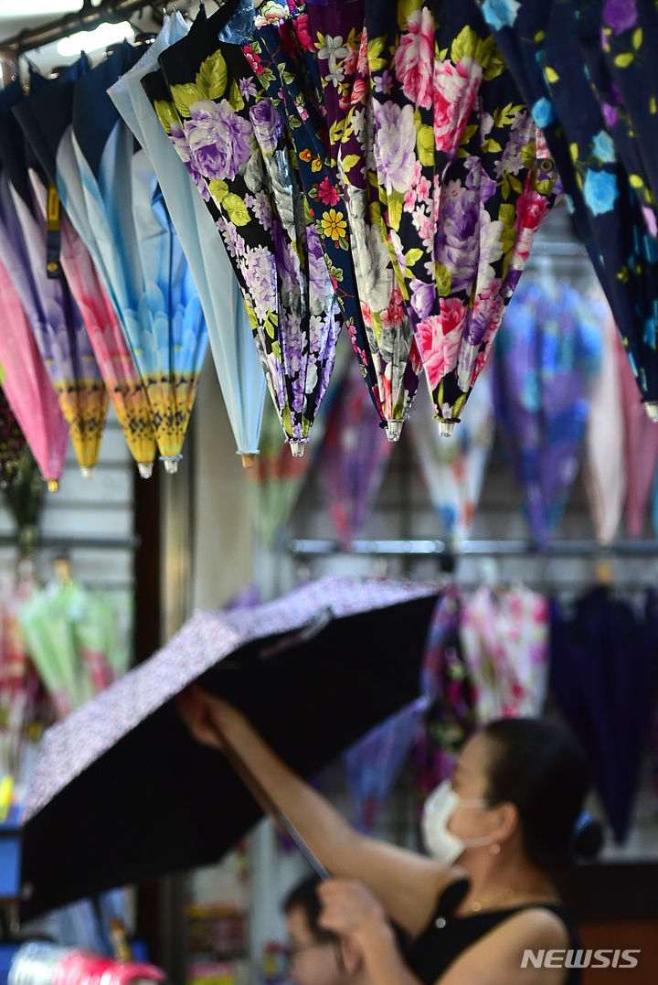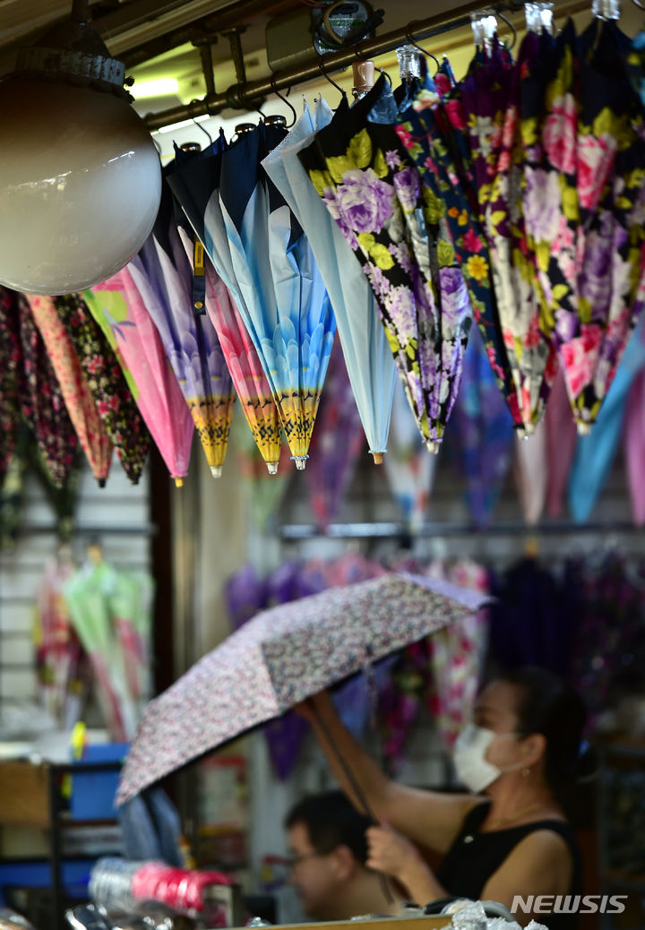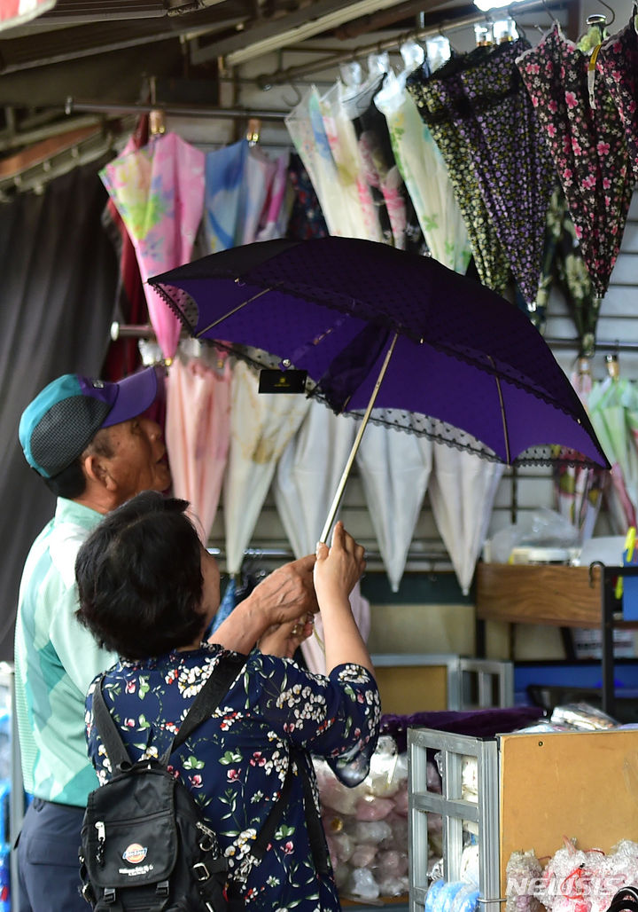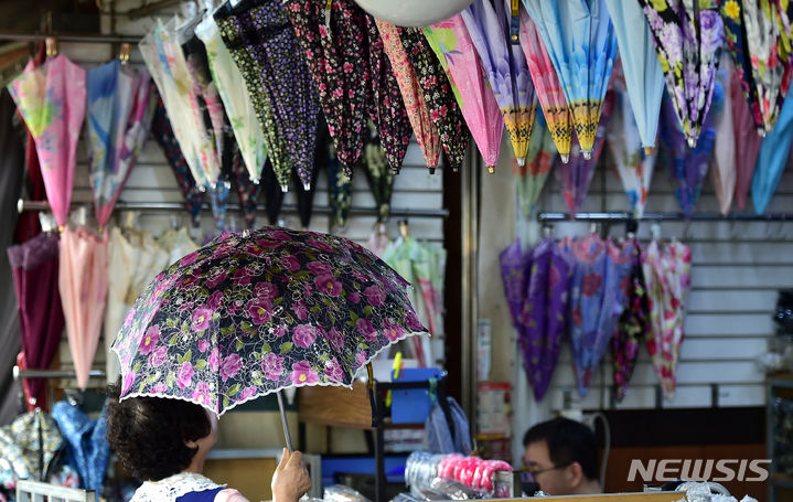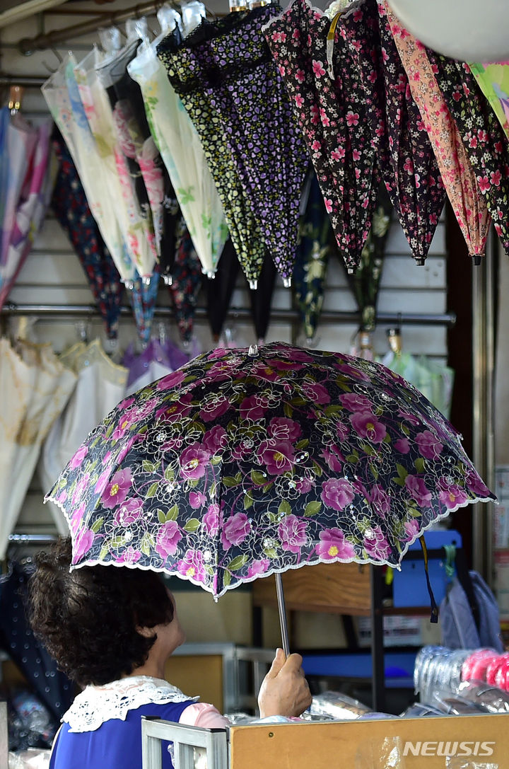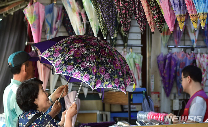 連日猛暑が続いている4日午後、大邱市中区の西門市場にある日傘店で、日傘を選ぶ市民の様子。
