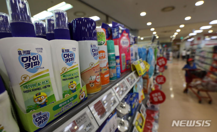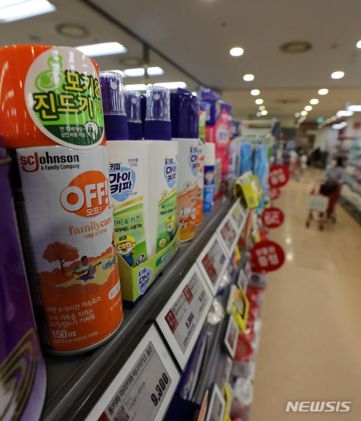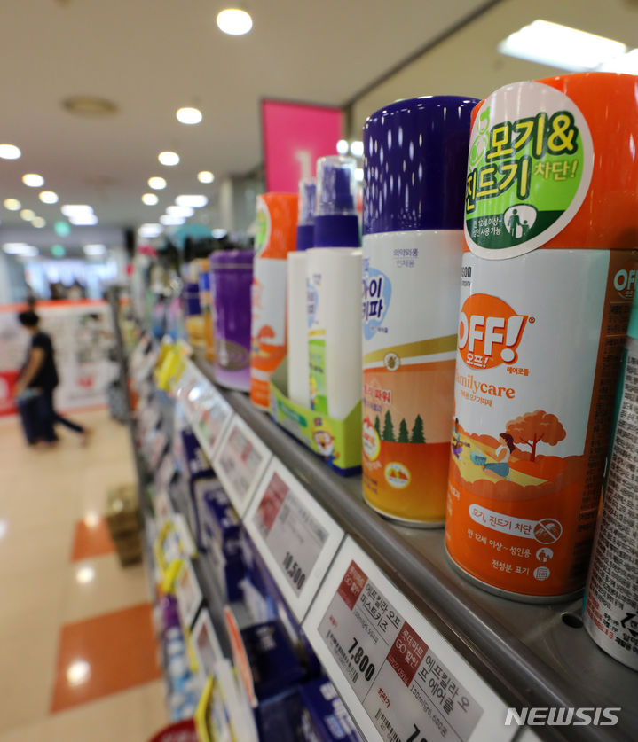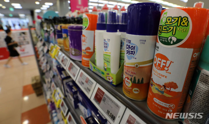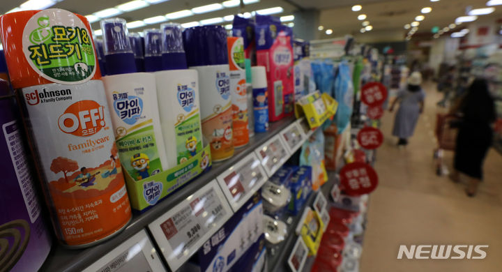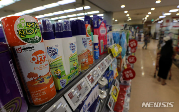今月3日に疾病管理庁が韓国各地にマラリア警報を発令し、虫除け剤の使用を勧告したことに伴って、虫除けスプレーなどの需要が増えるものとみられる。写真は4日午後、ソウル市内の大手スーパーに並べられた虫除け剤の様子。