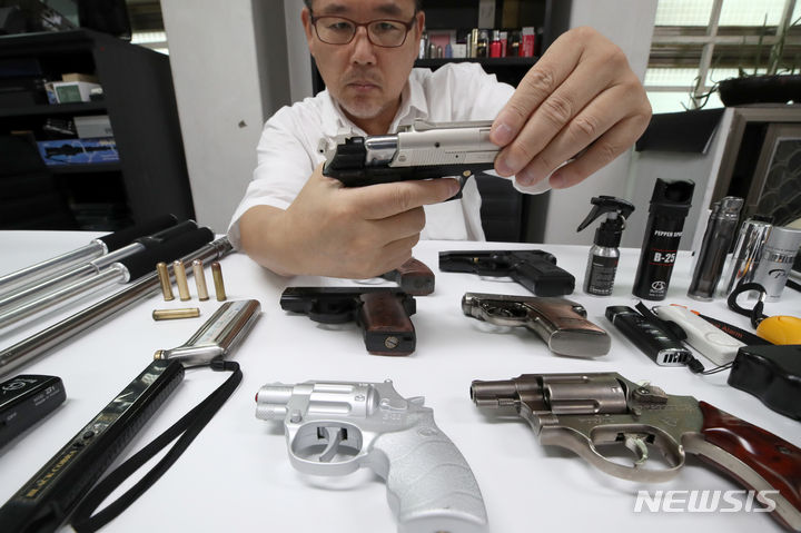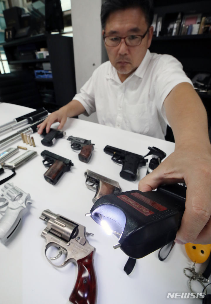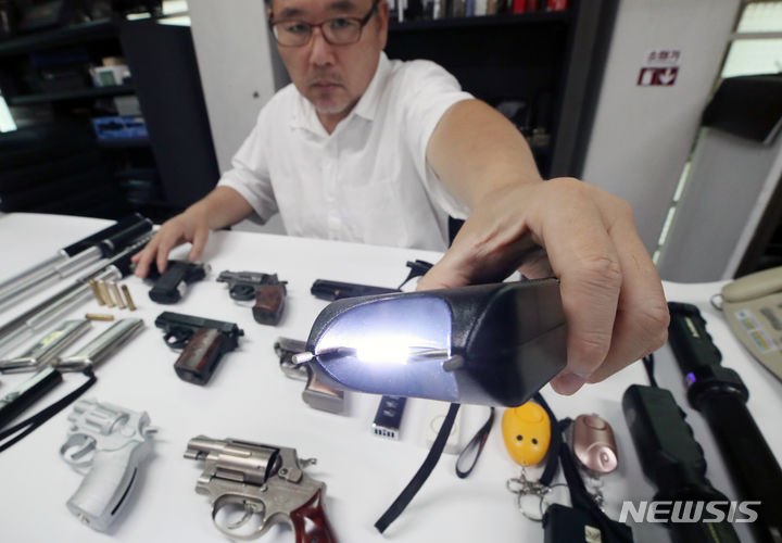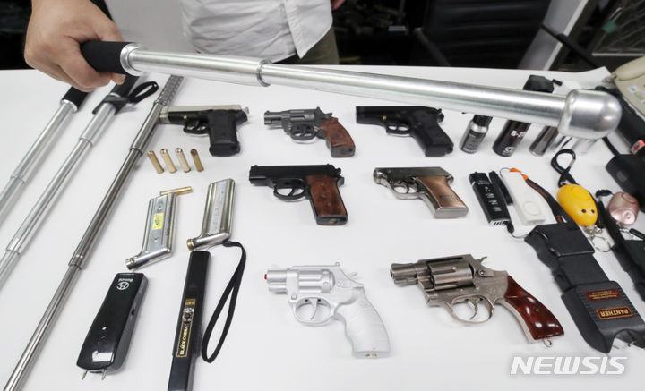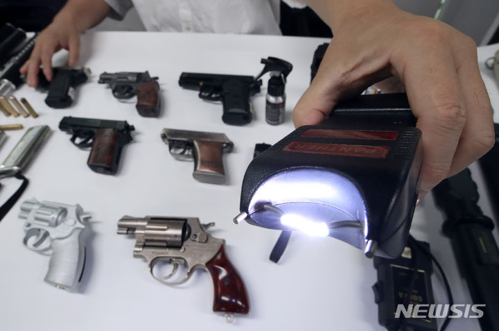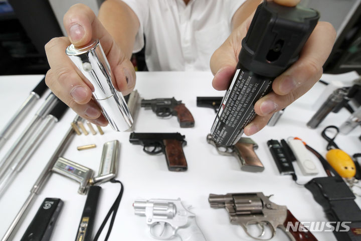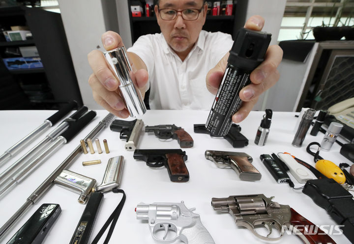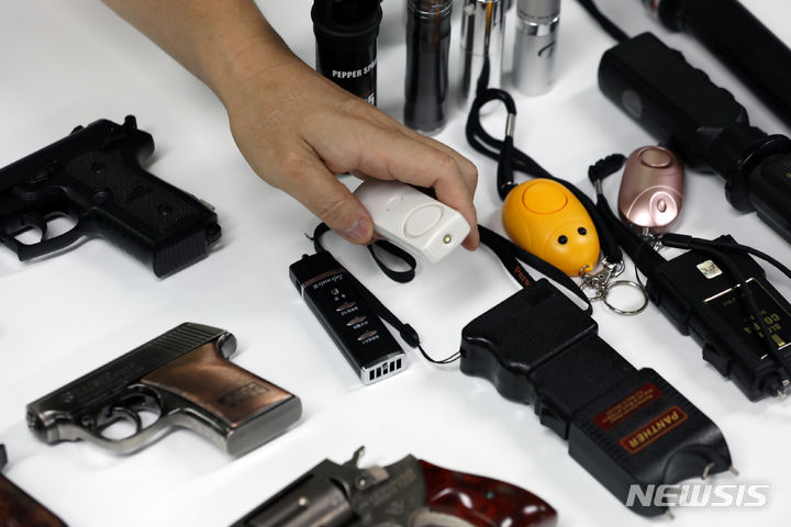【NEWSIS】刃物による通り魔事件や殺人予告などが相次いで発生し国民の不安が高まる中、護身用品を買い求める人が増えている。写真は6日、ソウル市瑞草区の護身用品販売店「大韓安全公社」の各種護身用品。