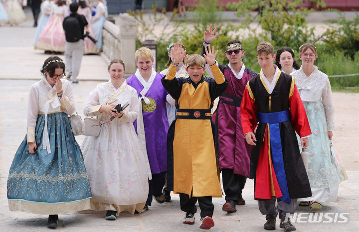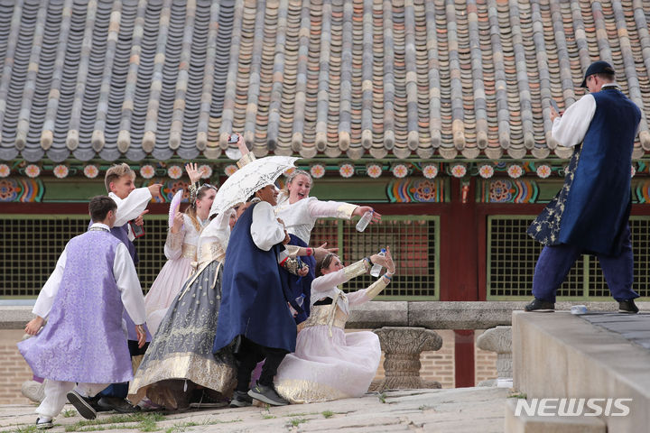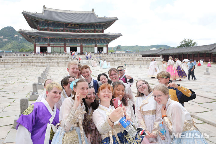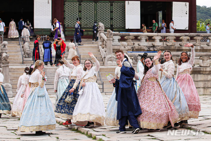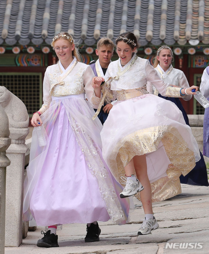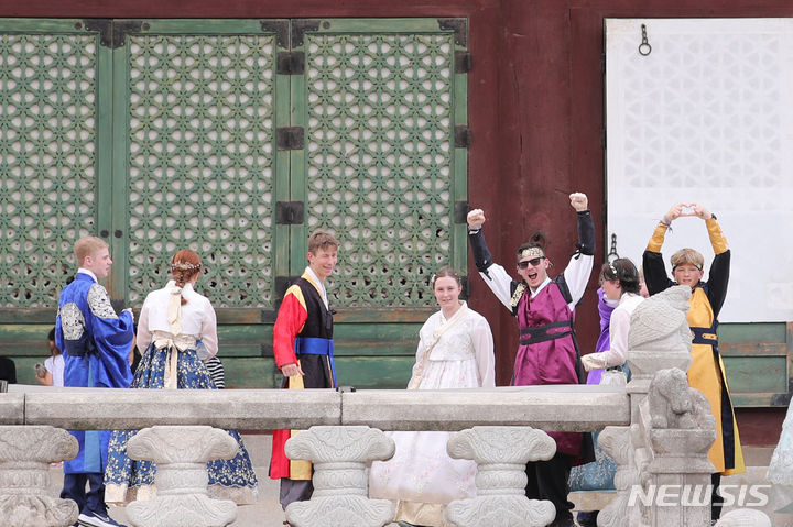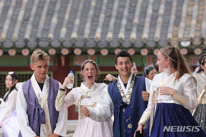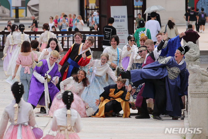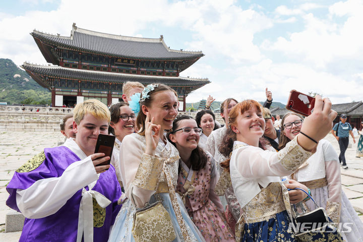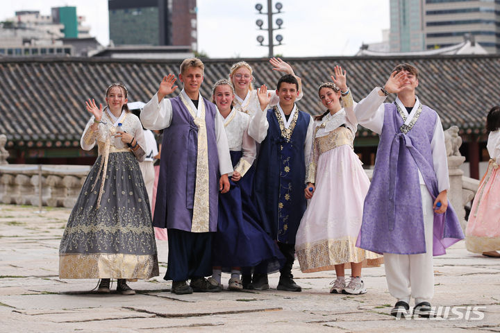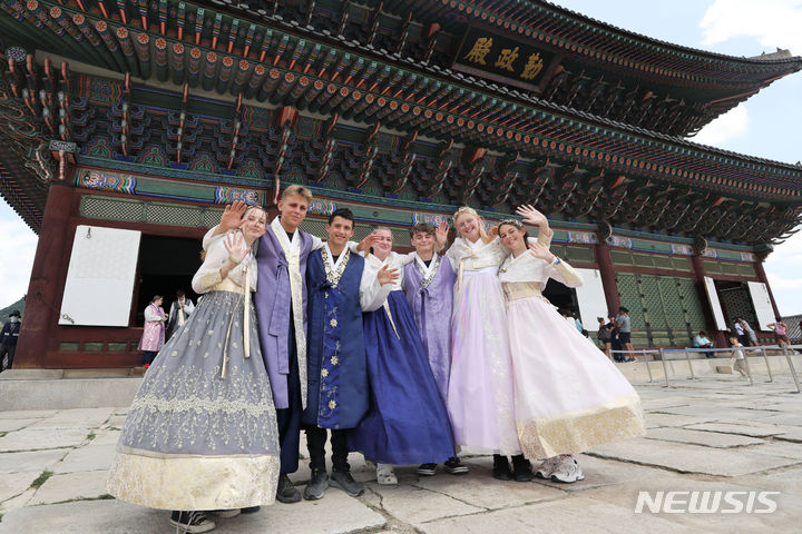 2023セマングム世界スカウト・ジャンボリーから早期退営した英国スカウト隊員らが7日午前、ソウル市鍾路区の景福宮で韓服を着て観光をしている様子。