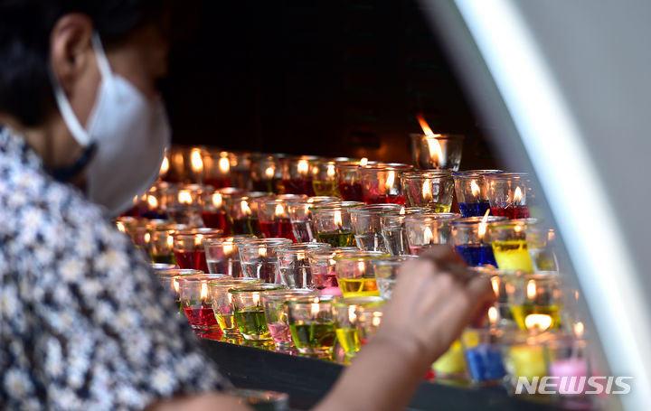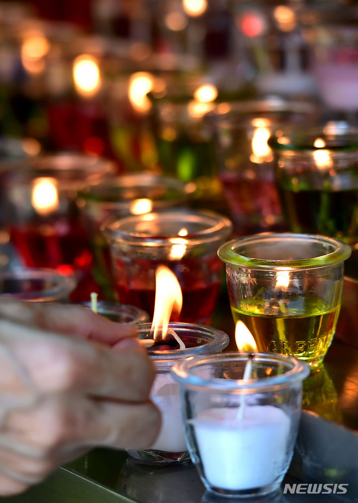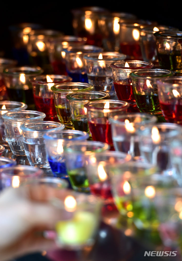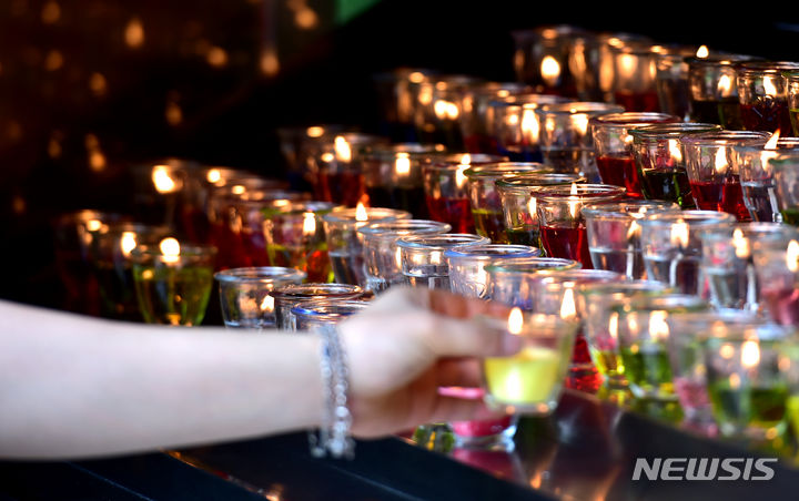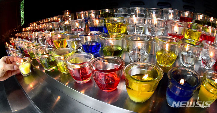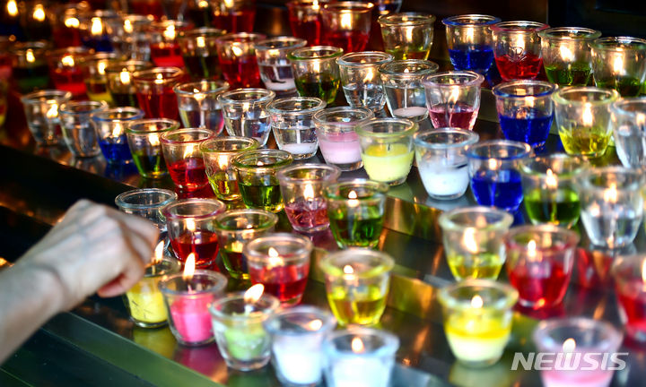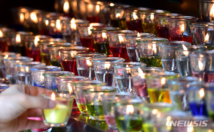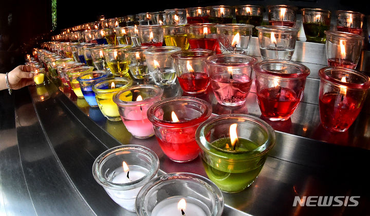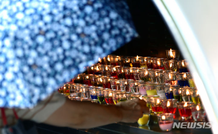 2024年度大学修学能力試験(修能。大学入学共通テストに相当)100日をあすに控えた7日午後、大邱市中区の天主教大邱大教区聖母堂では、受験生の子を持つ保護者らが修能高得点を祈ってろうそくを灯していた。