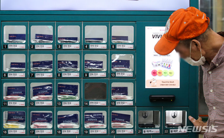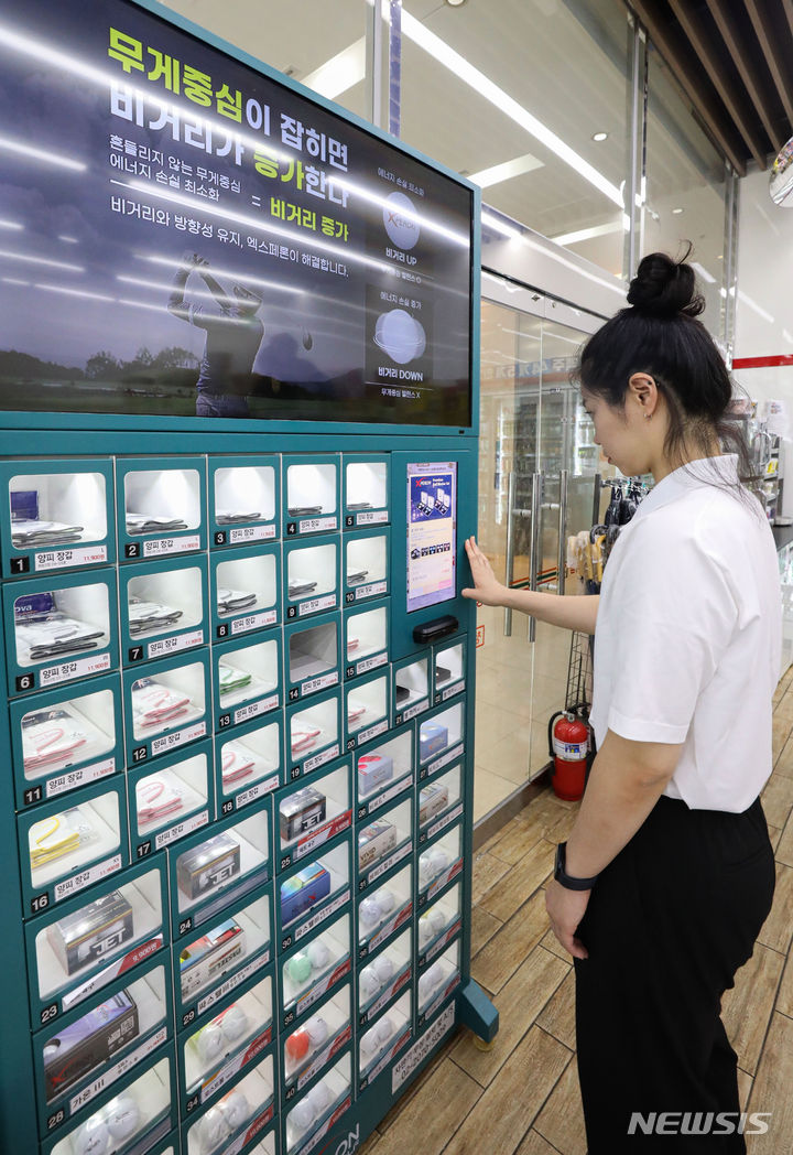 ソウル市内のコンビニエンスストア「セブン-イレブン」の店舗で9日午前、関係者がゴルフ用品の自動販売機を試していた。セブン-イレブンはゴルフ用品ブランド「XPERON」とタッグを組み、ゴルフボールやグローブなどを販売する。