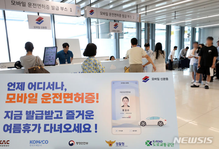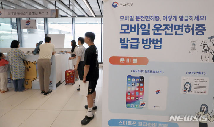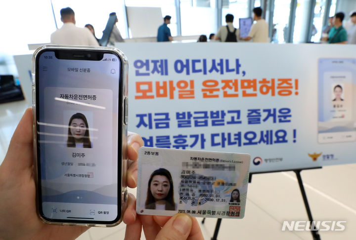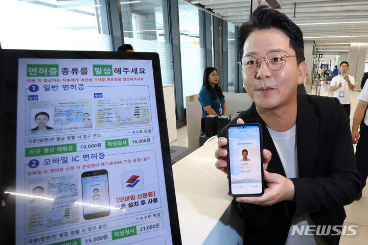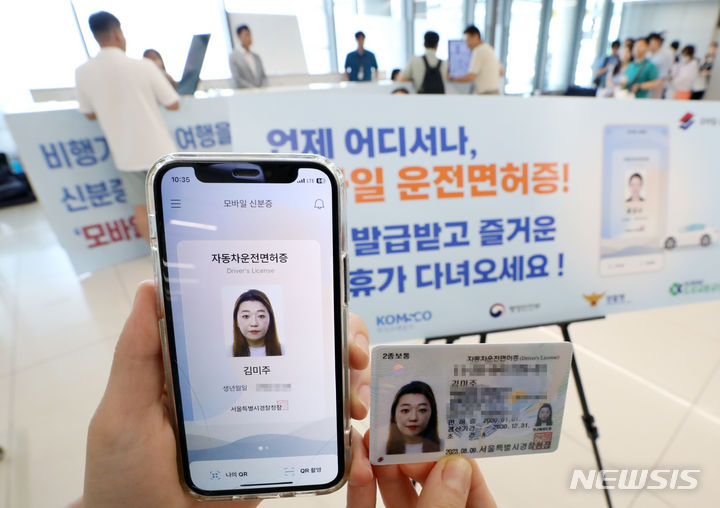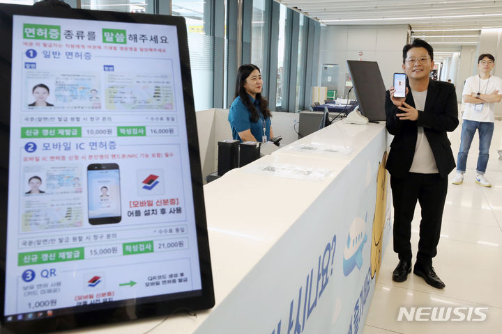 9日午前、ソウル市江西区の金浦空港国内線庁舎で開かれたモバイル運転免許証無料発給イベントにて、発給を受けた市民がモバイル運転免許証を見せてくれた。