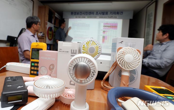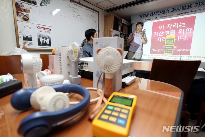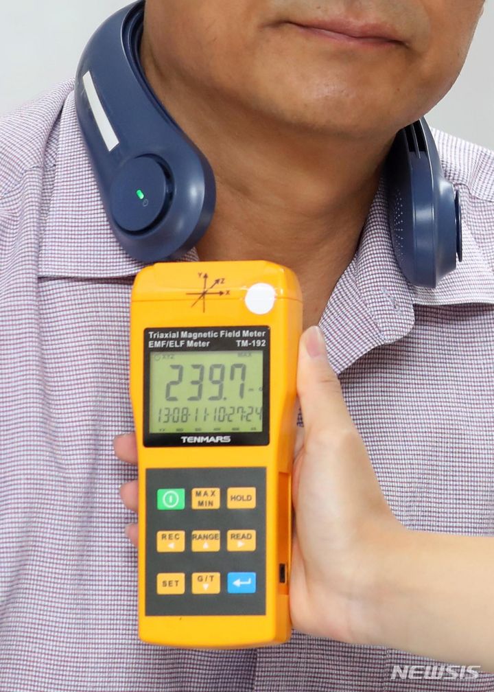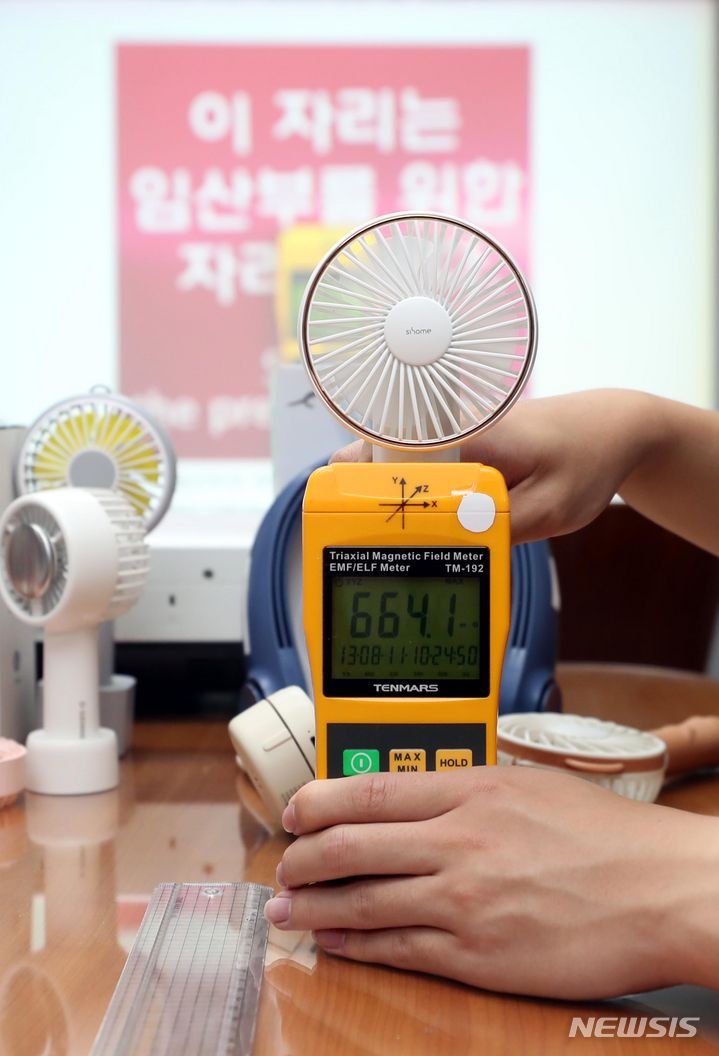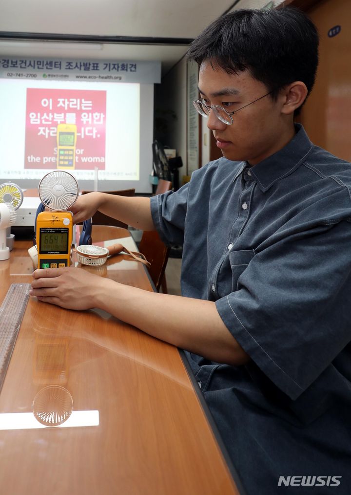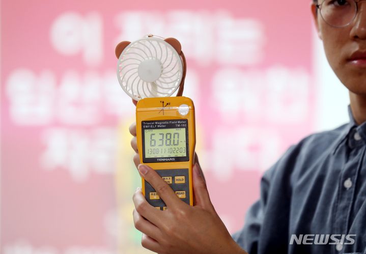 【NEWSIS】11日午前、ソウル市鍾路区の環境保健市民センターで、「生活中の電磁波発生および露出実態調査」の発表記者会見が行われた。写真はハンディファン(携帯扇風機)の電磁波測定結果を示す同センターの関係者。