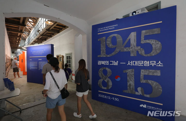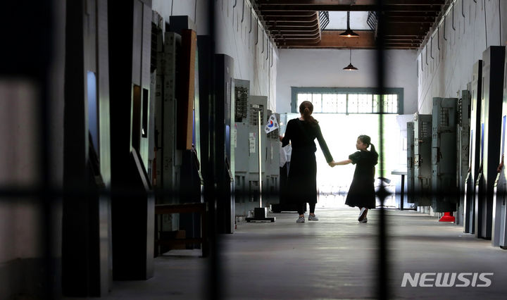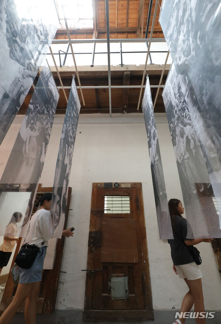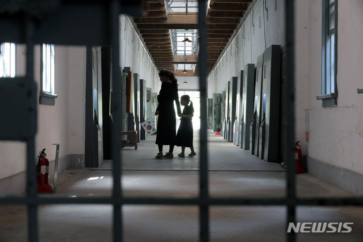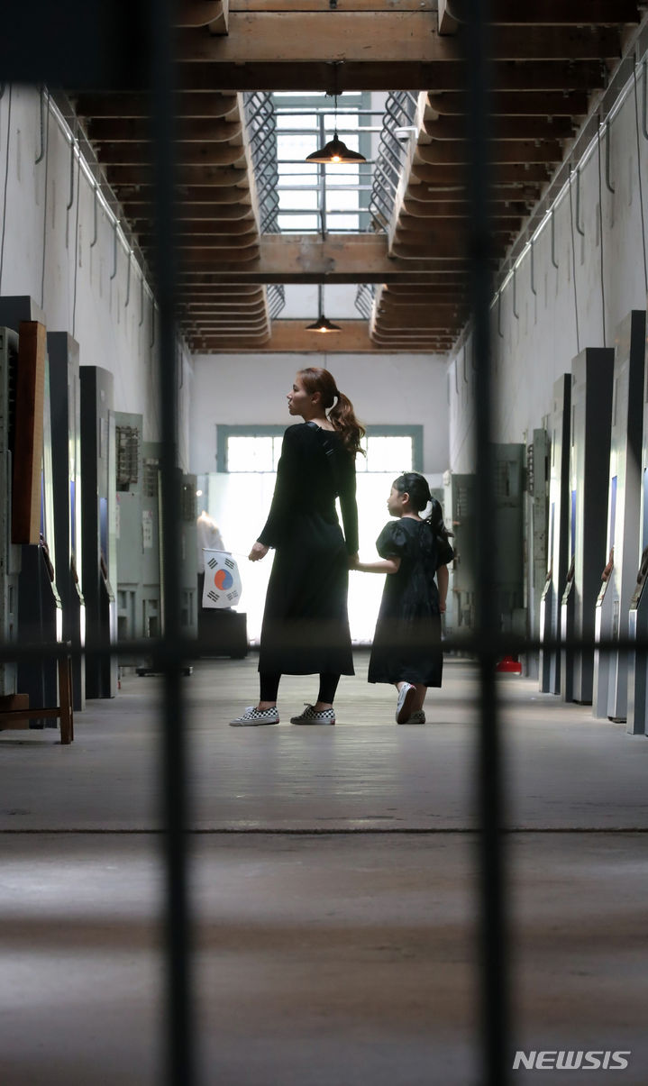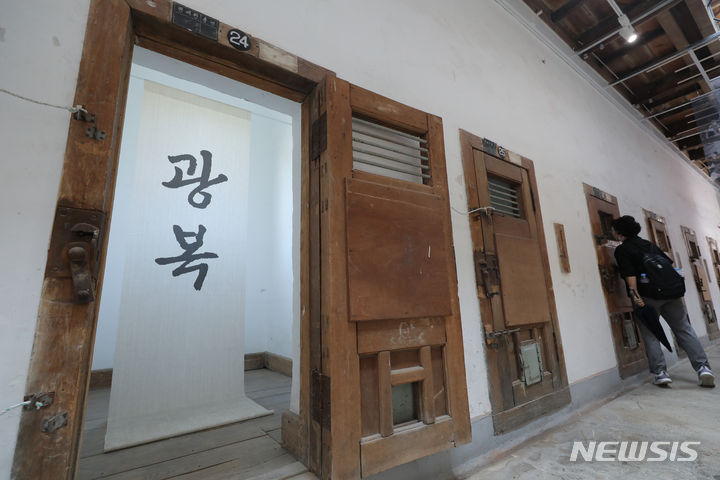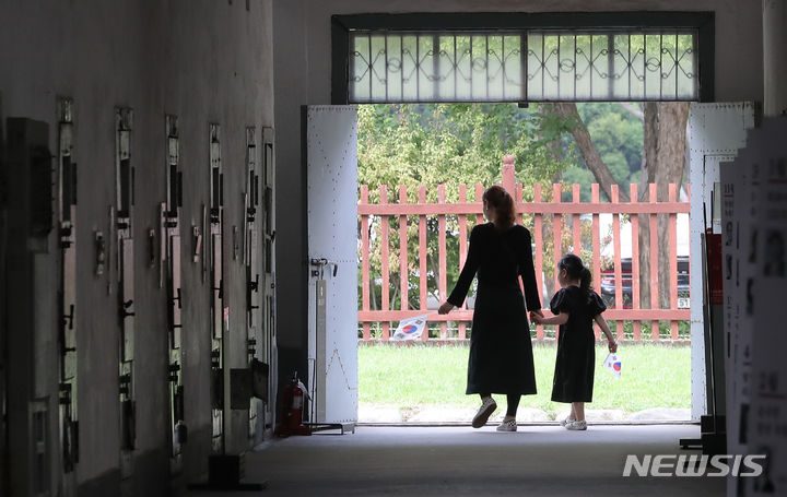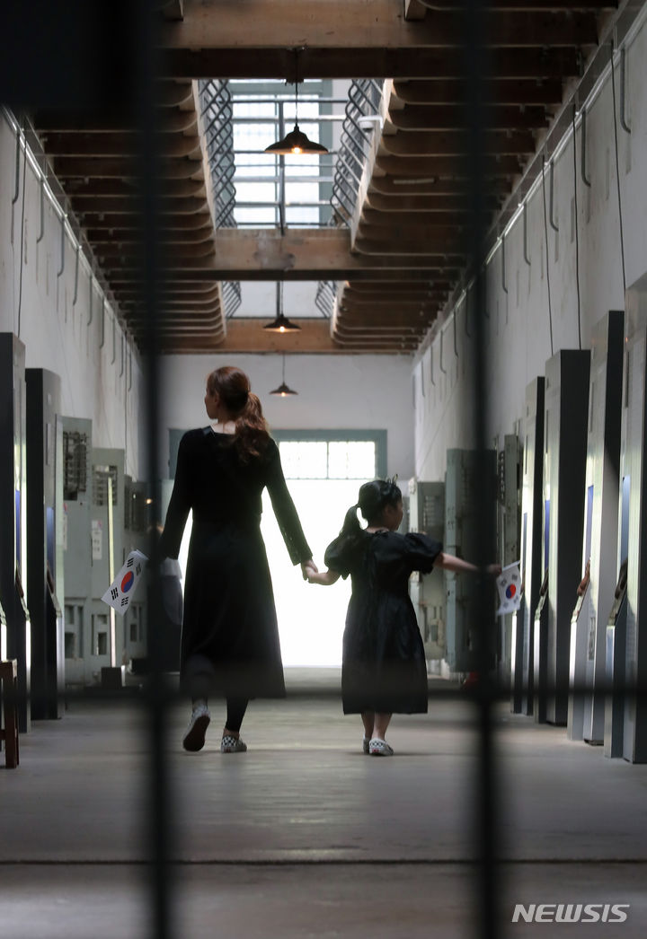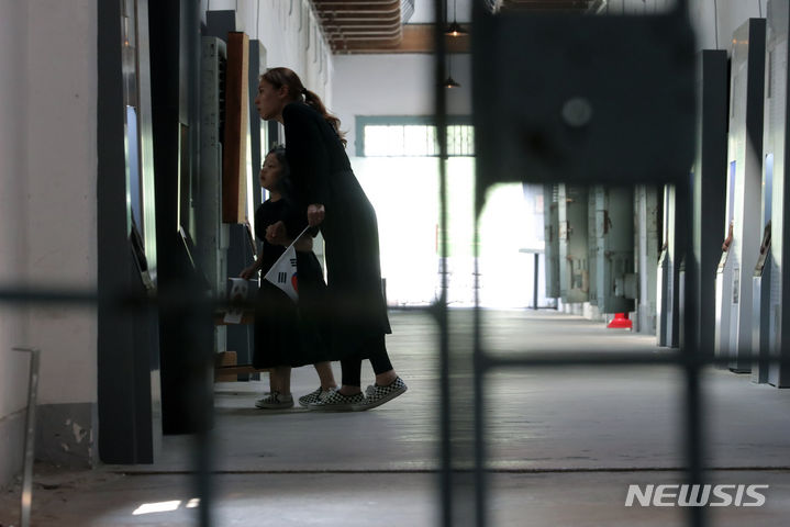 78周年光復節をあすに控えた14日午前、ソウル市西大門区の西大門刑務所歴史館を訪れた市民が、独立運動家らが収監されていた獄舎を見て回っている。