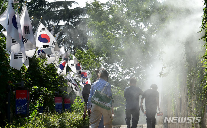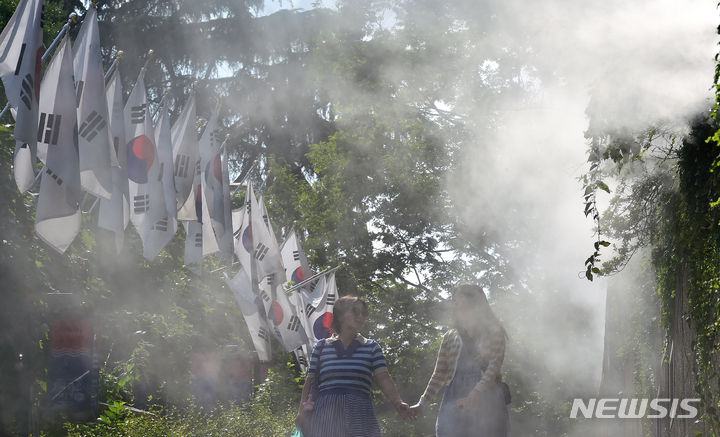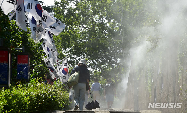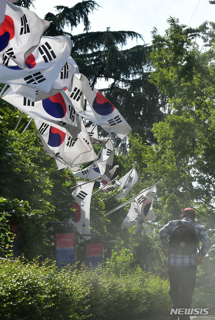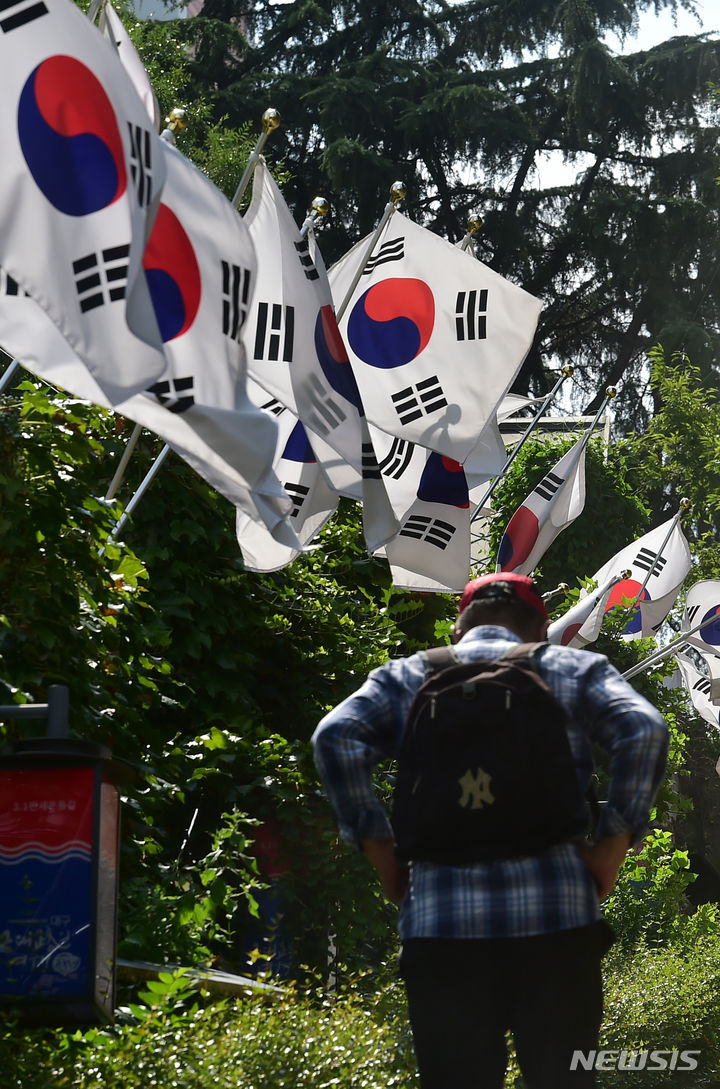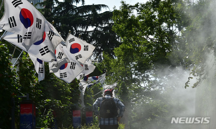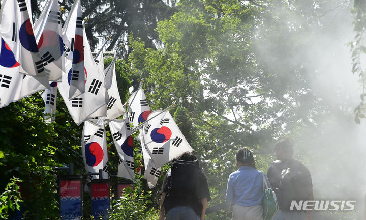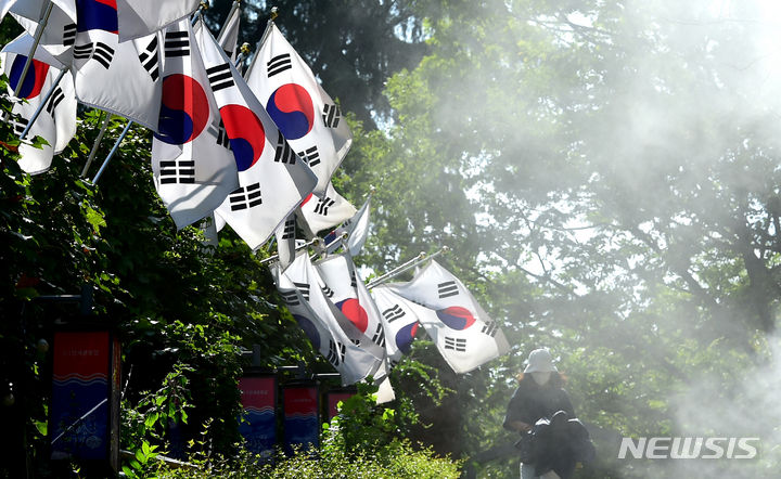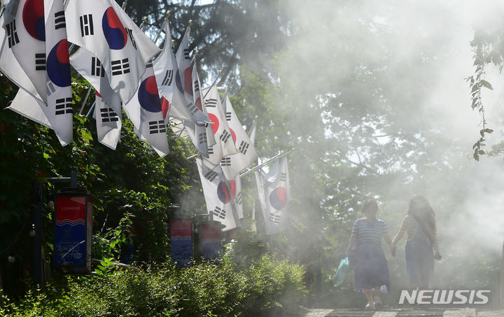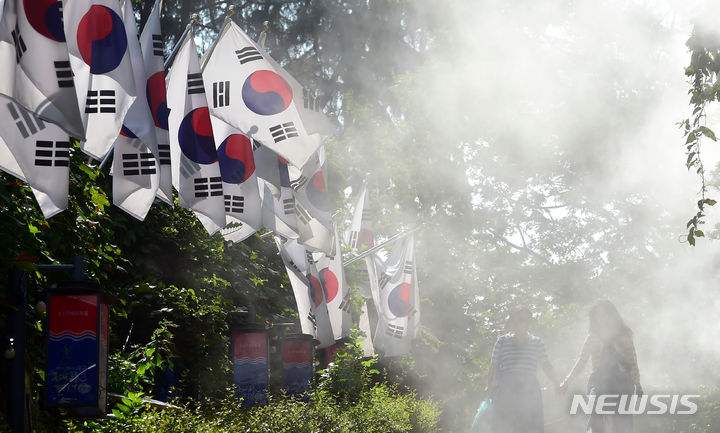 78周年光復節をあすに控えた14日午後、大邱市中区東山洞の「青蘿の丘」に設置された太極旗の下を歩く市民。
