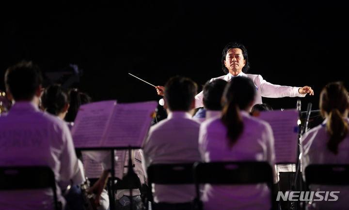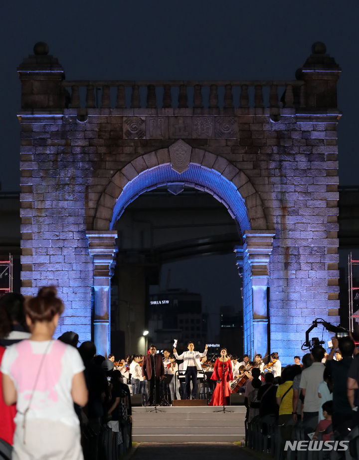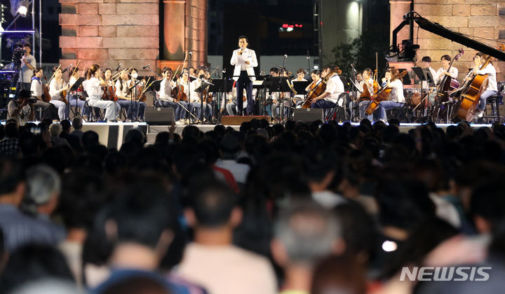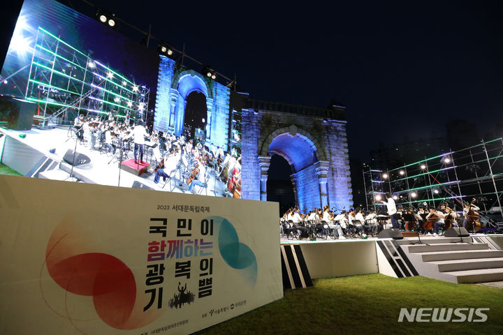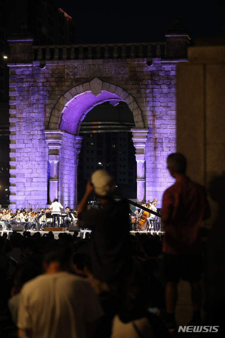 ソウル市西大門区の独立門野外特設ステージで14日午後、光復節(日本による植民地支配からの解放記念日、8月15日)前夜音楽会が開催され、指揮者のハム・シンイクとオーケストラ「シンフォニーS.O.N.G」が「希望と喜びの歌」をテーマに公演を繰り広げた。