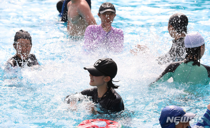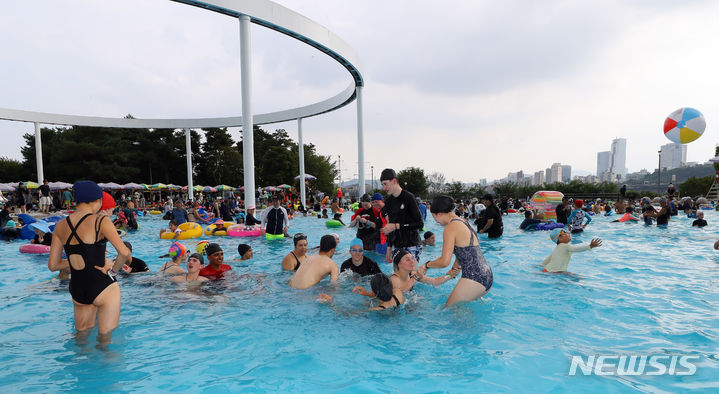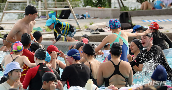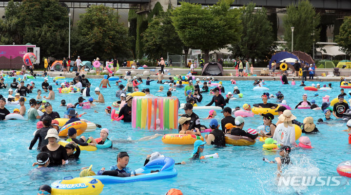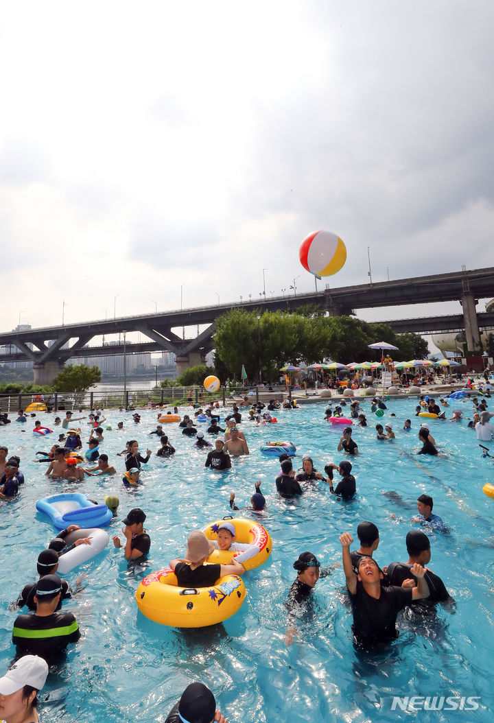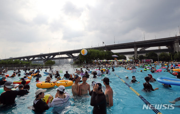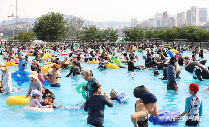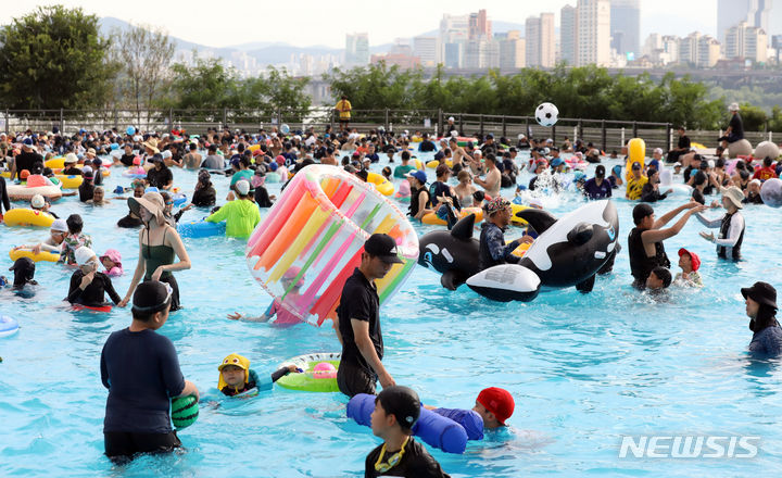 韓国各地に猛暑警報が発令された15日、ソウルのトゥクソム漢江公園のプールでは、訪れた人々が暑さを避けつつ水遊びを楽しんでいた。