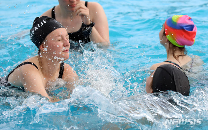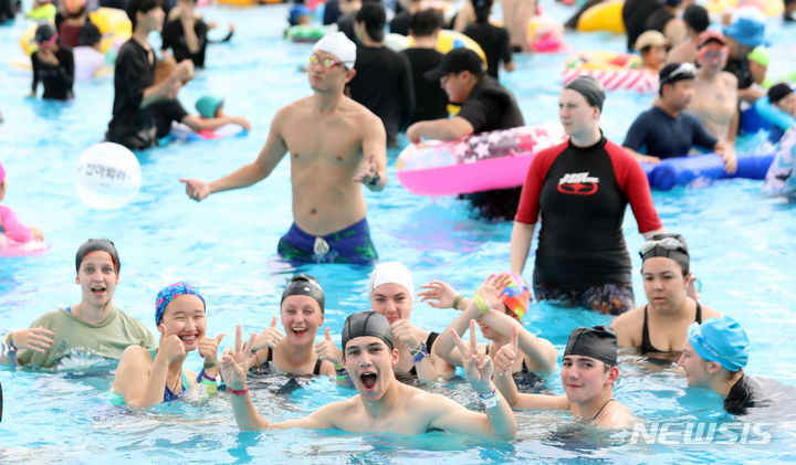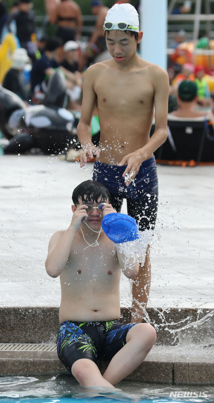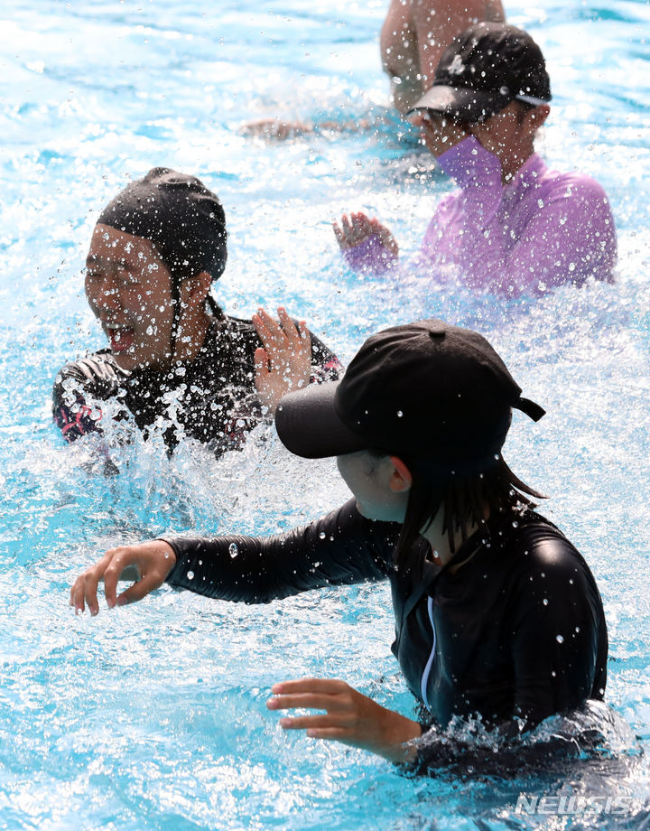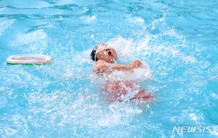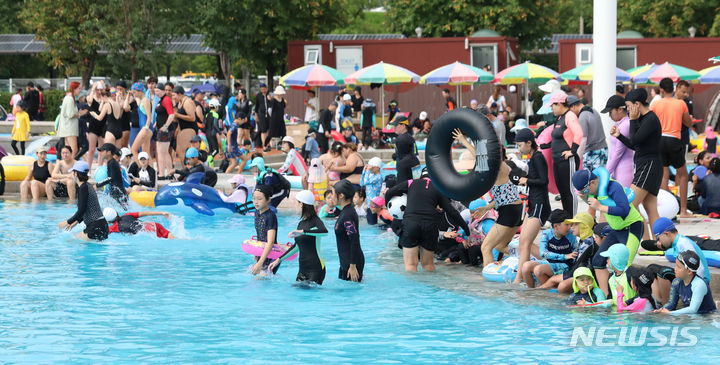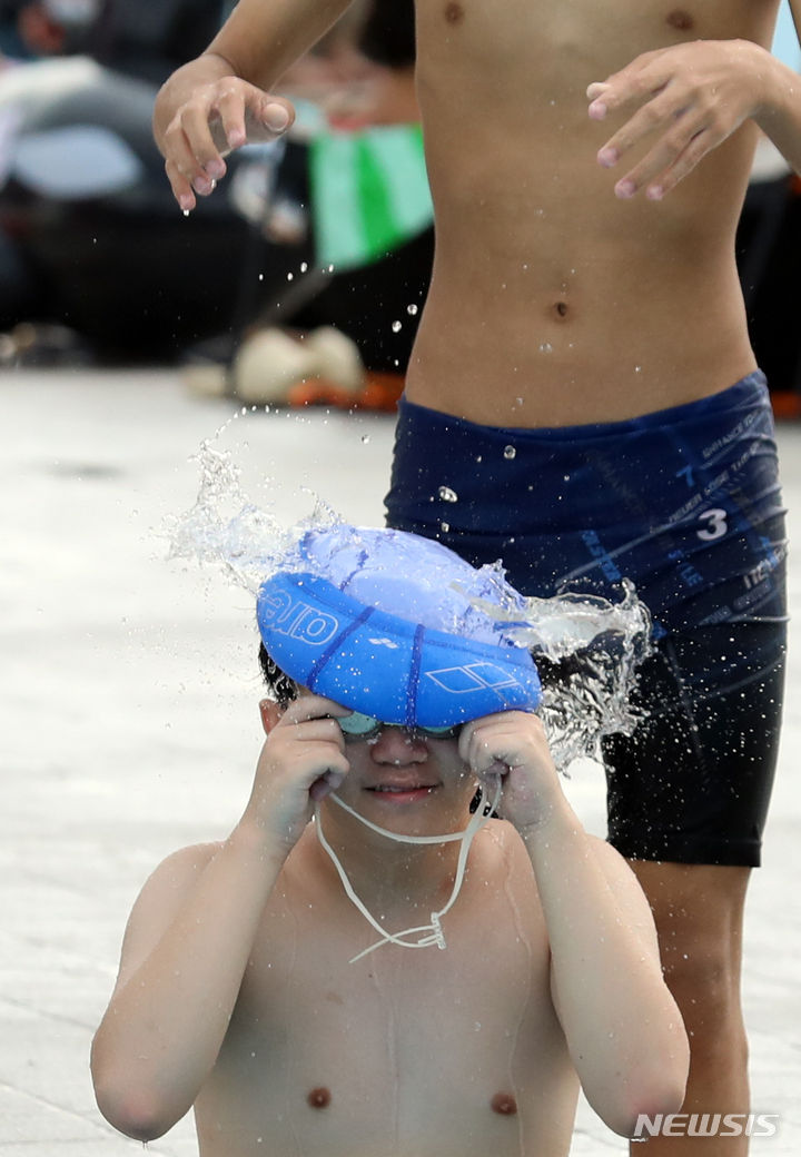 韓国各地に猛暑警報が発令された15日、ソウルのトゥクソム漢江公園のプールでは、訪れた人々が暑さを避けつつ水遊びを楽しんでいた。