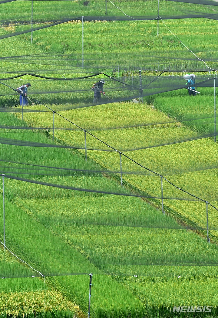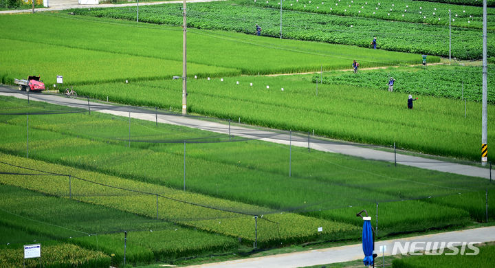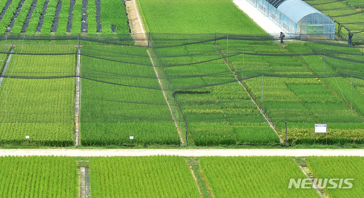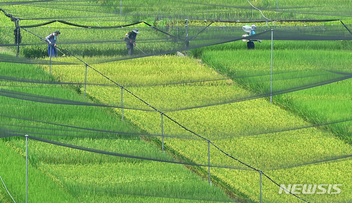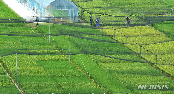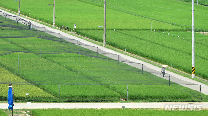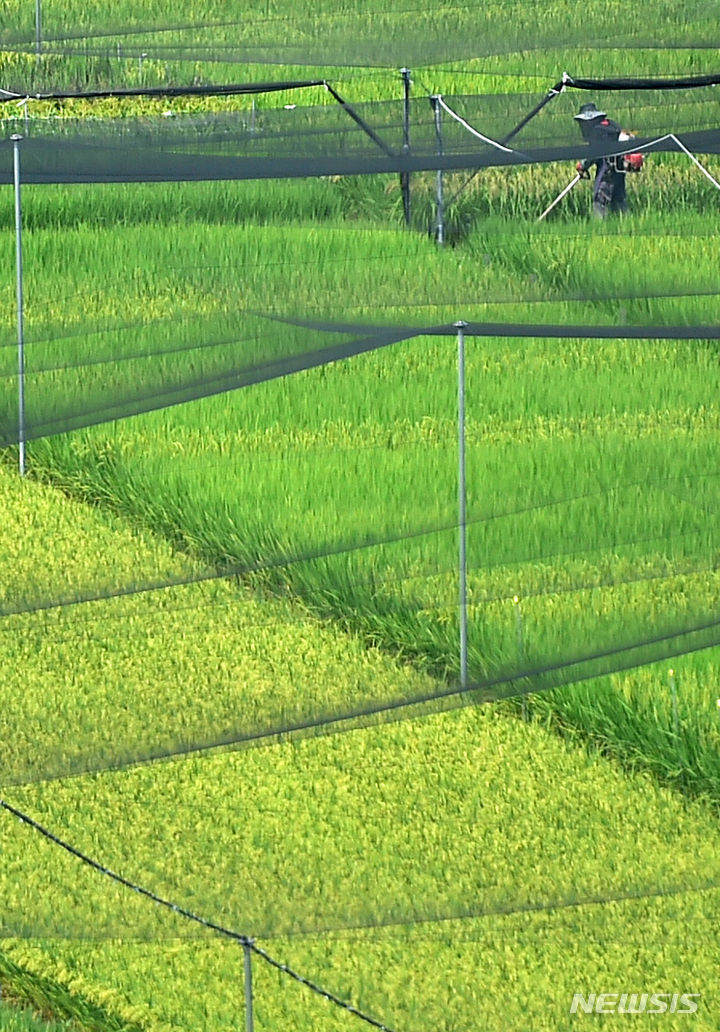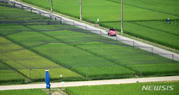 16日、大邱市北区鶴亭洞にある慶北農業技術院の試験栽培水田の上に、鳥害を防ぐ網が設置されている様子。