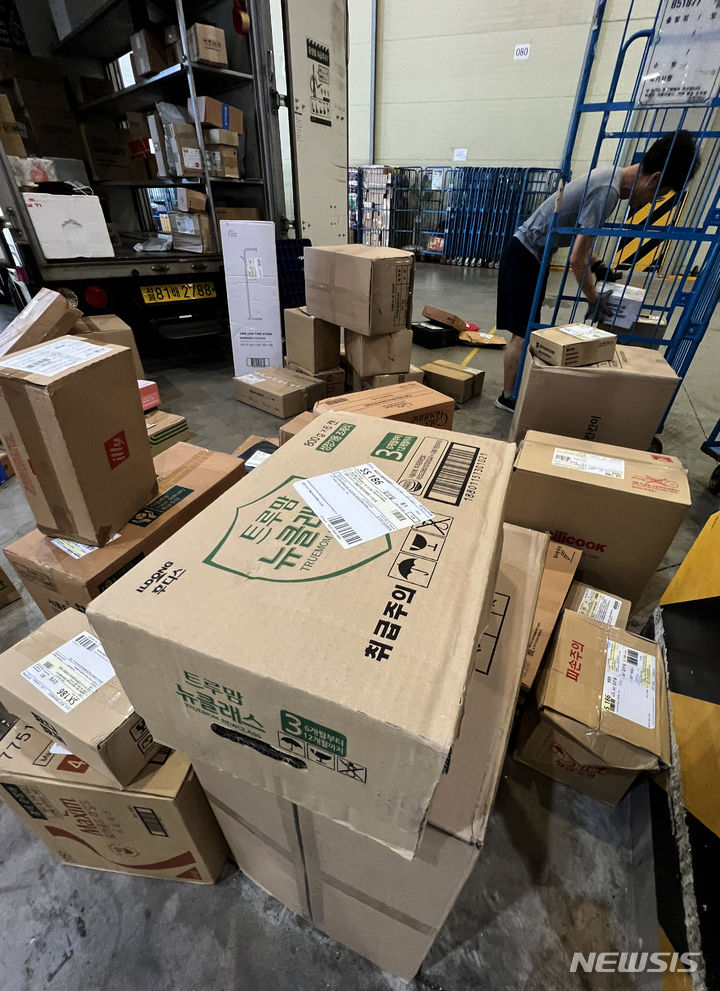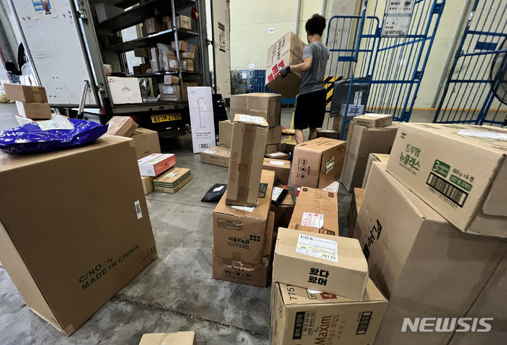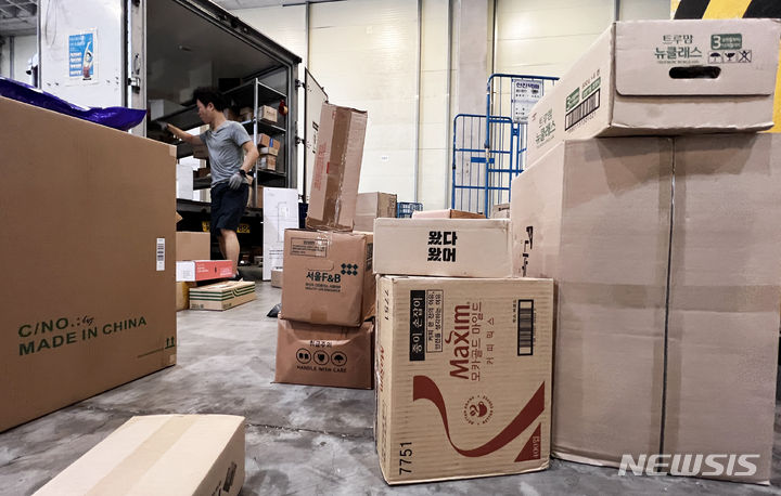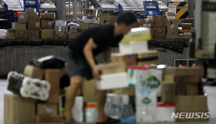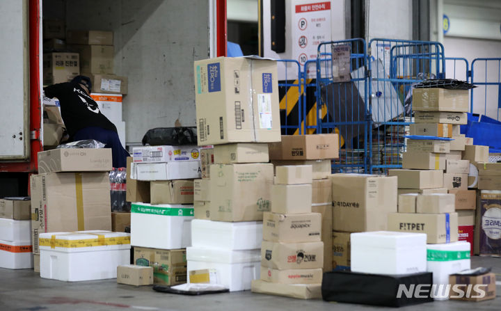 「宅配のない日」の連休が終わった16日午前、ソウル市松坡区の東南圏物流センターで、配送すべき荷物の箱を整理している宅配運転手の様子。