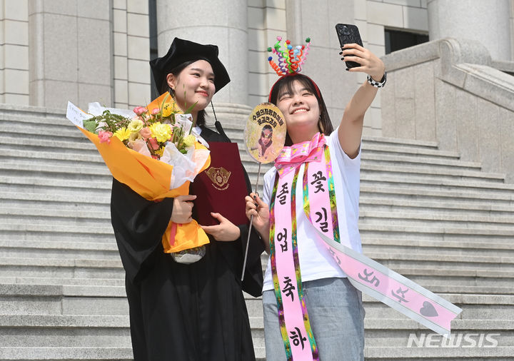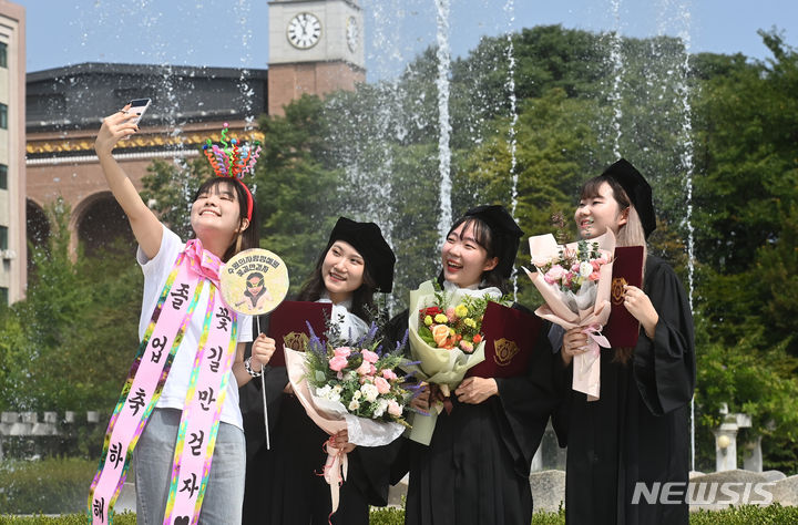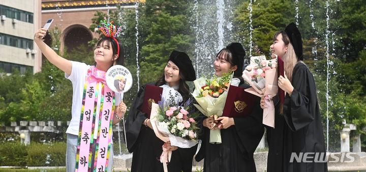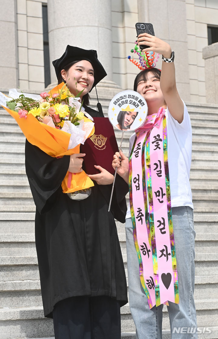 16日、京畿道竜仁市器興区の慶煕大学国際キャンパスで開かれた学位授与式で、卒業生らが記念撮影をして思い出を残している様子。